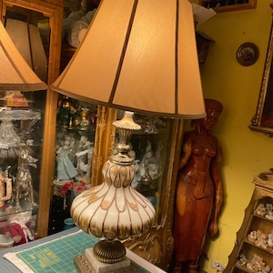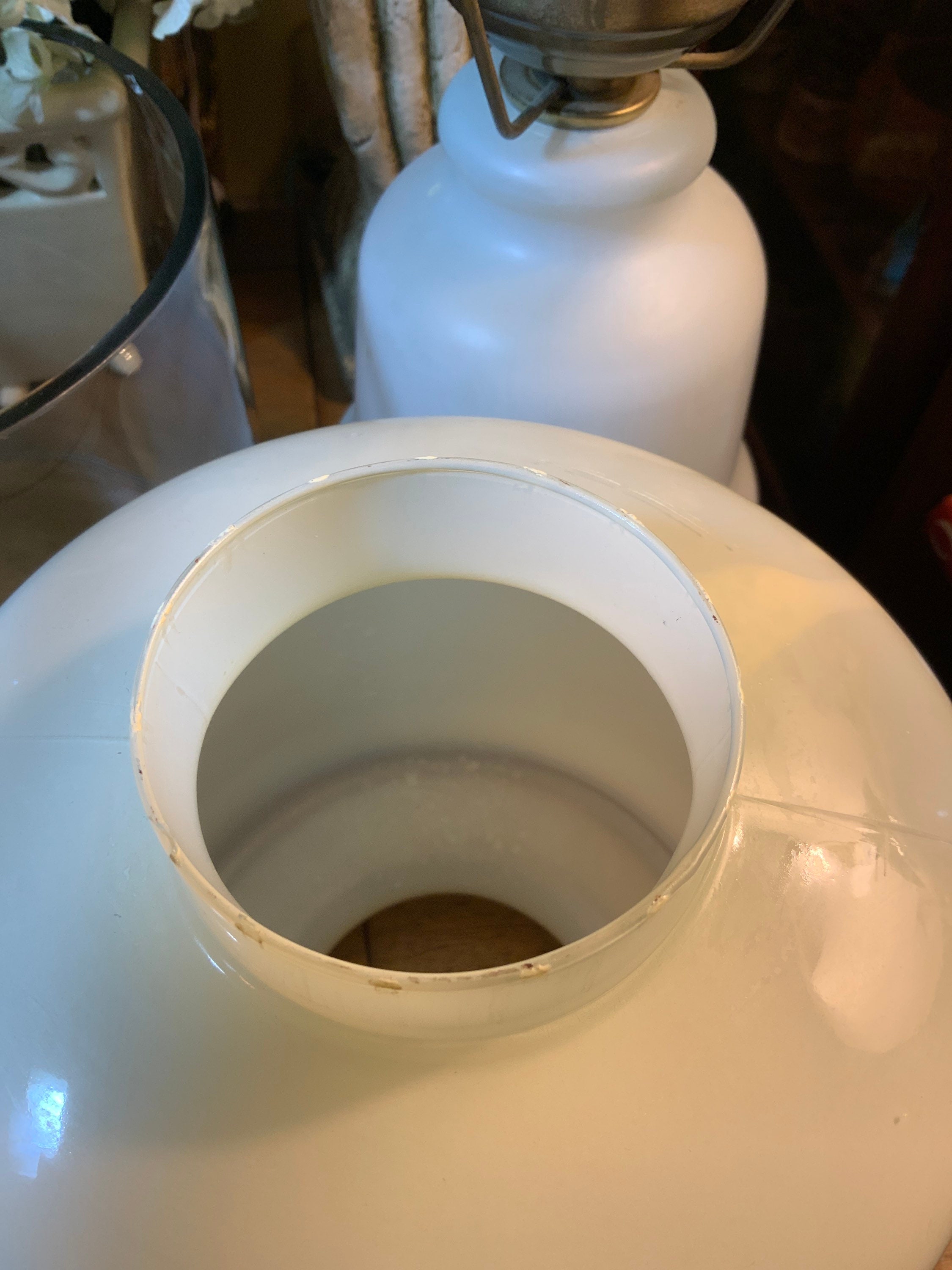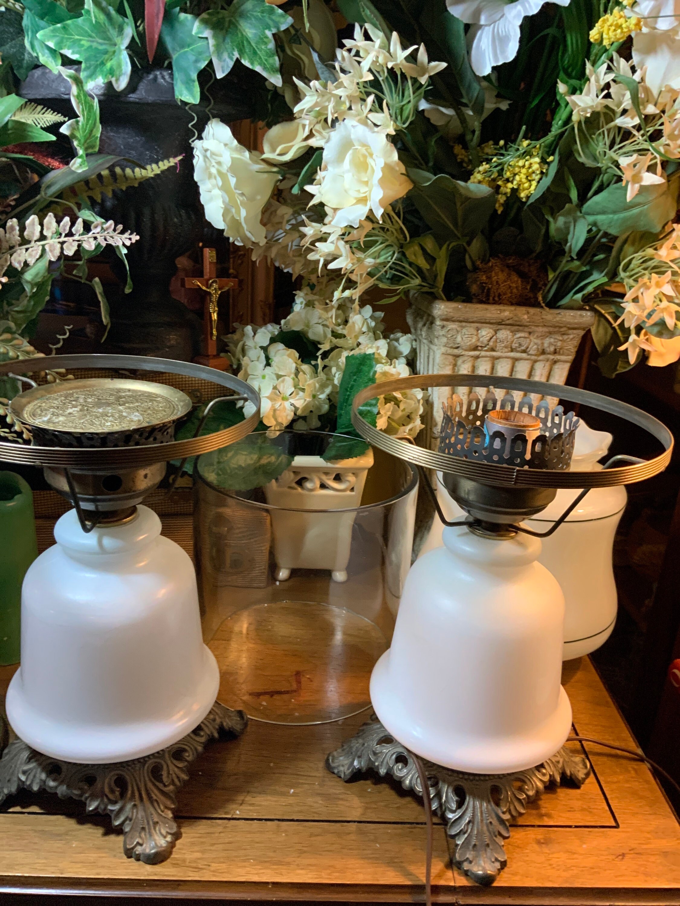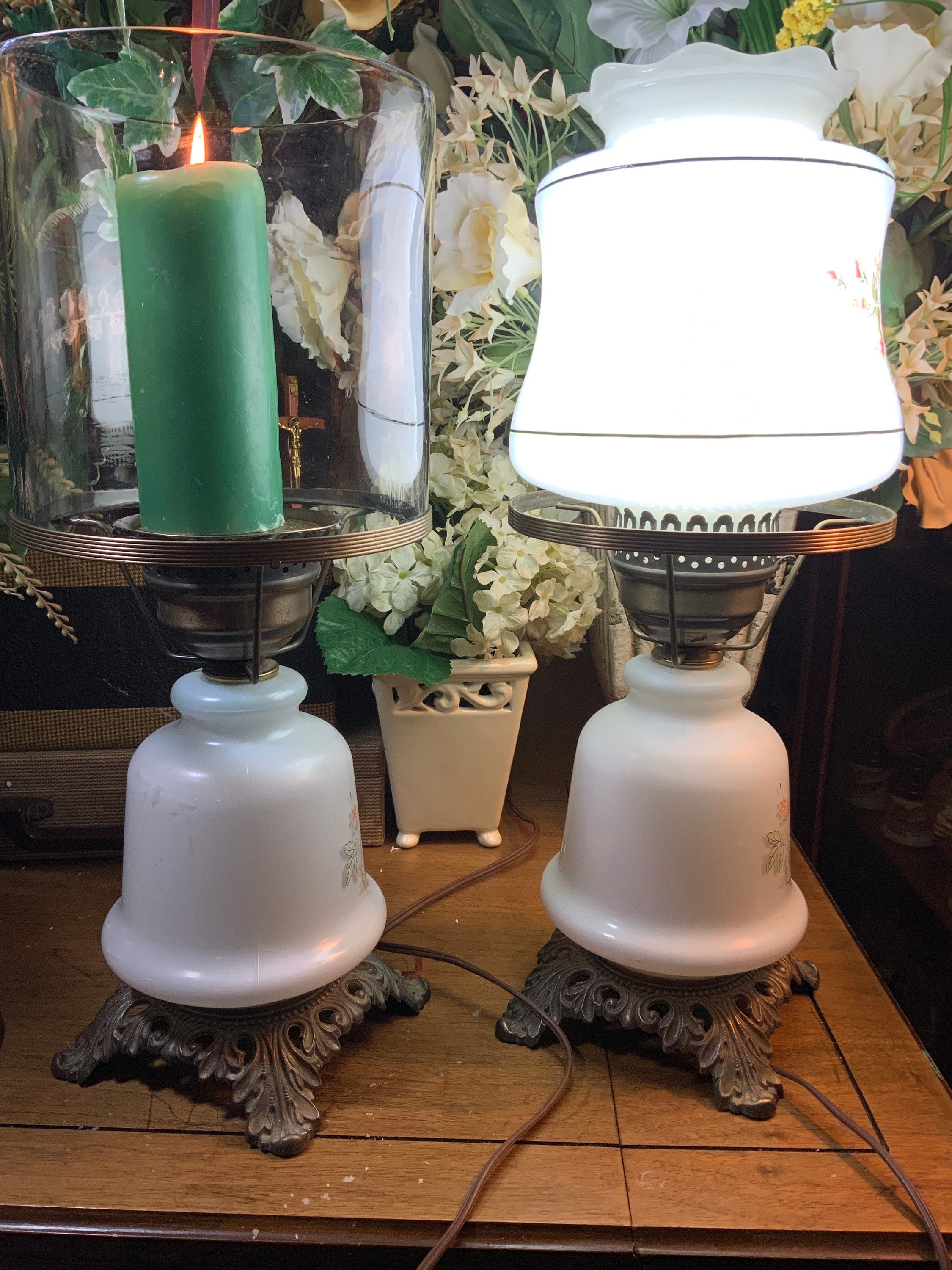 One milky white glass mid century lamp was repurposed into candle holder protected by heavy large hurricane clear glass cylinder open both ends,and the matching milky white glass lamp has hurricane milky white glass with hand painted pink roses and pink-white with gray yellow bud clematis flowers light green leaves with gray hairline to one side that fits 3” diameter shade holder and ruffle Rim, the original milky glass lamp body was also handpainted light green with gray hairline and rim with white blue petals with black hairline and yellow buds. Both have very ornate brass feet,ornate brass key and ornate ruffle top shade holder.