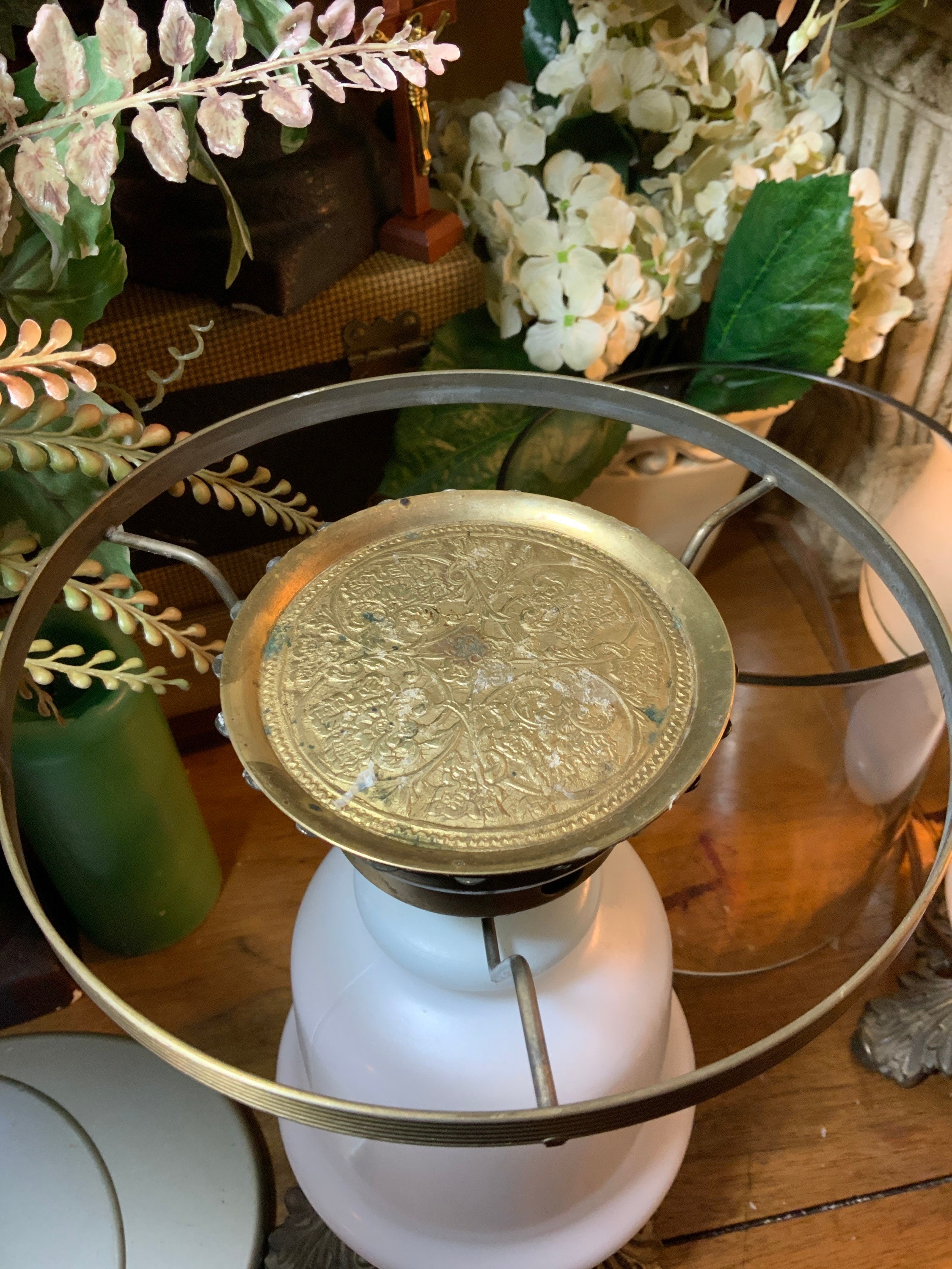 Listing for vintage retro repurposed milky glass and brass mid century lamps into milky glass hurricane lamp and matching candlelight holder with modern cylinder glass