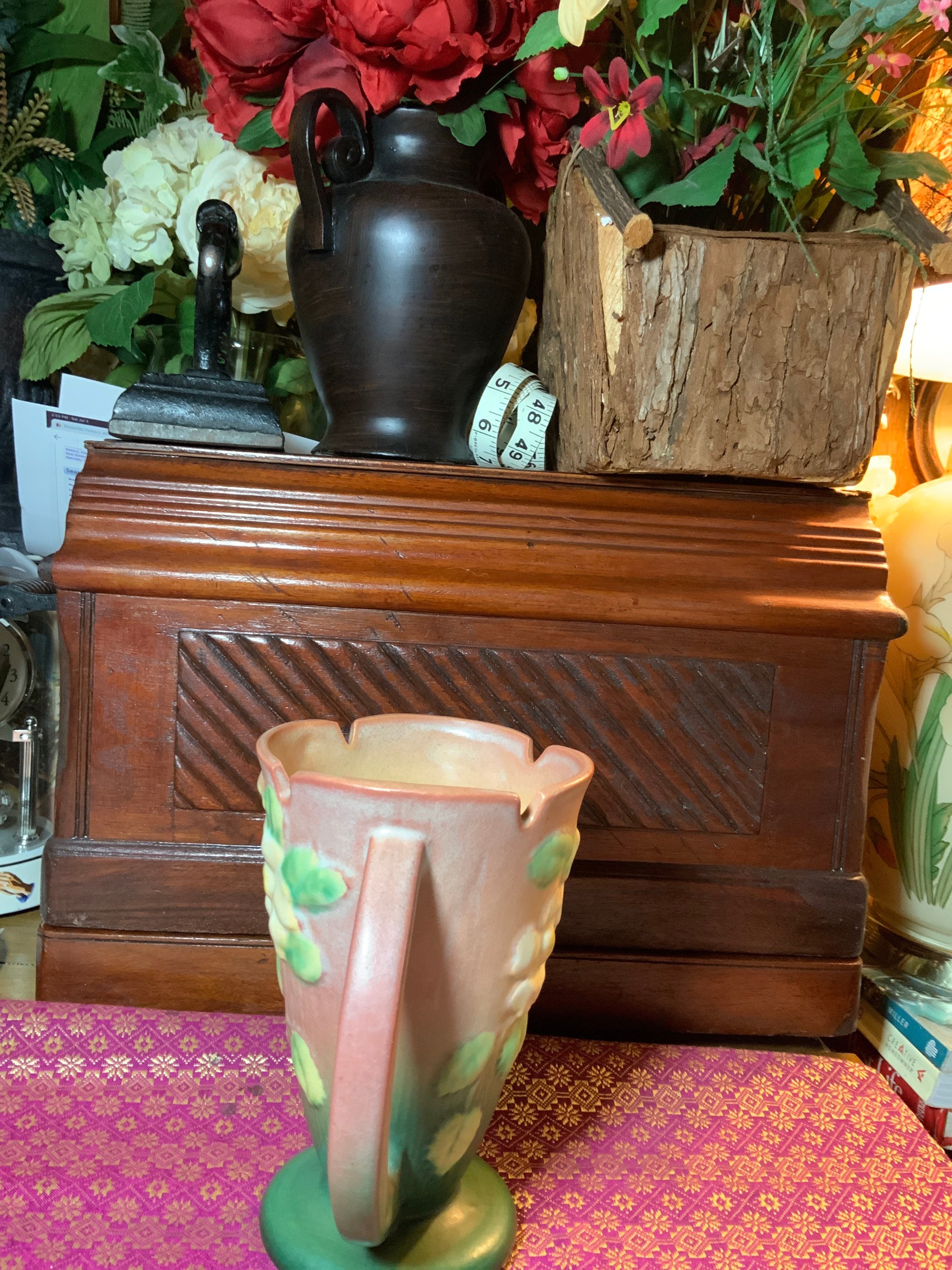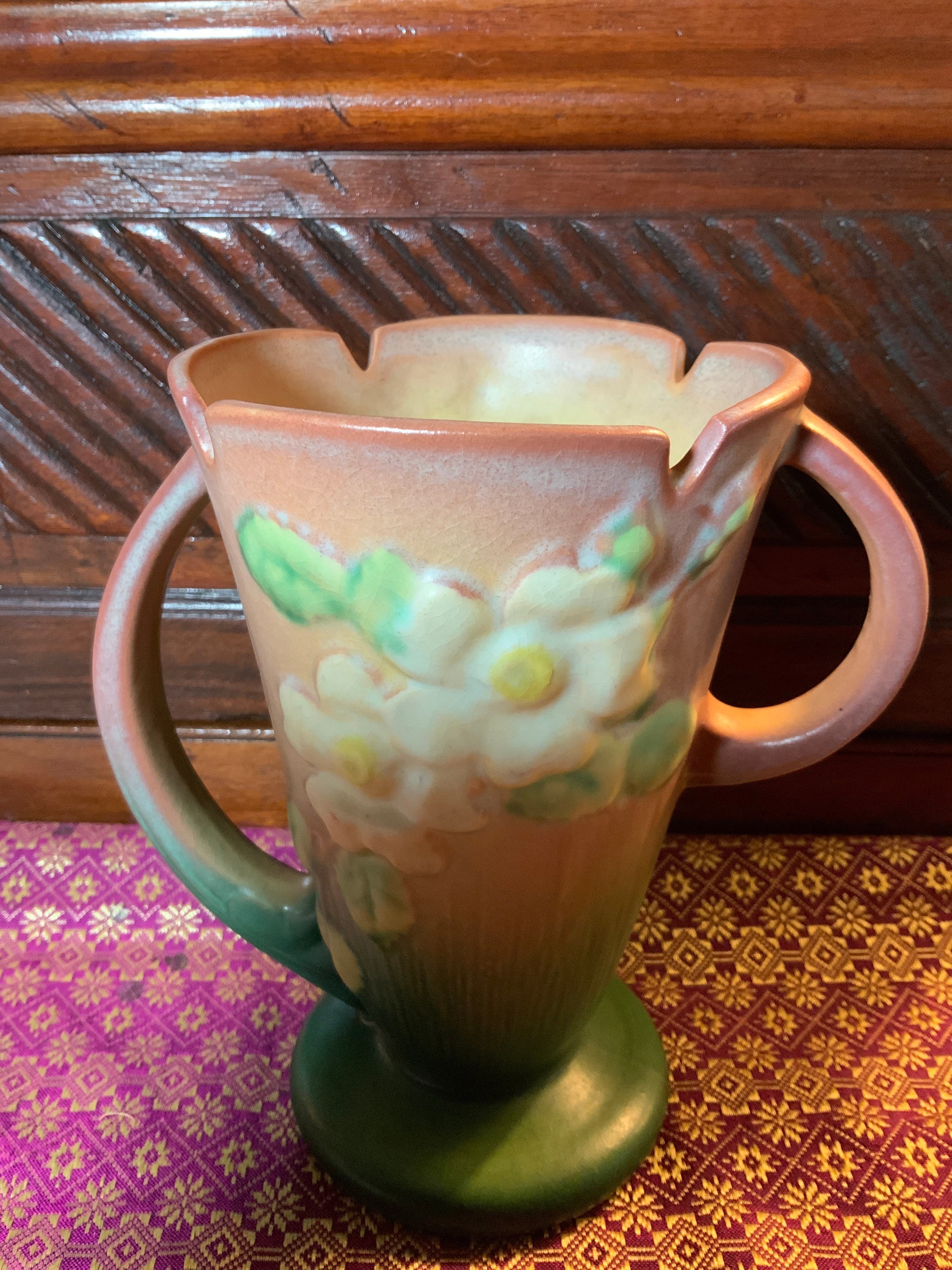 “The Roseville Pottery Company was an American art pottery manufacturer founded by J.F. Weaver in Roseville, Ohio, in 1890 and operated until 1953. Along with Rookwood Pottery and Weller Pottery, it was one of the three major art potteries located in Ohio around the turn of the 20th century. Though the company originally made simple household pieces, the Arts and Crafts–inspired designs proved popular, and Roseville pieces are now sought after by collectors. (History courtesy of Wikipedia)”