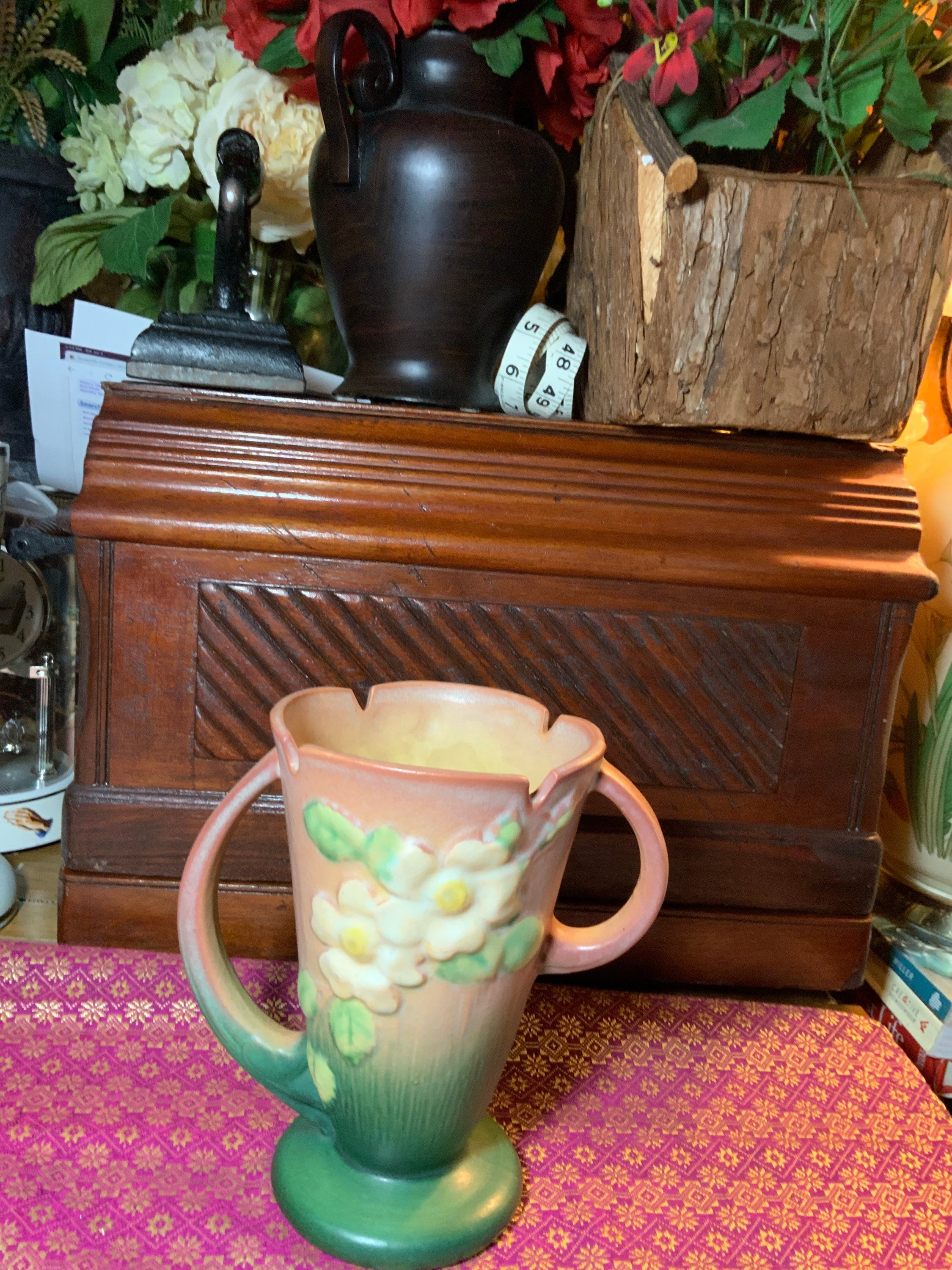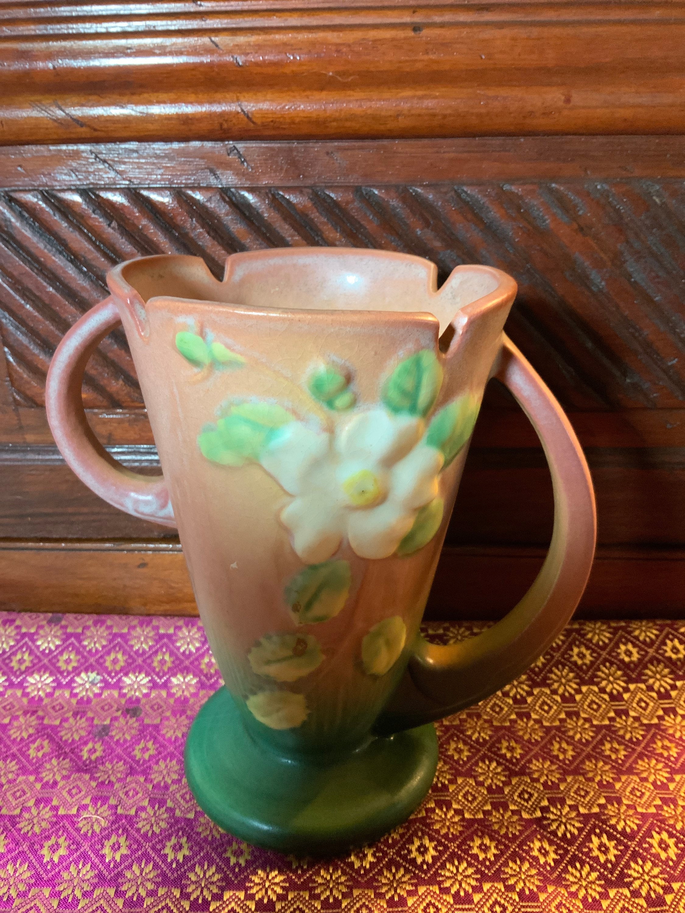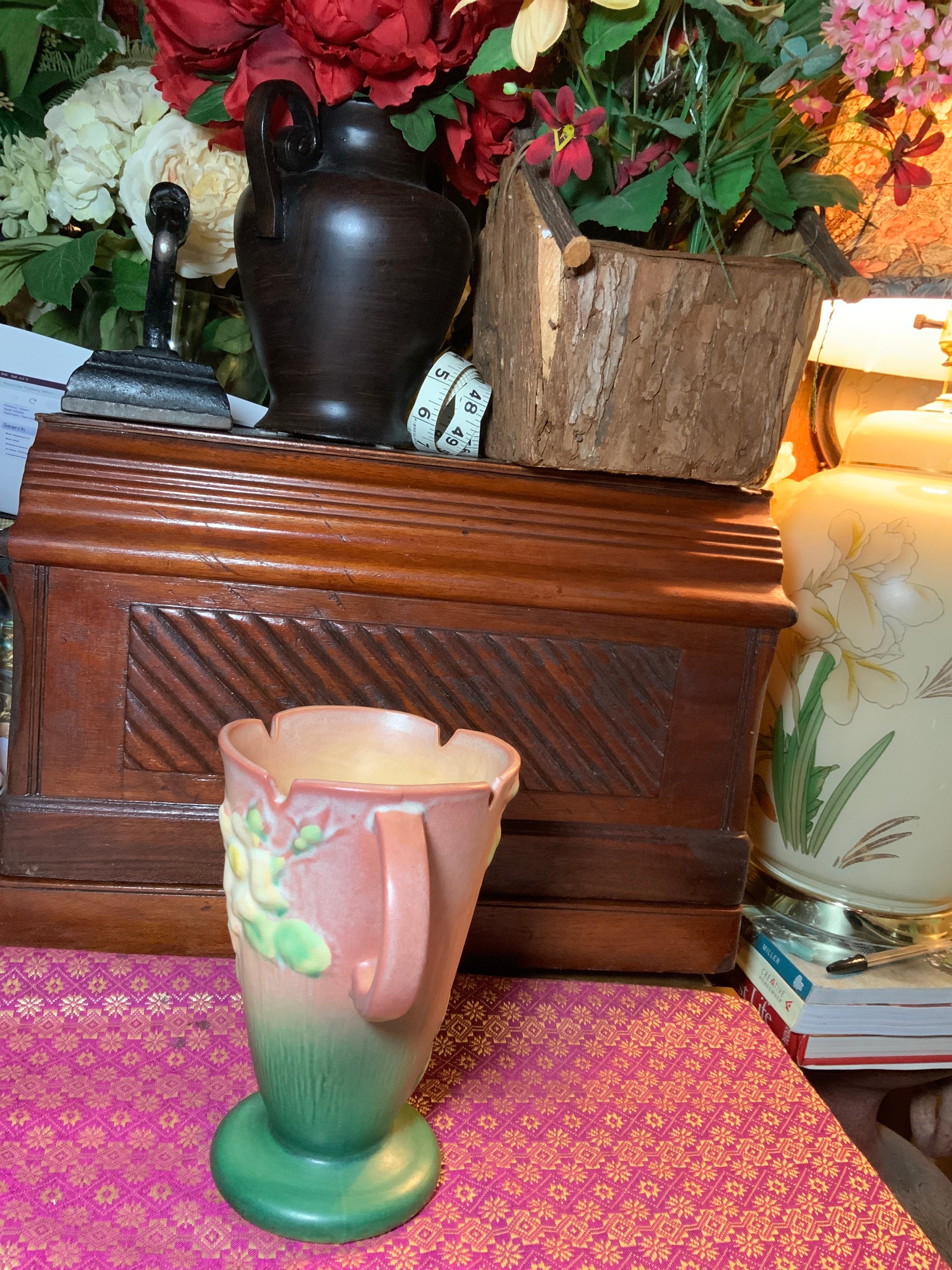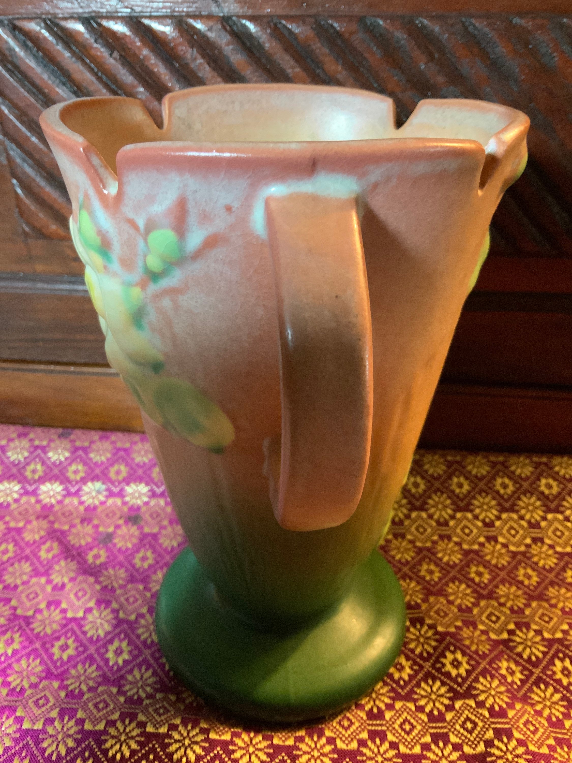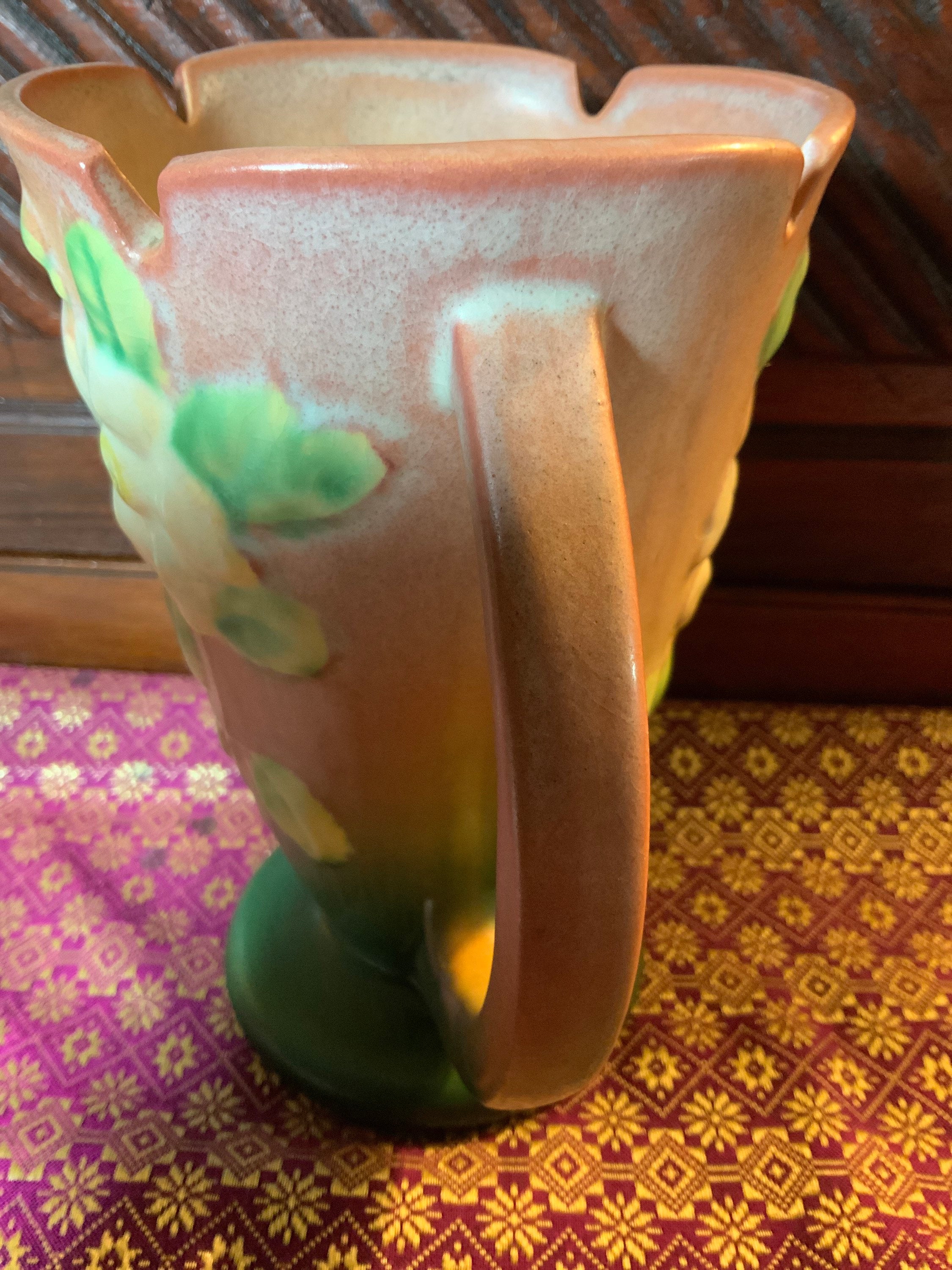 Listing is for one gorgeous decorative raising White Rose designed shape #982-7 vase , that has a lovely matte glaze with color gradations of pink with green base and asymmetrical doubled handles, created by the Roseville Company in Roseville,Ohio U.S.A. 1940s, by the employees who were originally local housewives,who took pride in their creations. This shape #982-7 is one of the examples of original authentic old world quality piece , with classic 1940s gradient colors mixed with yellow,pink and green. Each of side of the asymmetrical handles, has single white petals with yellow ochre centered rose with leaves in earthy creamy green and yellow tones attached to pink branch ,was embossed over pink in upper and earthy green on lower part of the vase in rich, fresh and vivid matte glaze .
