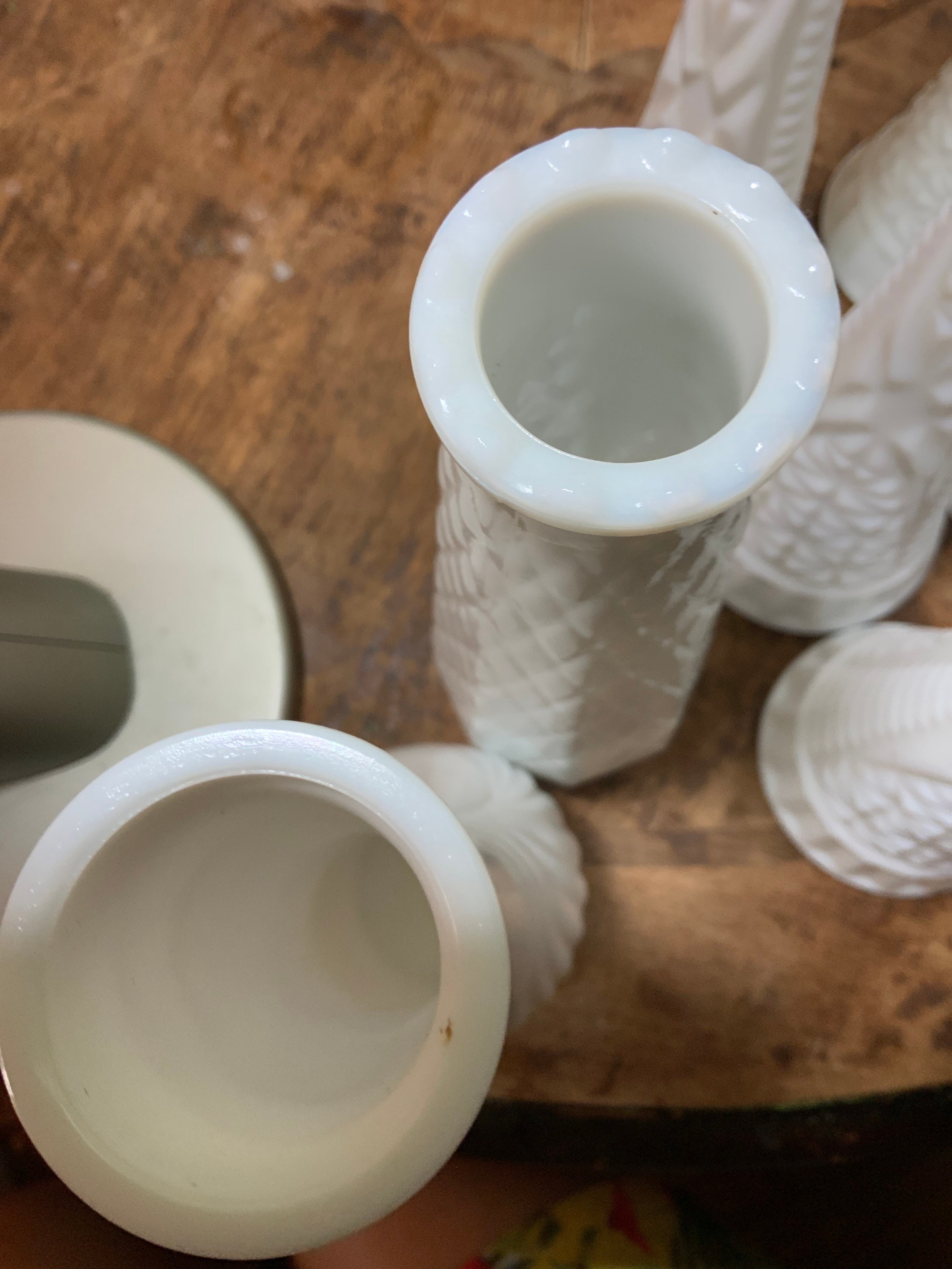 Conditions Previously owned, well kept bud vases. Inside each is mostly clean except a few as shown through out the photos and outside has some tiny age spots that may need the right solution to clean. The age spots are not really exposed,so I never thought of them as imperfection until close photos taken in last photo.