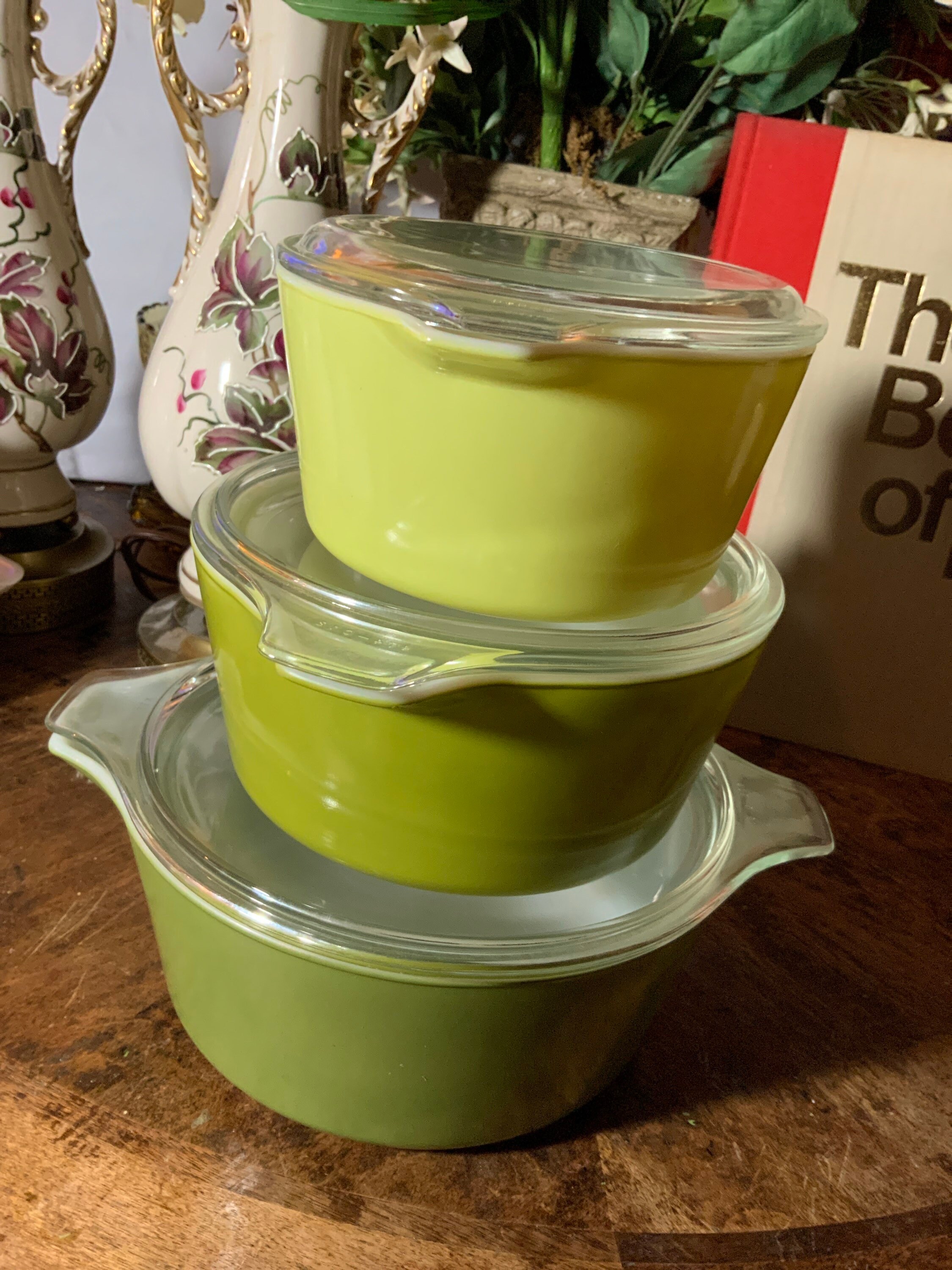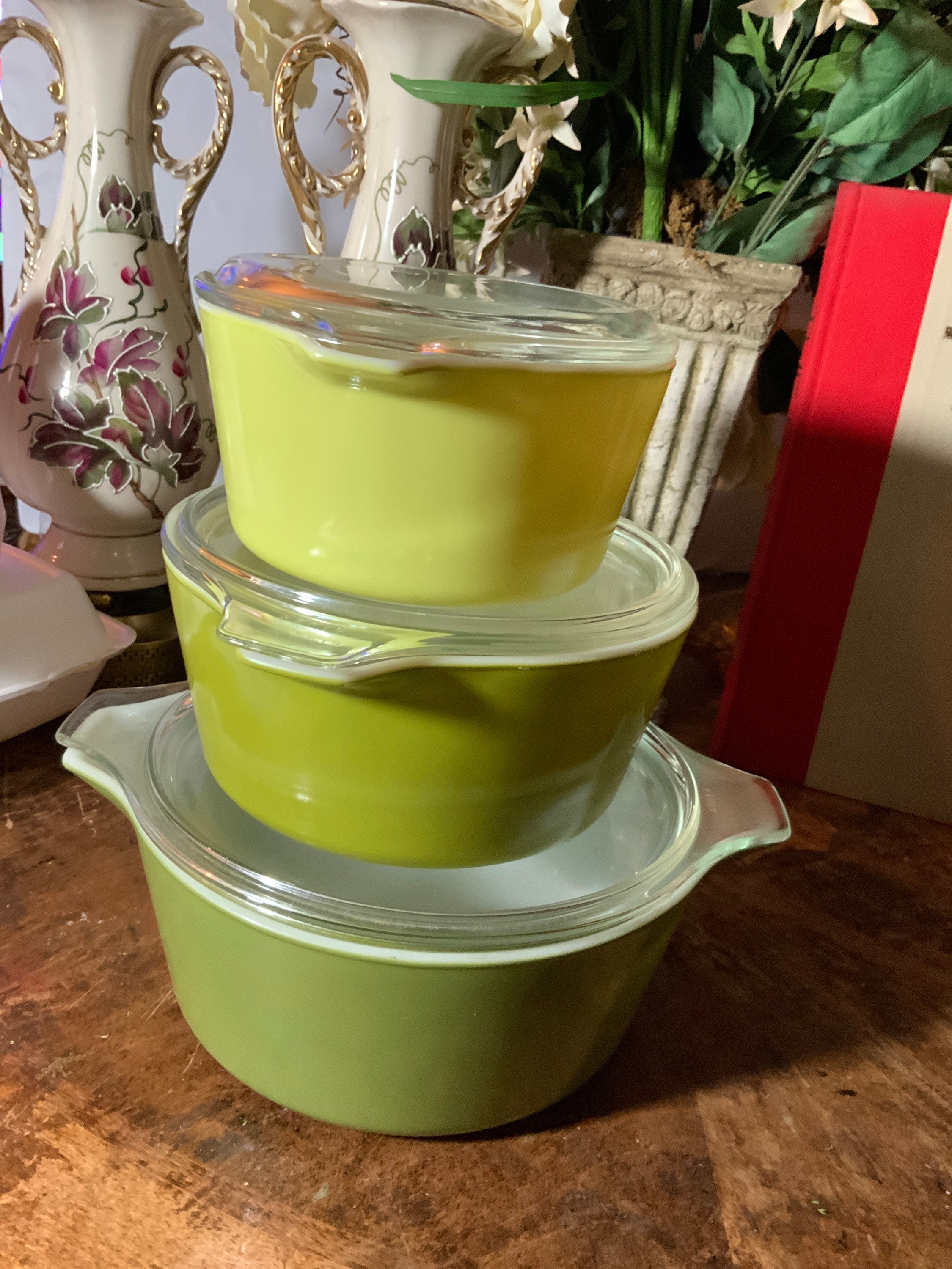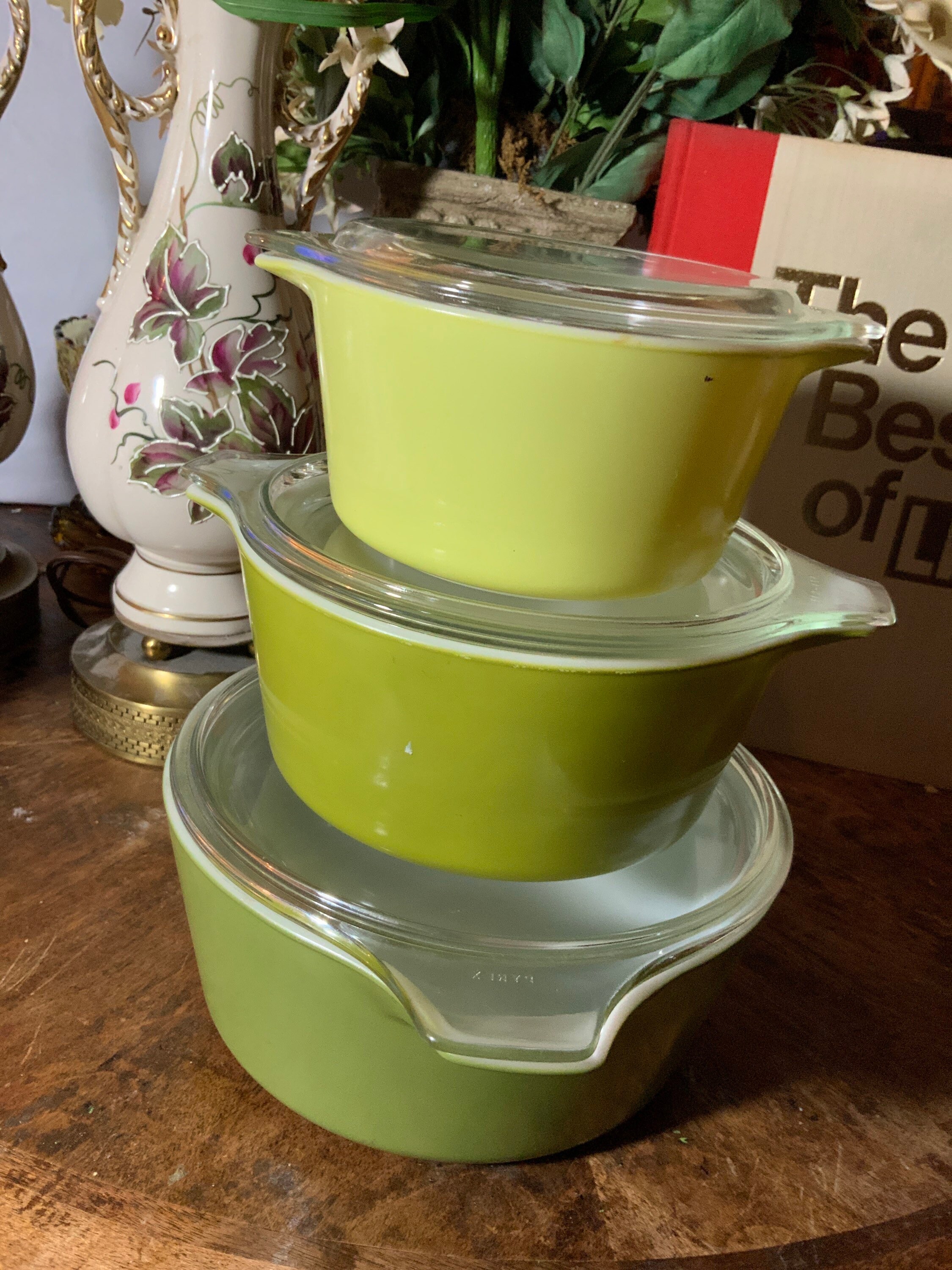 All were discontinued in 1983.Their counterpart,Corelle Dinnerwarer discontinued 2 years later,in 1985. That makes these forgotten relics are very collectible set. Whether or not a collector,these will make great addition to kitchenware. Or make beautiful country farmhouse colonial home decor,make such an old world quality looks that gives old school romantic feel cookware, from oven bake or microwave to serving to dishwasher. After decades of previously owned, they still hold up vibrant different shades of green(“Verde” Mixing Bowl Pyrexware Set )