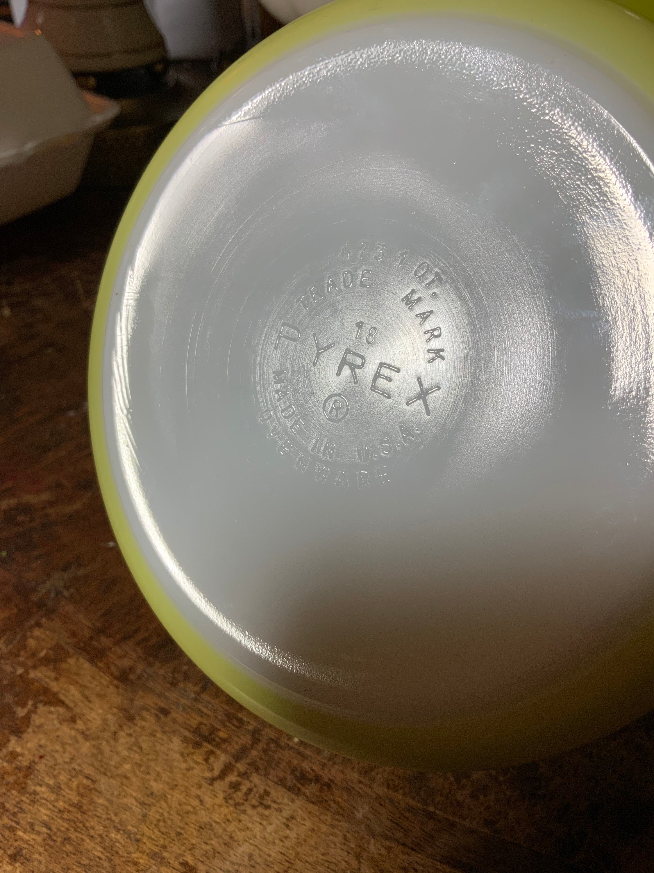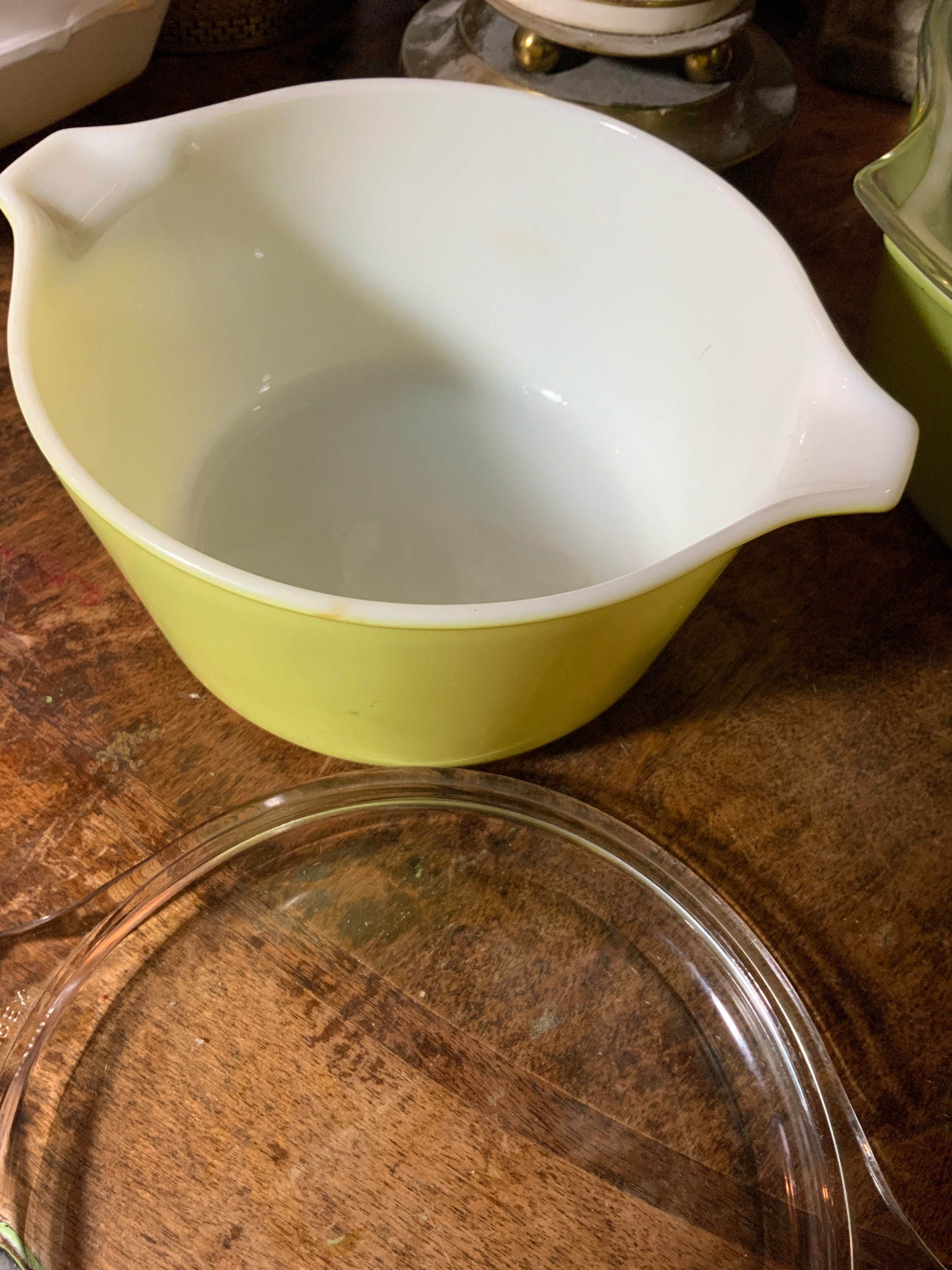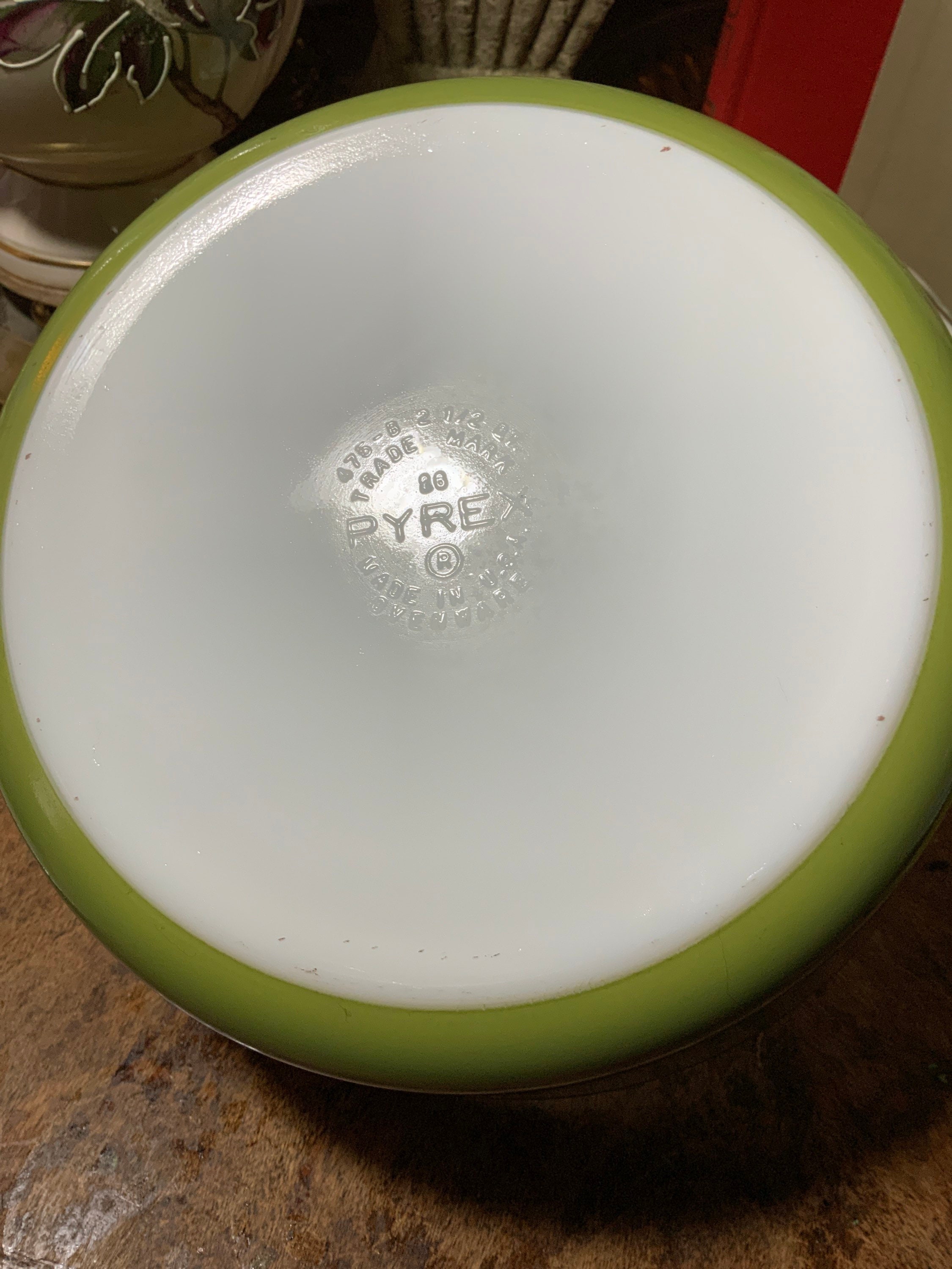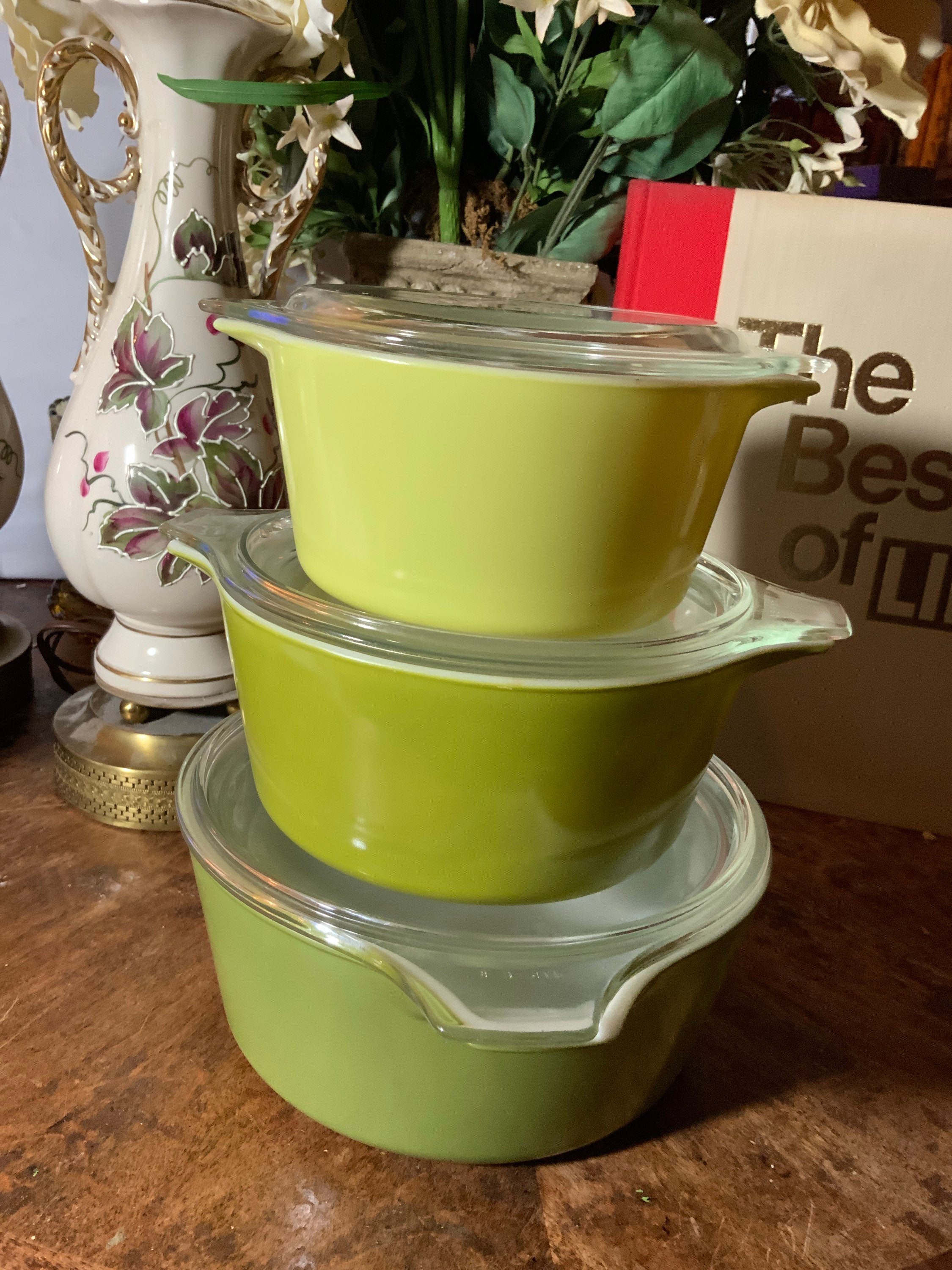 All were discontinued in 1983.Their counterpart,Corelle Dinnerwarer discontinued 2 years later,in 1985. That makes these forgotten relics are very collectible set. Whether or not a collector,these will make great addition to kitchenware. Or make beautiful country farmhouse colonial home decor,make such an old world quality looks that gives old school romantic feel cookware, from oven bake or microwave to serving to dishwasher. After decades of previously owned, they still hold up vibrant different shades of green(“Verde” Mixing Bowl Pyrexware Set )