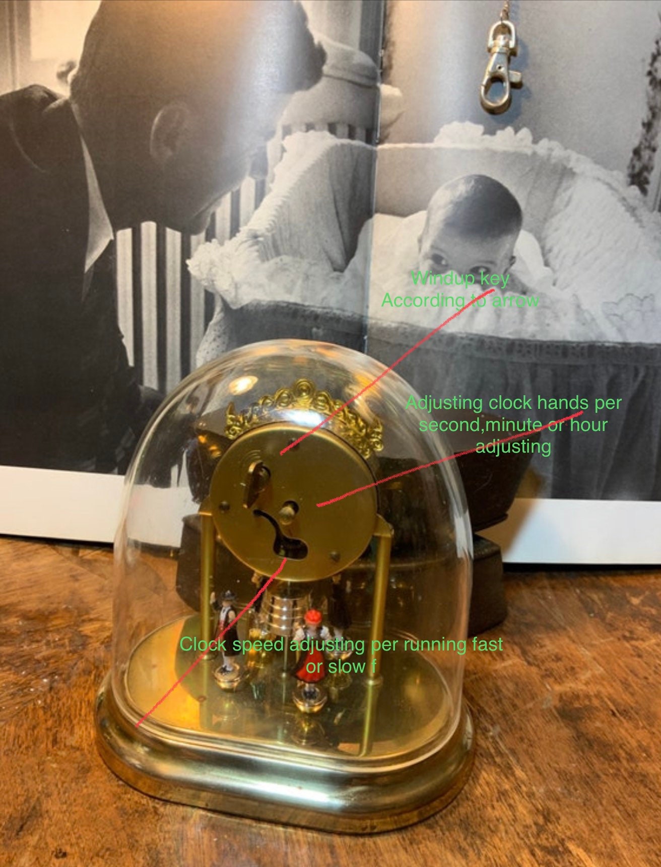 In the back of this clock,as shown in last photo with diagrams and text describing what each functionality is, a function to wind up the clock for 8 day to the fullness, a function to advance the second hand until time is correct per hour,minute and second, pointing on the face of the clock, A function to adjust/regulate the speed of the clock, If the metal level is lowered to the negative side the clock will run slower and if metal lever is raised to positive sign the clock will run faster. A slight turn about a 1/4 of a turn will gain or reduce the clocks speed by about 1 minute or so.