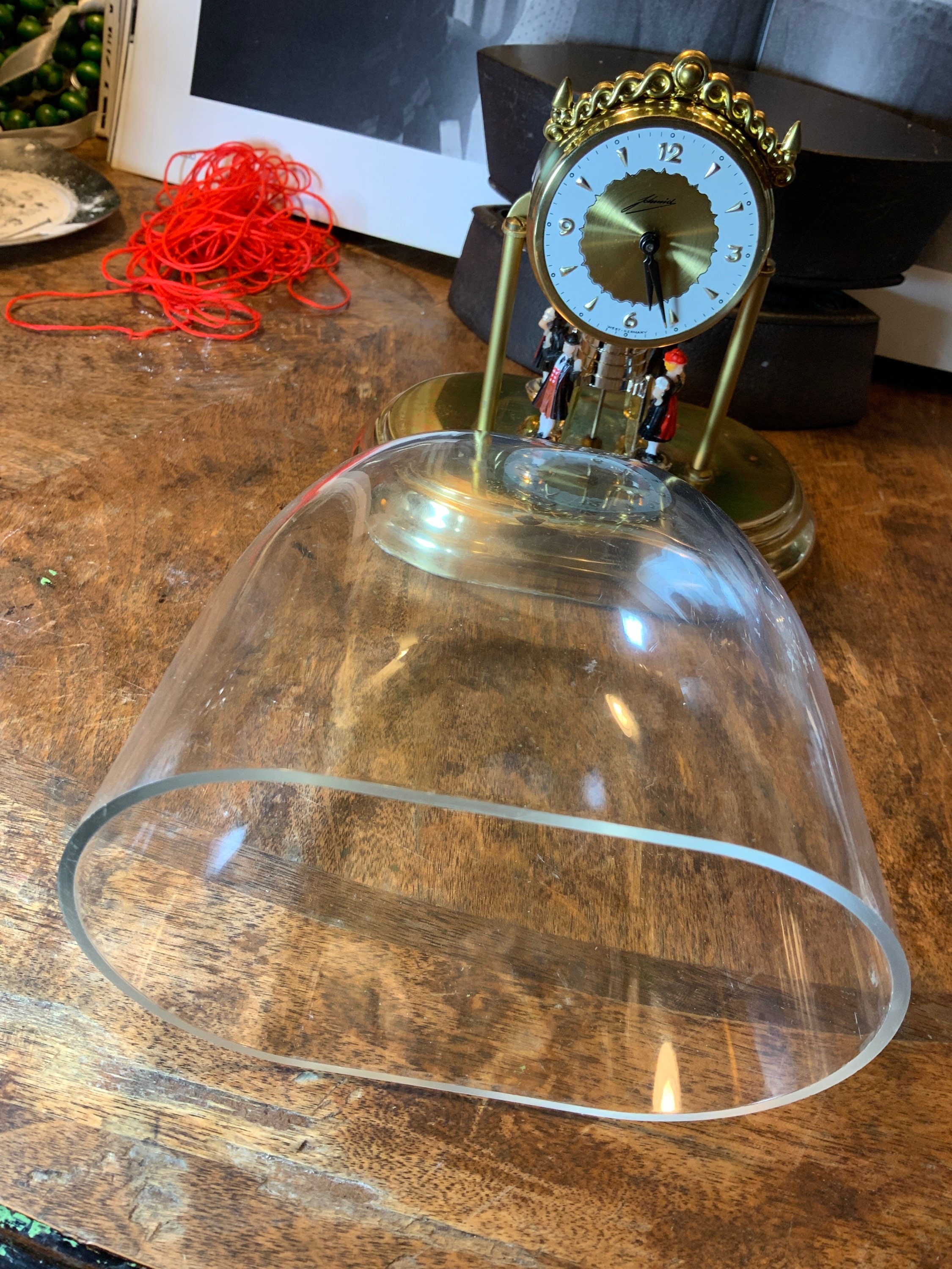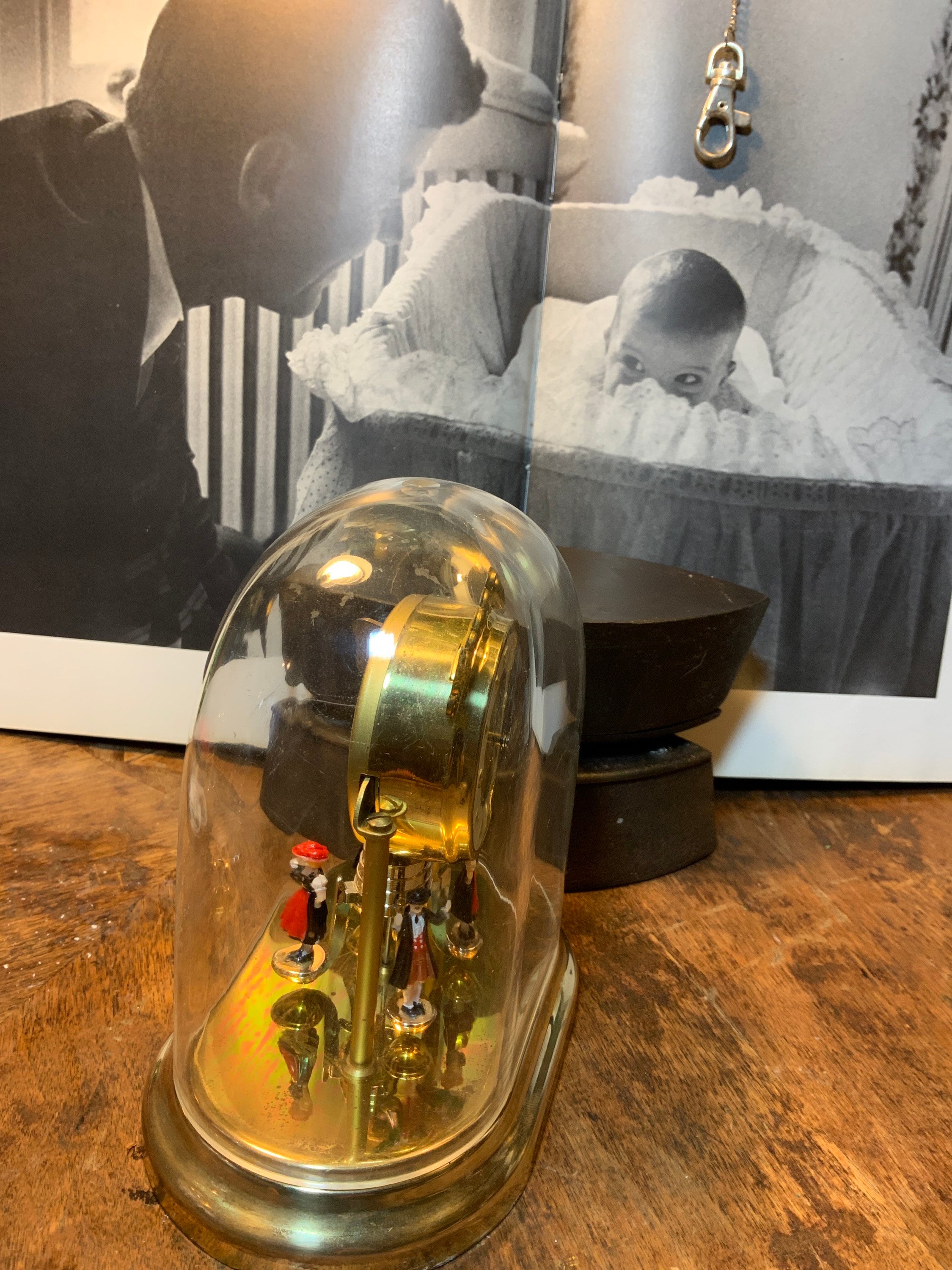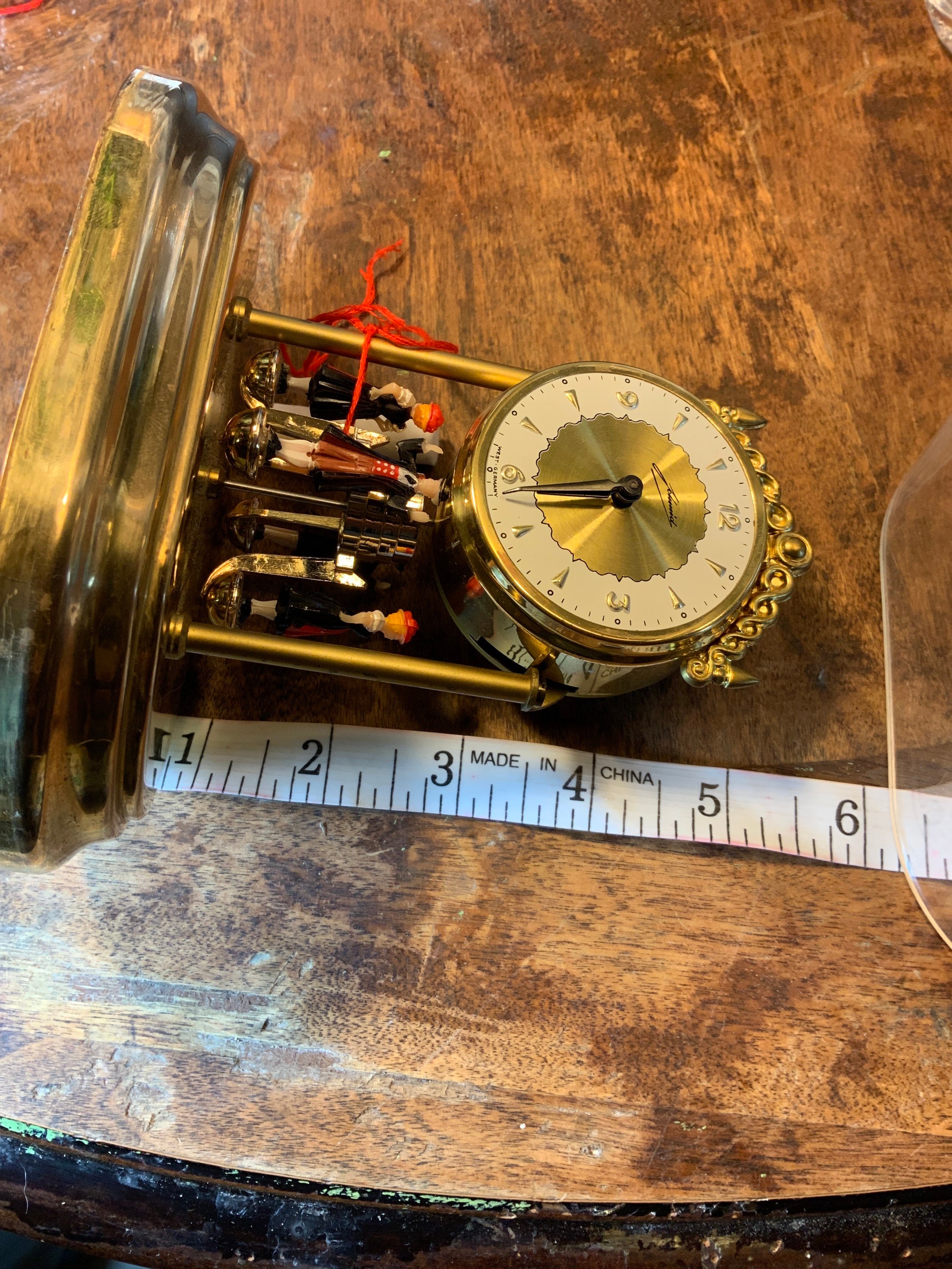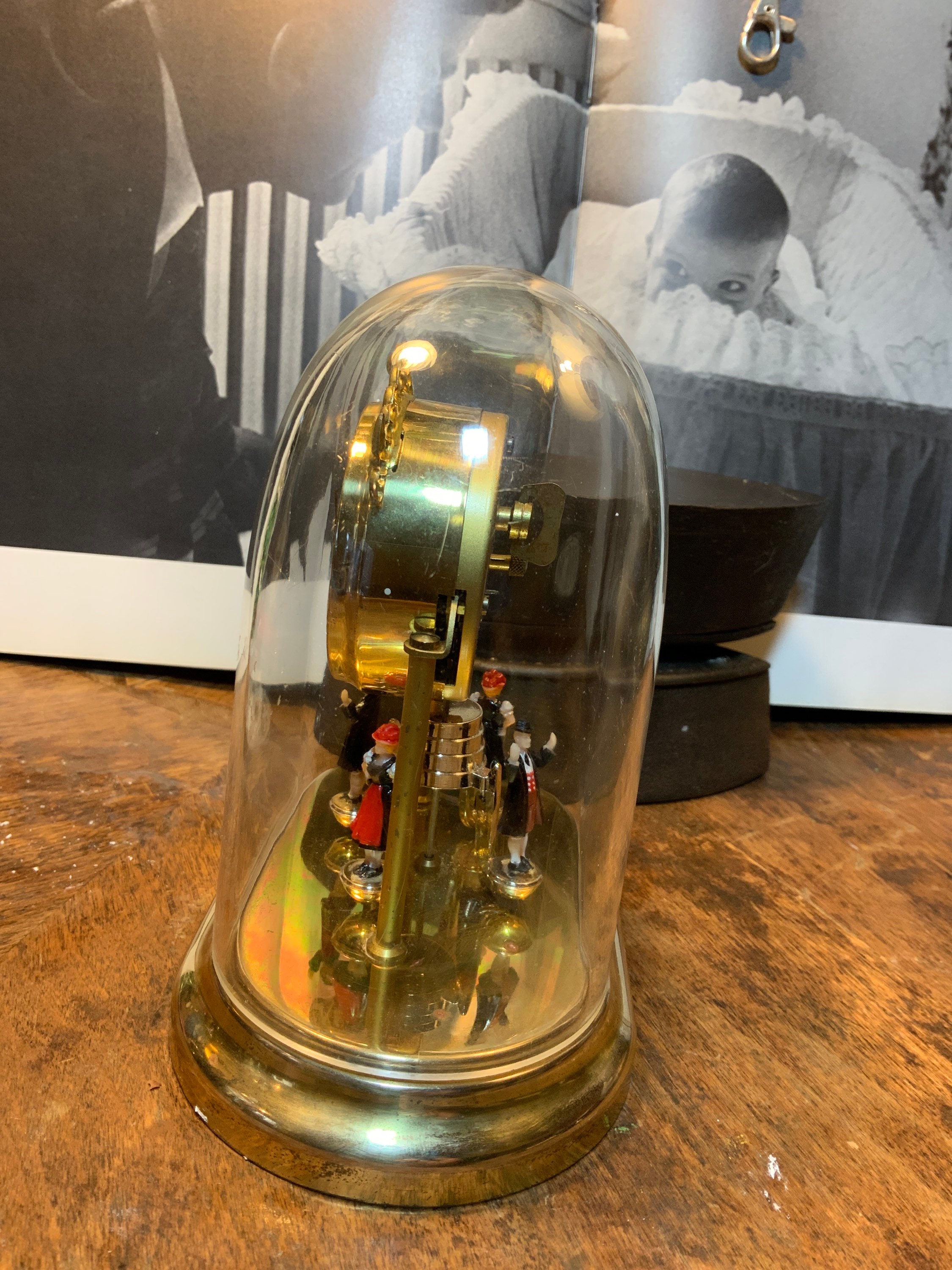 Listing is for one vintage Schmid miniature novelty musical thyme dancers on arms of Balance Wheels, west German mechanical 8-day wind-up mantle clock. The clock with dancers on the arms of Balance Wheels,