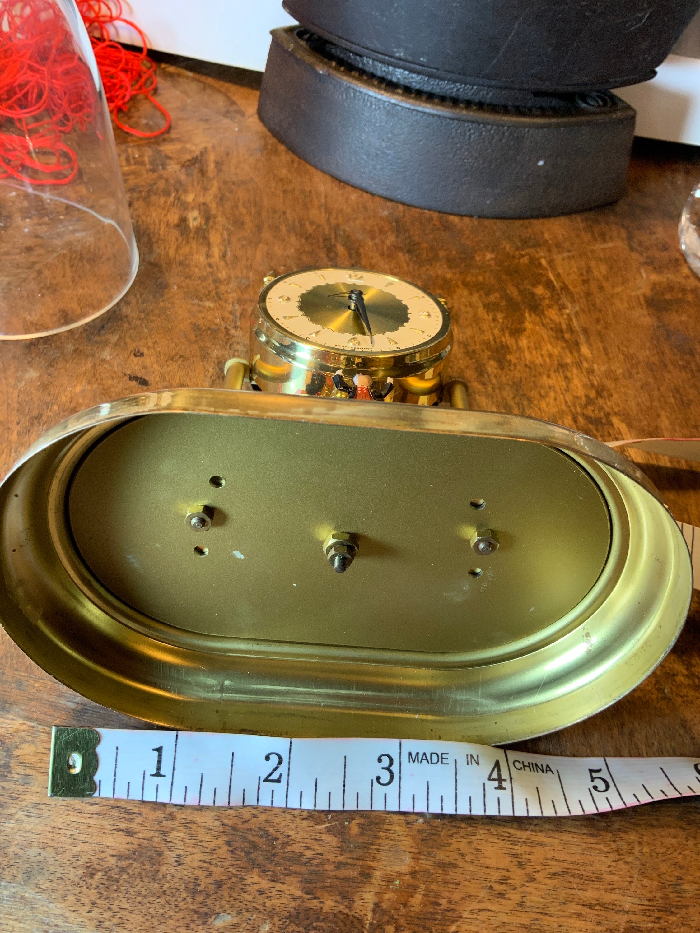 This clock does not have pendulum but instead has a balance wheel. The counts the oscillations of the balance wheel, which is attached to a spring. As the wheel turns, it winds the spring. There is a small lever close to the balance wheel with markings indicating slower (-) or faster (+). Simply move the lever in the appropriate direction. The lever moves along the outer coil and changes the effective length of the spring. Above dial,marked “Schmid” in cursive and underneath 6 o’clock dial, marked West Germany.