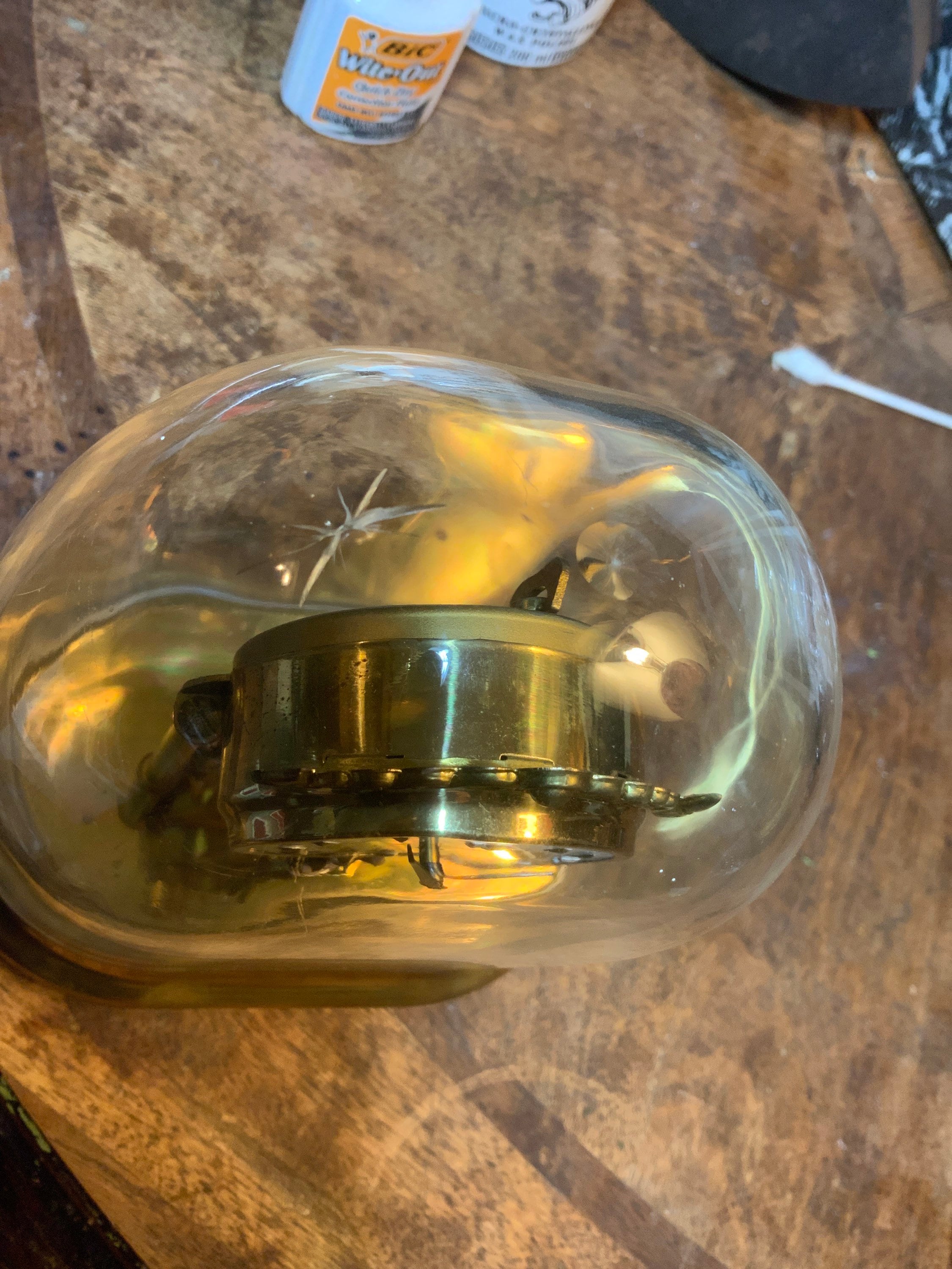 Condition Beside starburst liked crack to lucite clear oval dome, shown in last photo,scattered patina to oval brass base,everywhere else is in excellent working condition.