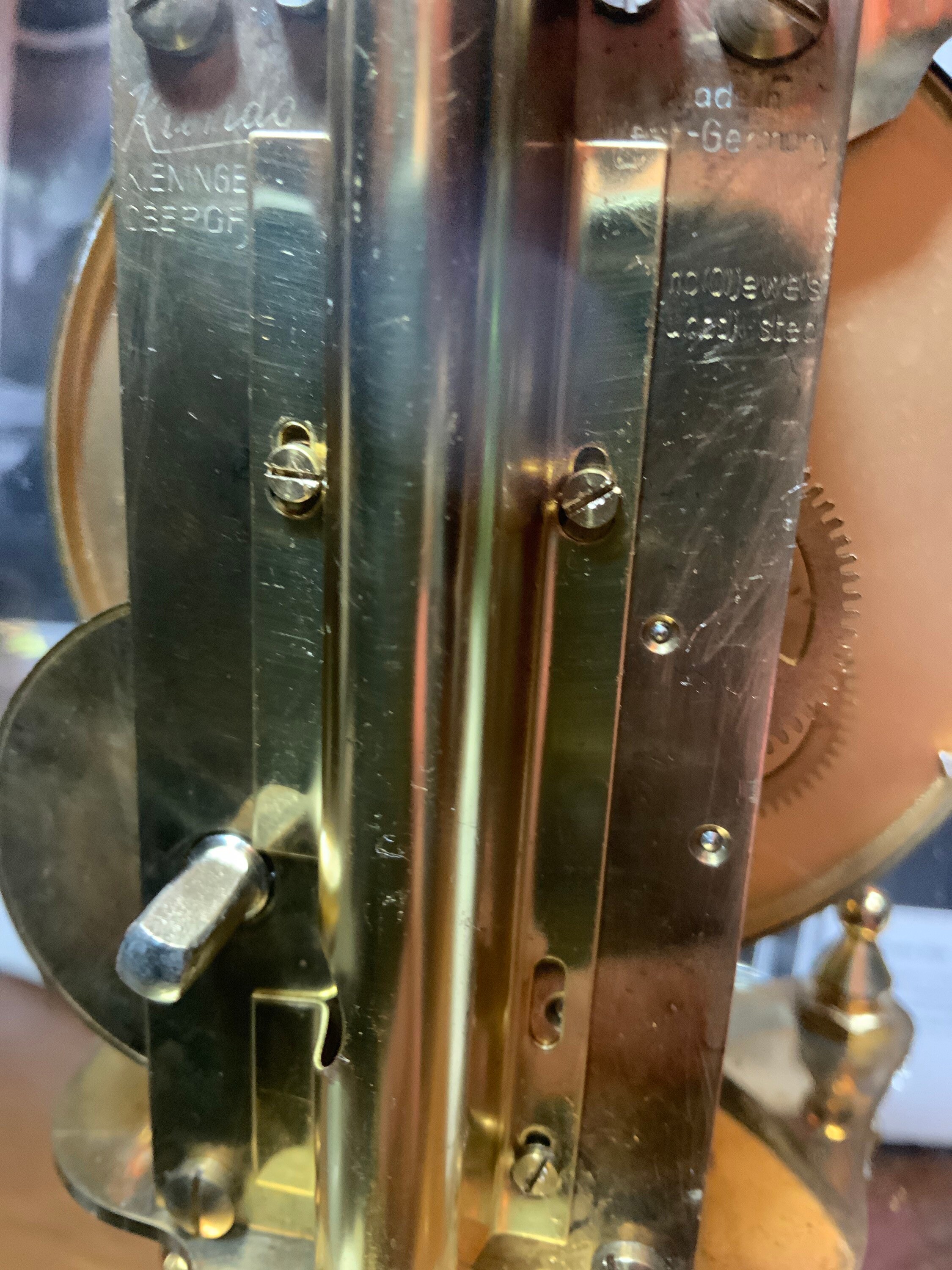 “KIENINGER & OBERGFELL ) NO (0) JEWELS , MADE IN West-GERMANY UNADJUSTED “,0 Jewel Adjusted, simply means that the clock must be put in beat manually if it goes out of beat or whenever new pendulum spring wire is put in.