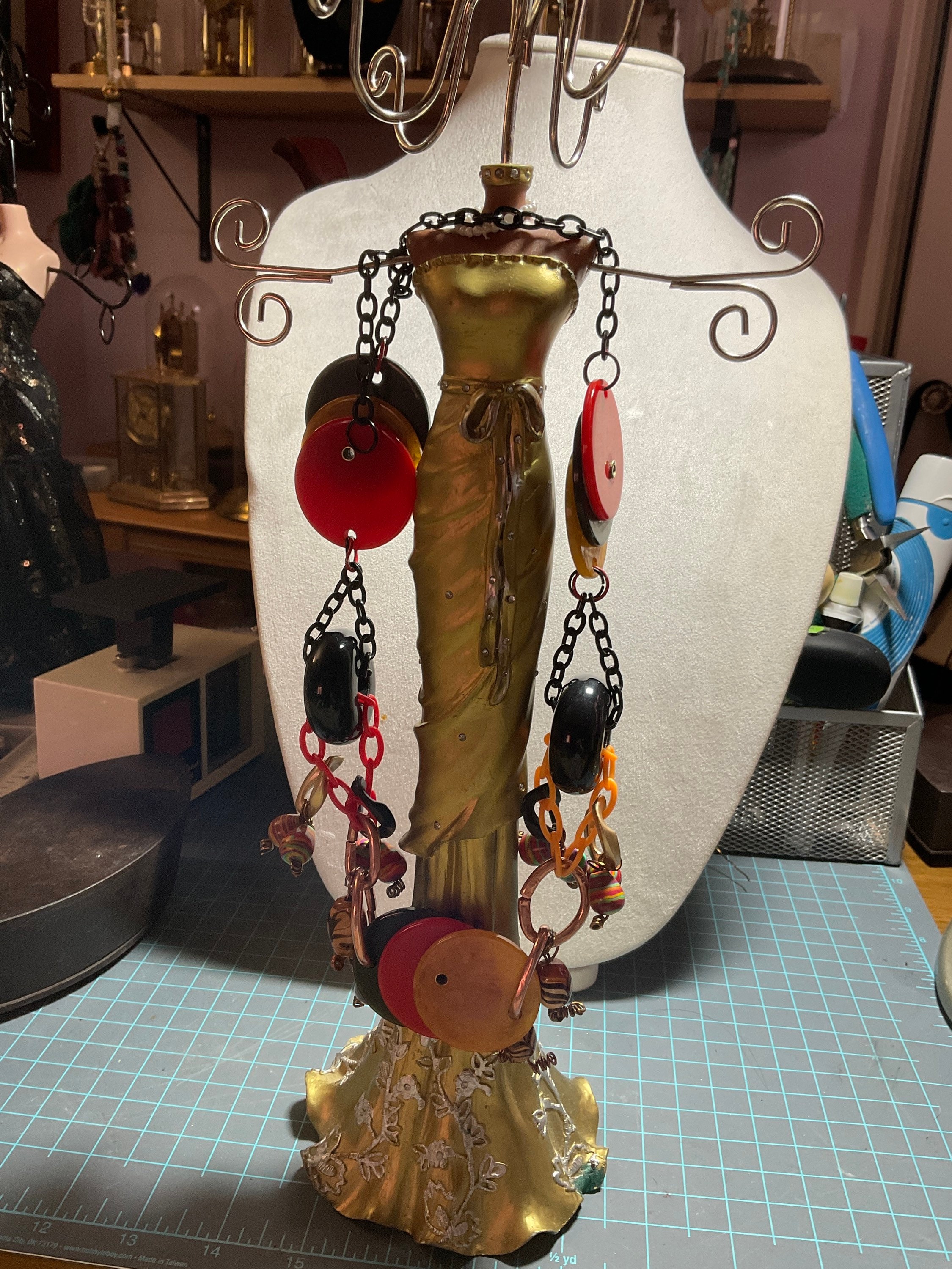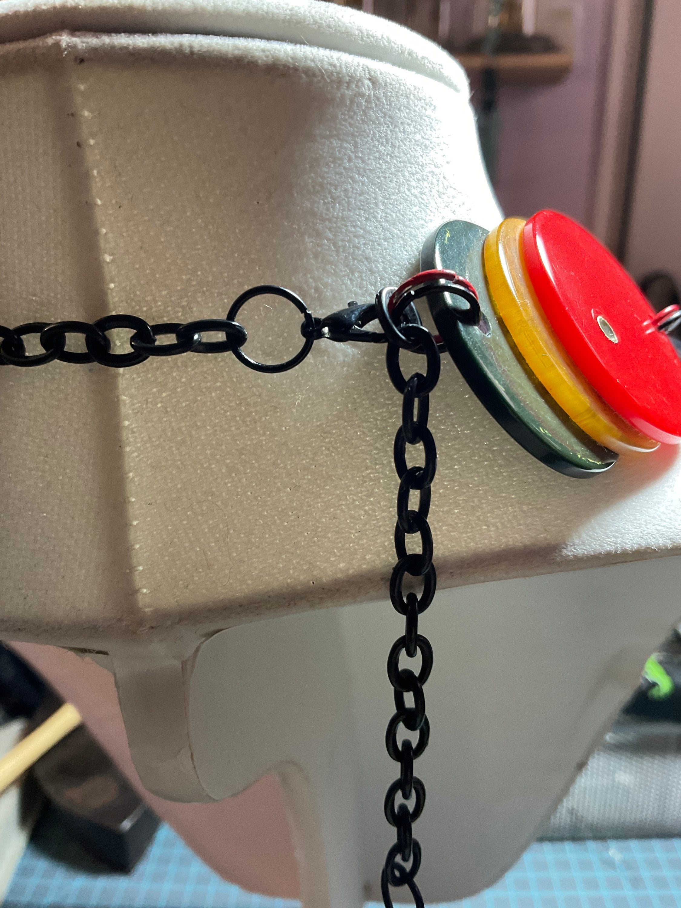 I created this necklace piece from Plastic Acrylic chains and multi-colored beads,added 9 Bakelite poker chips as circle discs-3 on front and 3 each side in red, greenish black and butterscotch. Bakelite discs were connected (stack) by copper tubes. Acrylic plastic chained pieces were connected by large copper jump rings, acrylic beads were connected by brass wire.