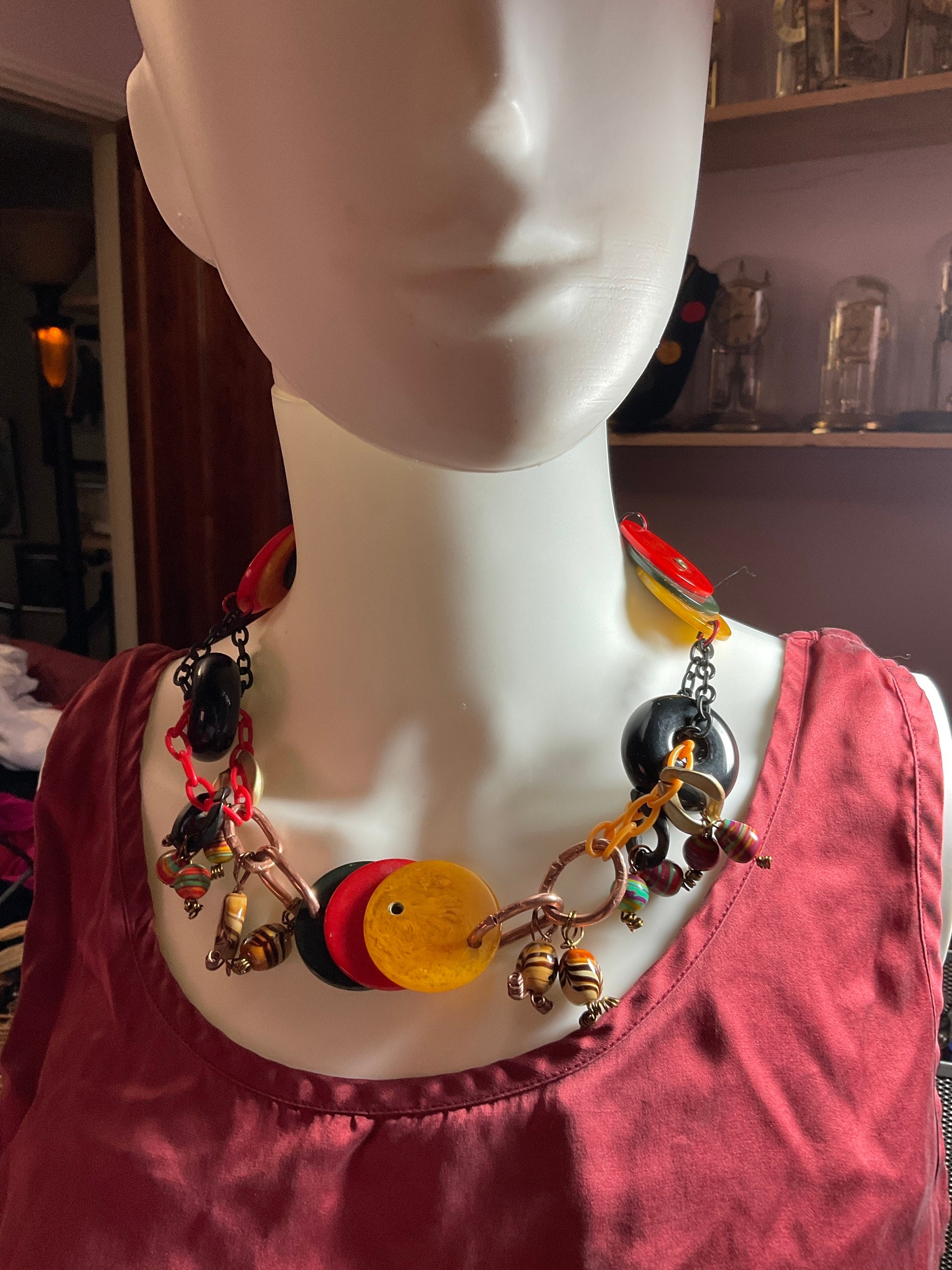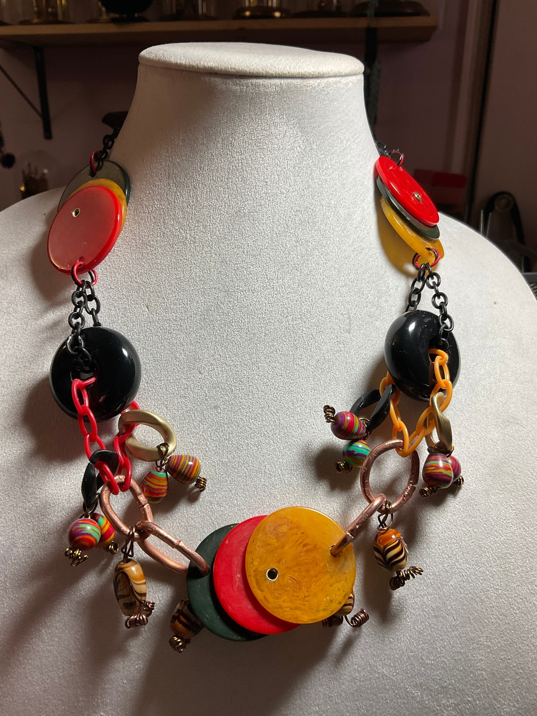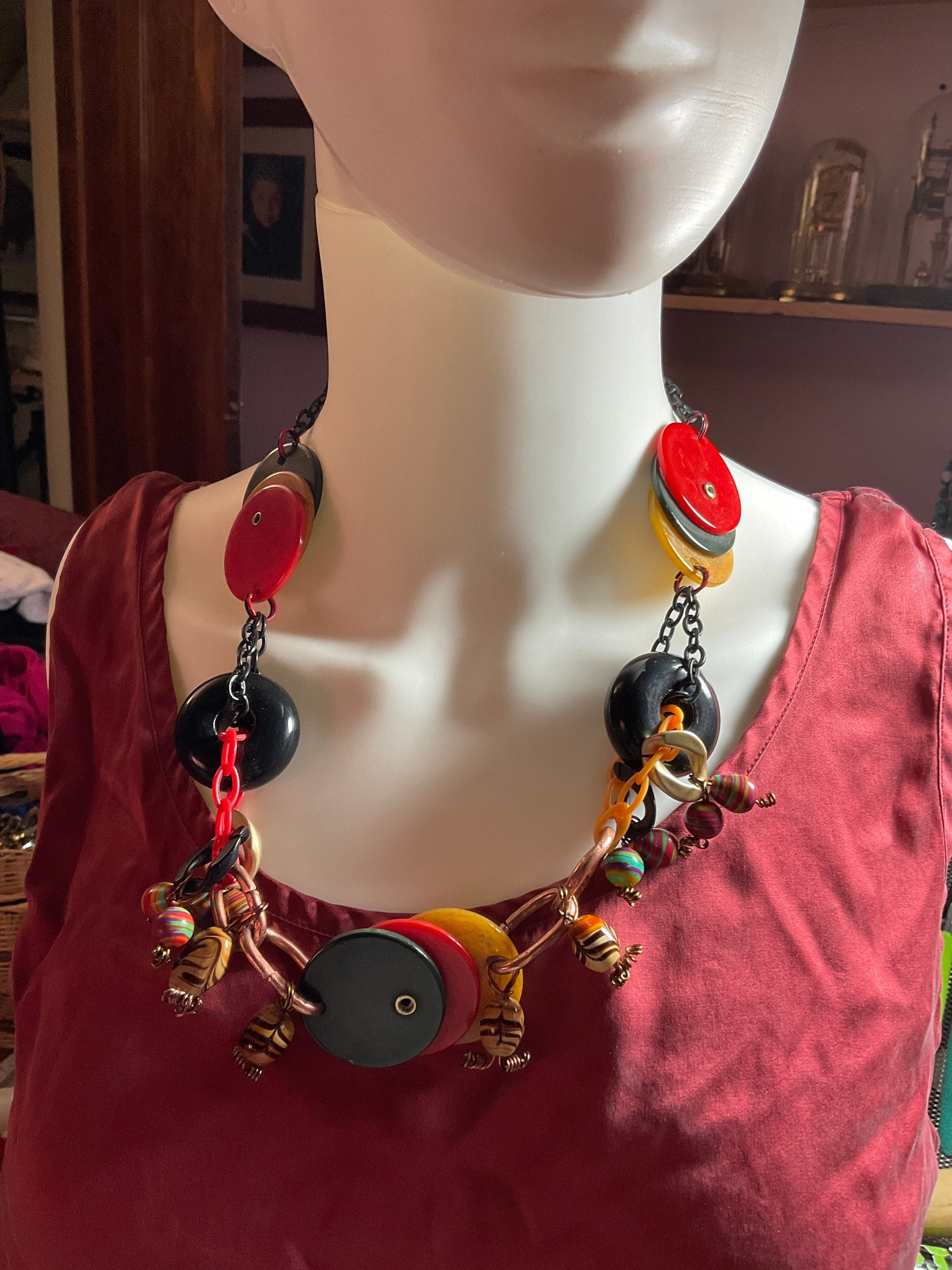 All my jewelry creations have been inspired by vintage jewelry books from 1920s to mid- century vintage retro style designs. Per this necklace I combined antique poker chips with modern acrylic multi colored beads and two large blacks Randal beads from old jewelry,connected by acrylic plastic chains ,brass wire and jump rings and copper crimps,creating from copper tubing.
