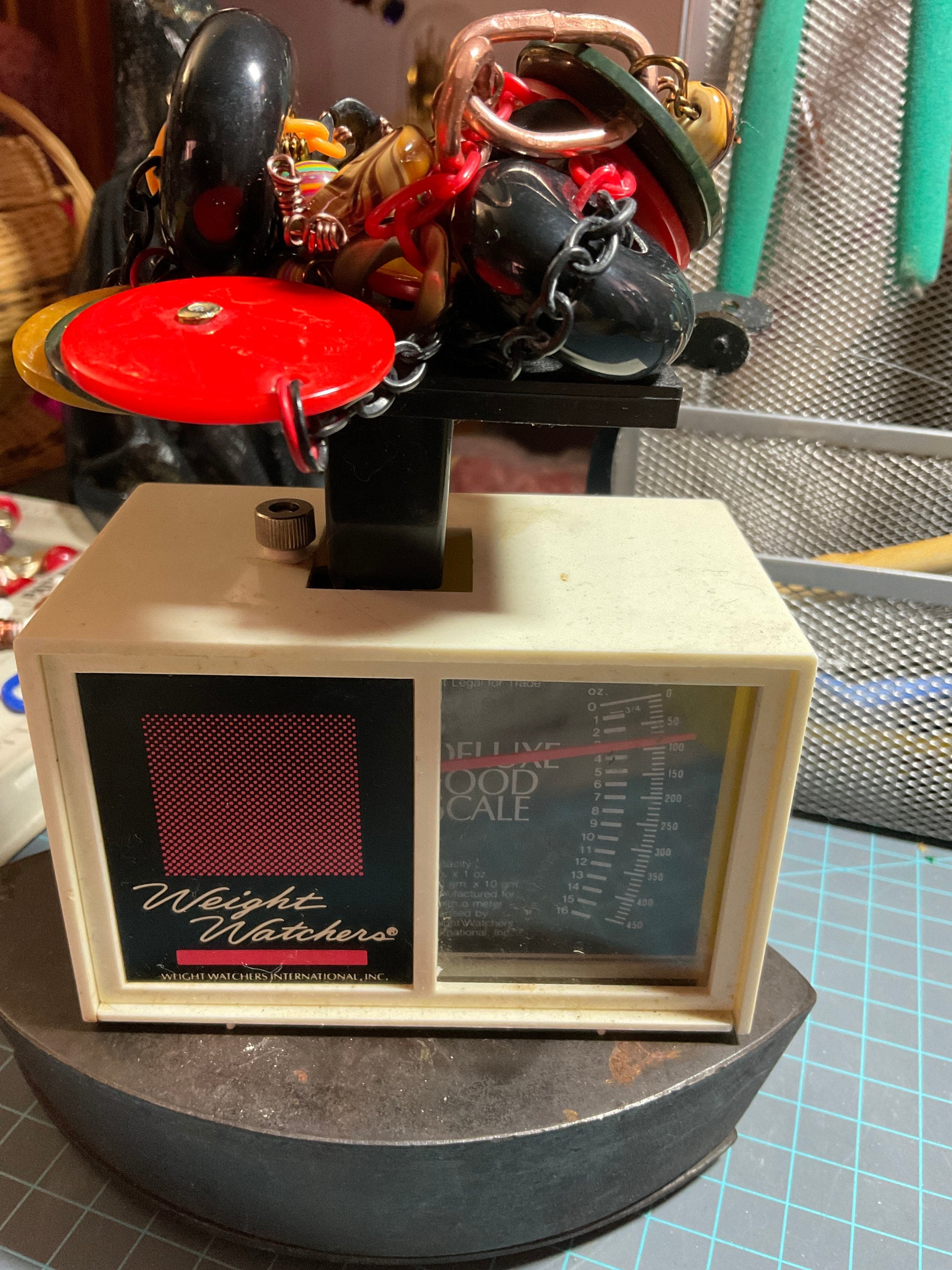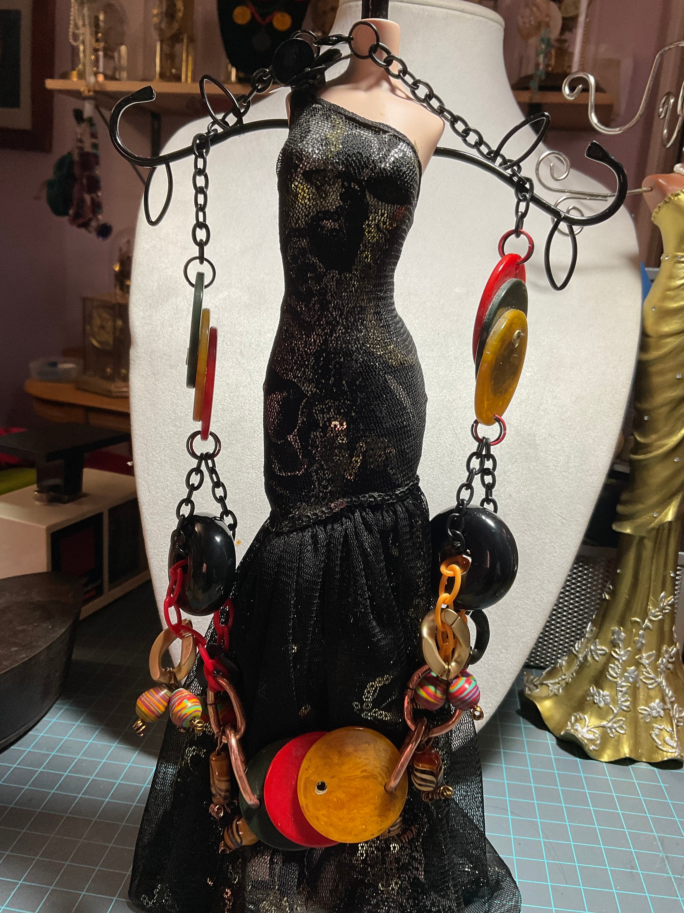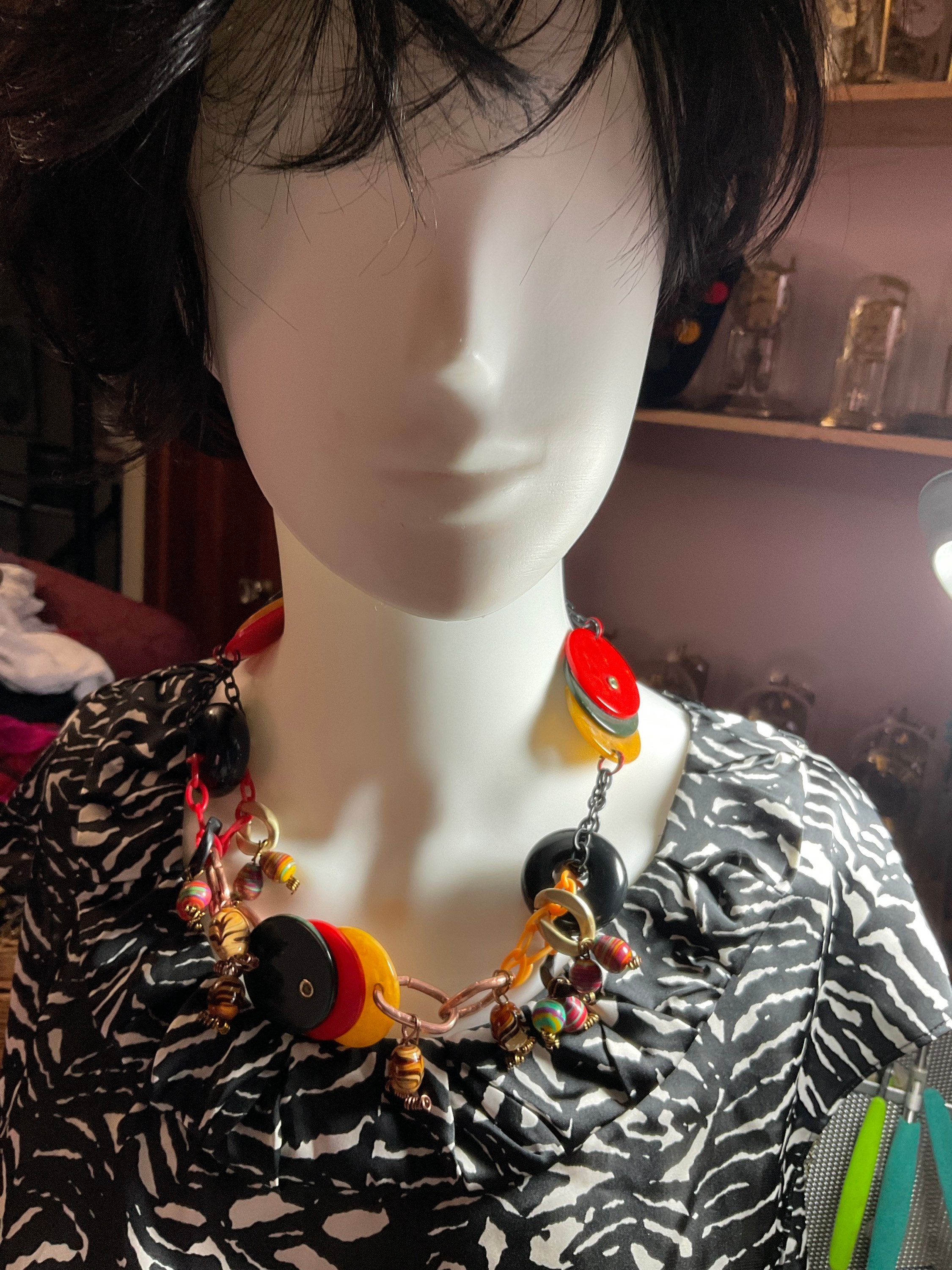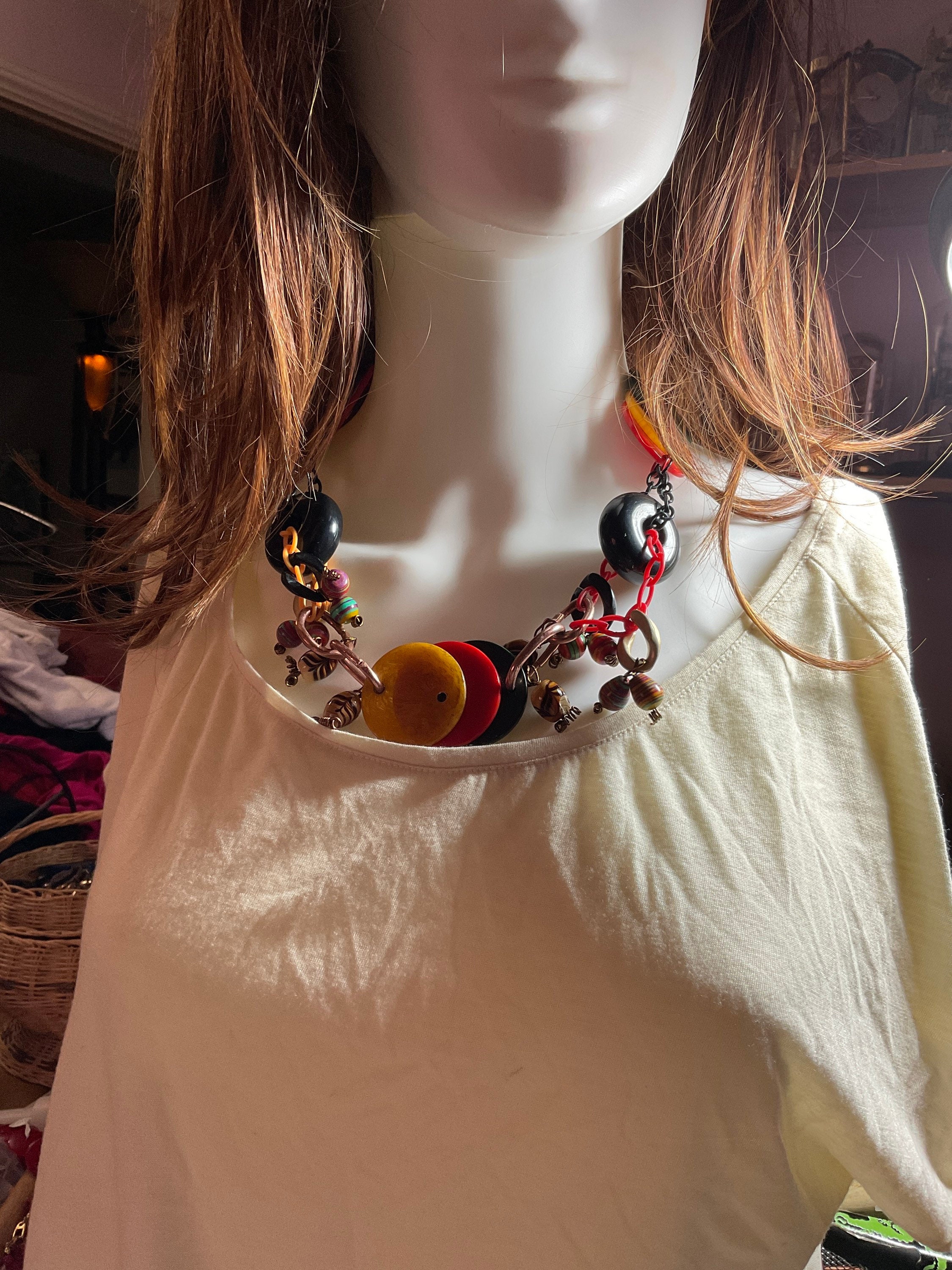 All my jewelry creations have been inspired by vintage jewelry books from 1920s to mid- century vintage retro style designs. Per this necklace I combined antique poker chips with modern acrylic multi colored beads and two large blacks Randal beads from old jewelry,connected by acrylic plastic chains ,brass wire and jump rings and copper crimps,creating from copper tubing.