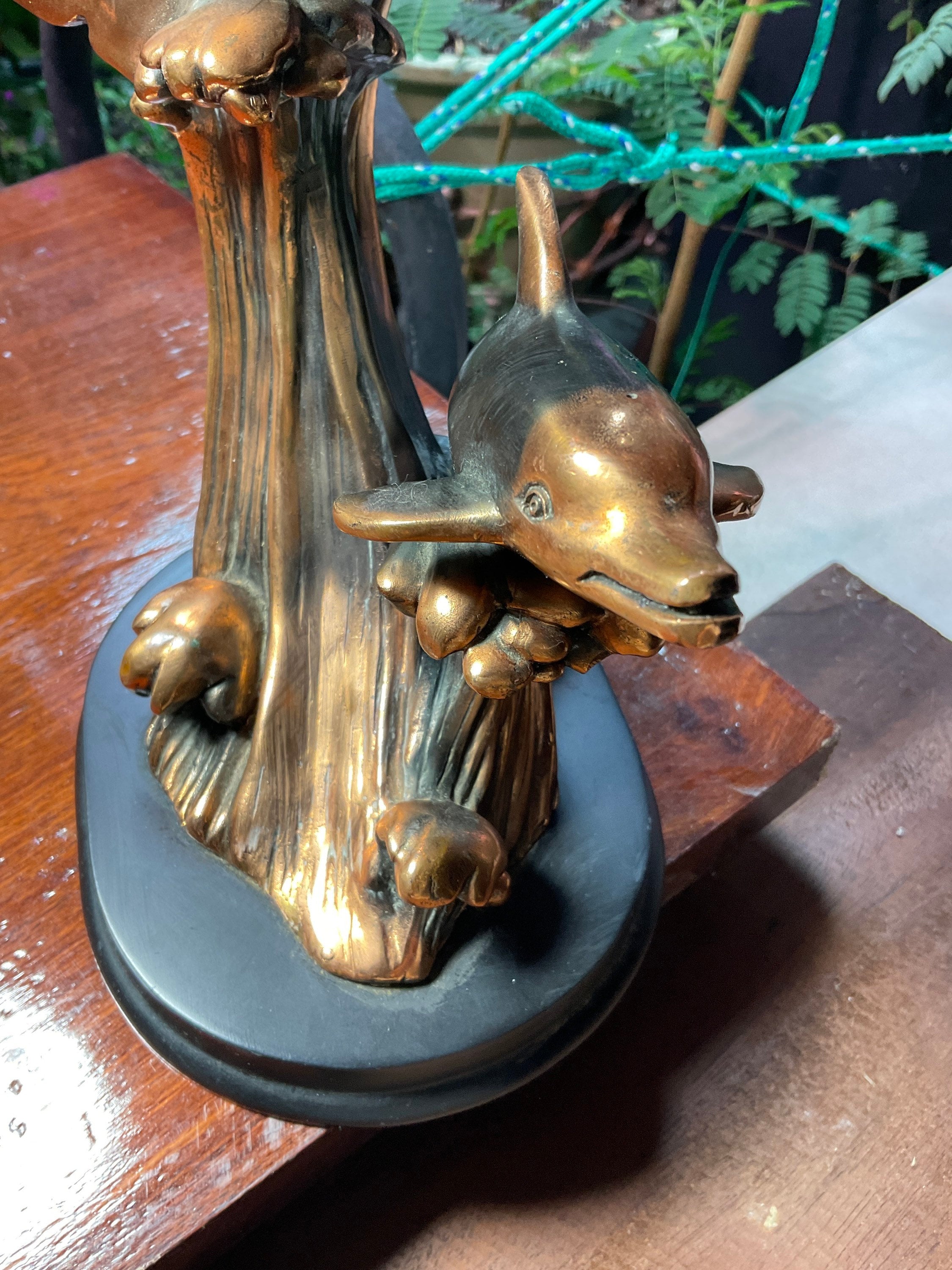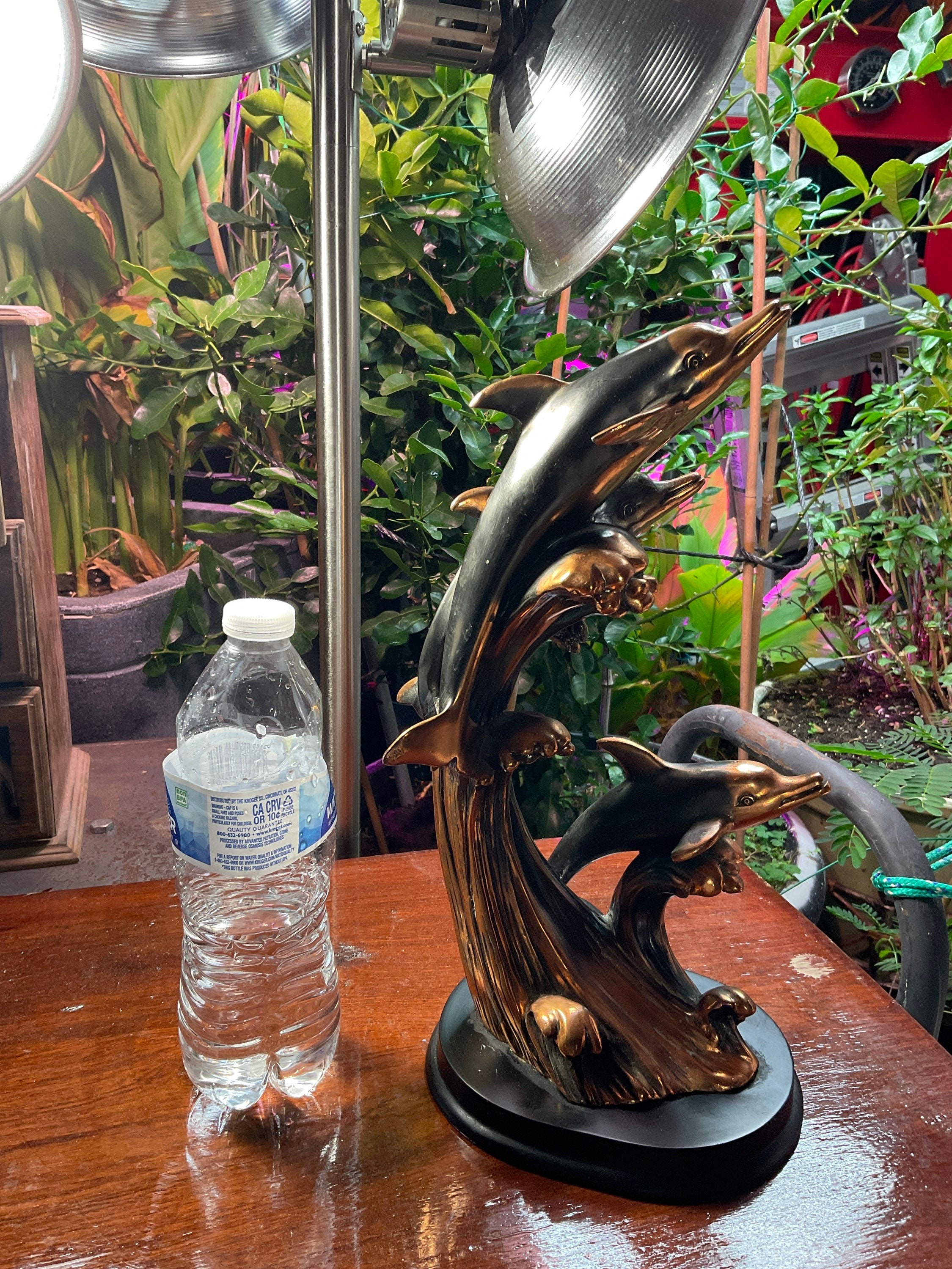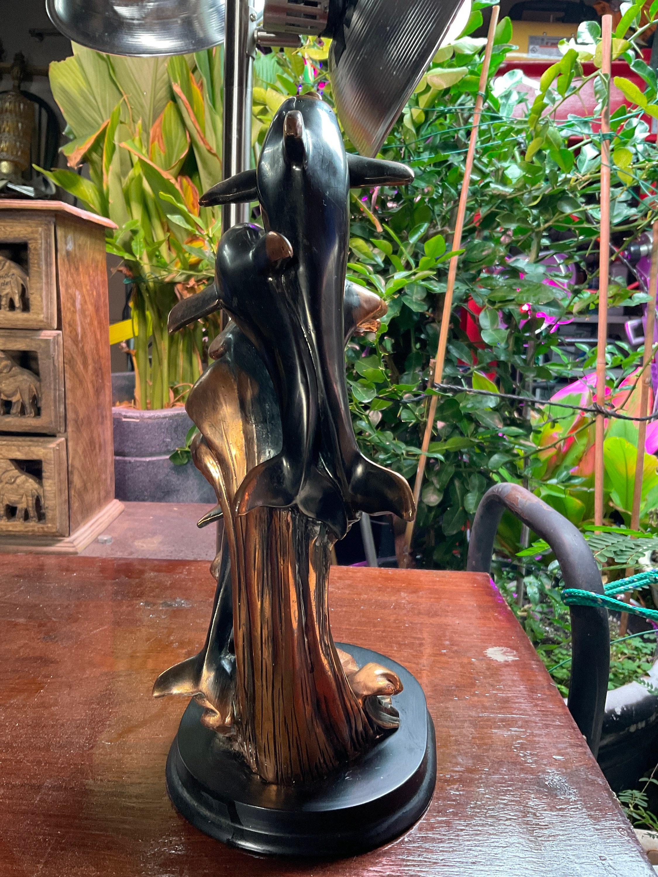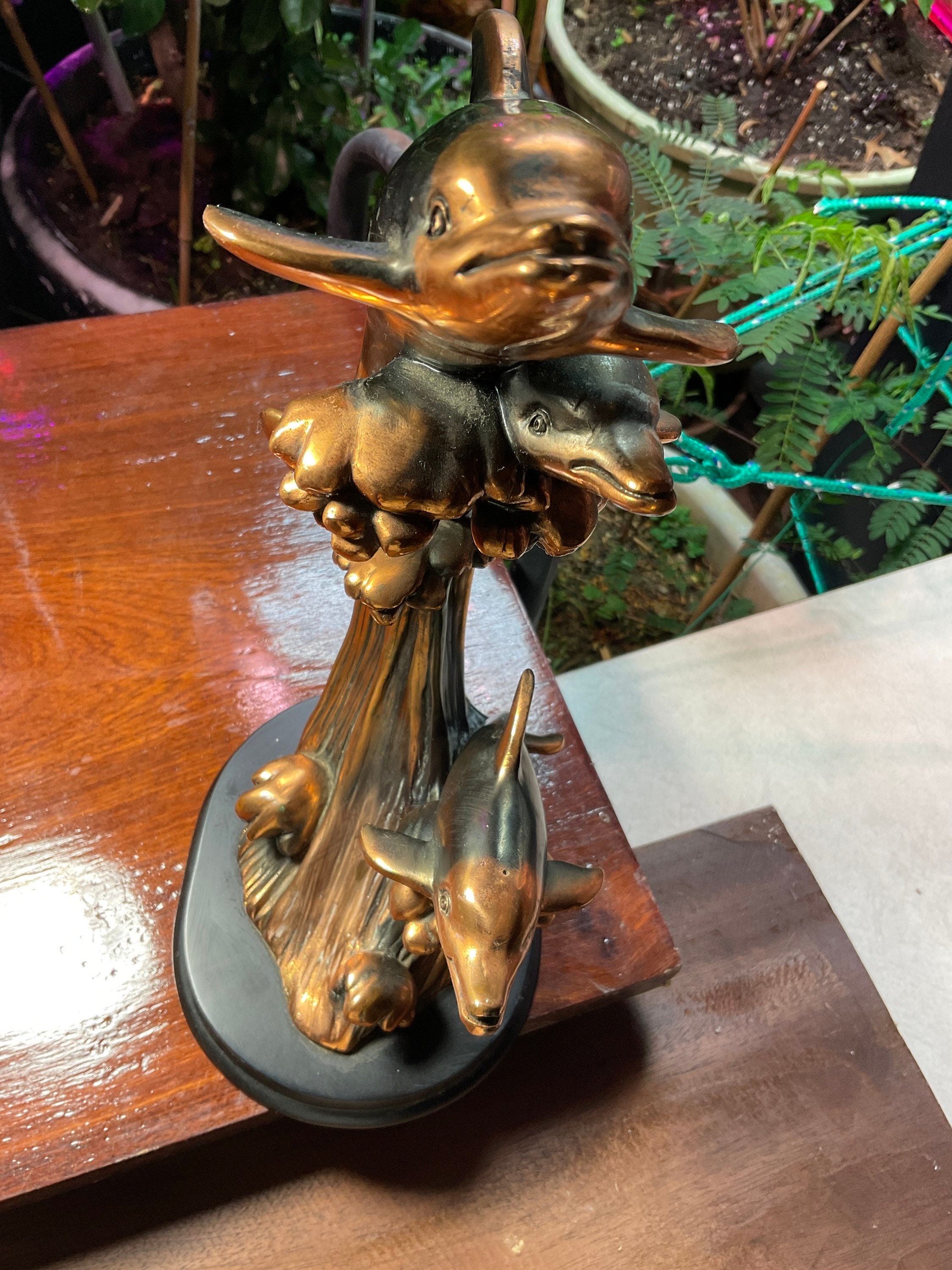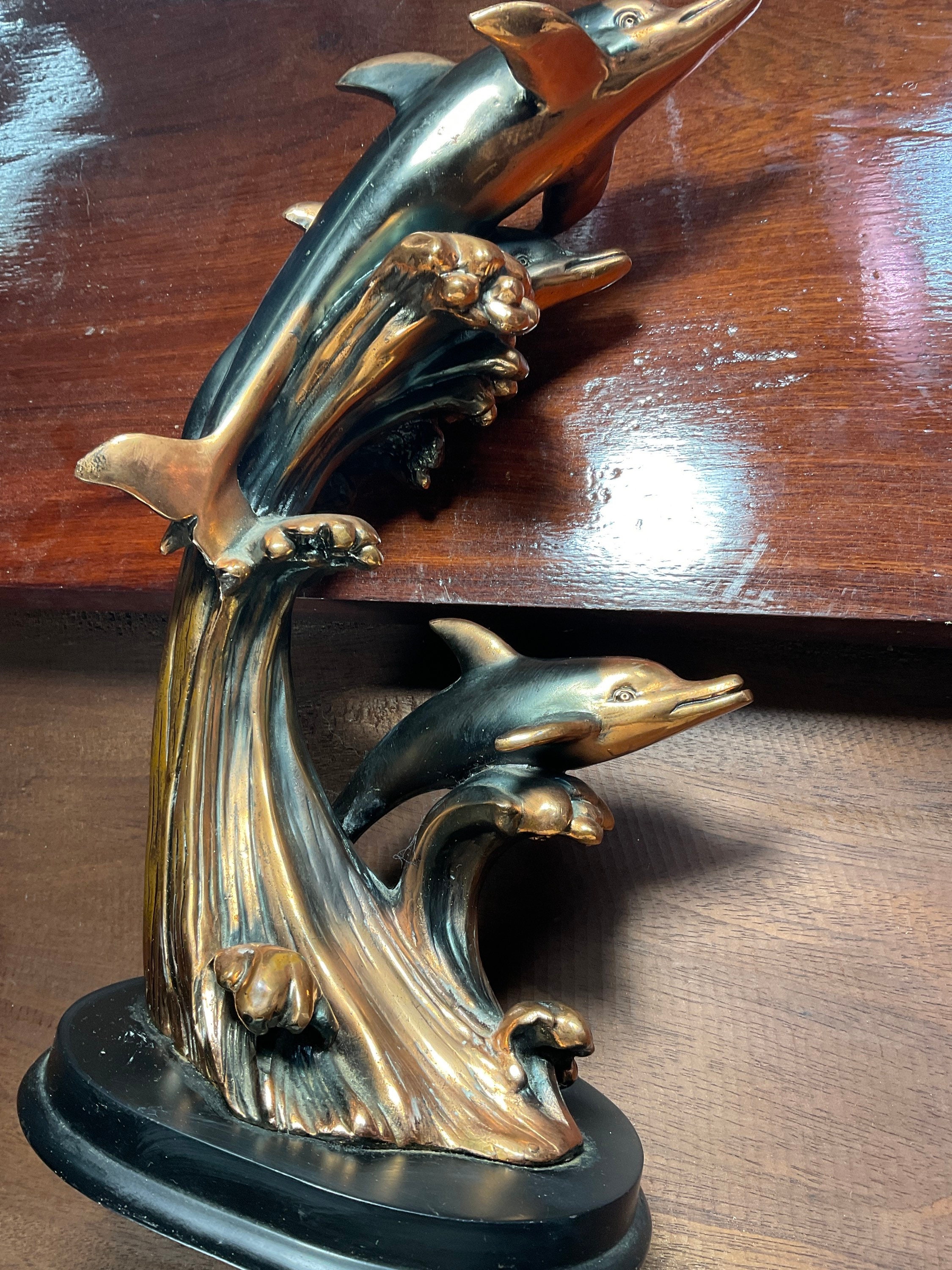 Three vintage gorgeous bottlenose dolphins,riding over big ocean high drops waves, delightful detailed bronze looks without the weight, as they were sculpted from high quality resin, then electroplated with bronze for the final shining finished,adhered to the wooden base, perfect addition to any beach theme office,living room or study rooms decor, will invite “awes”, per delightful featuring of the three free spirited dolphins, playing among the high big ocean wave drops,in fine detail and beautiful bronze finish,sitting over wooden base, just a bit over 13” tall and 5.5” wide.