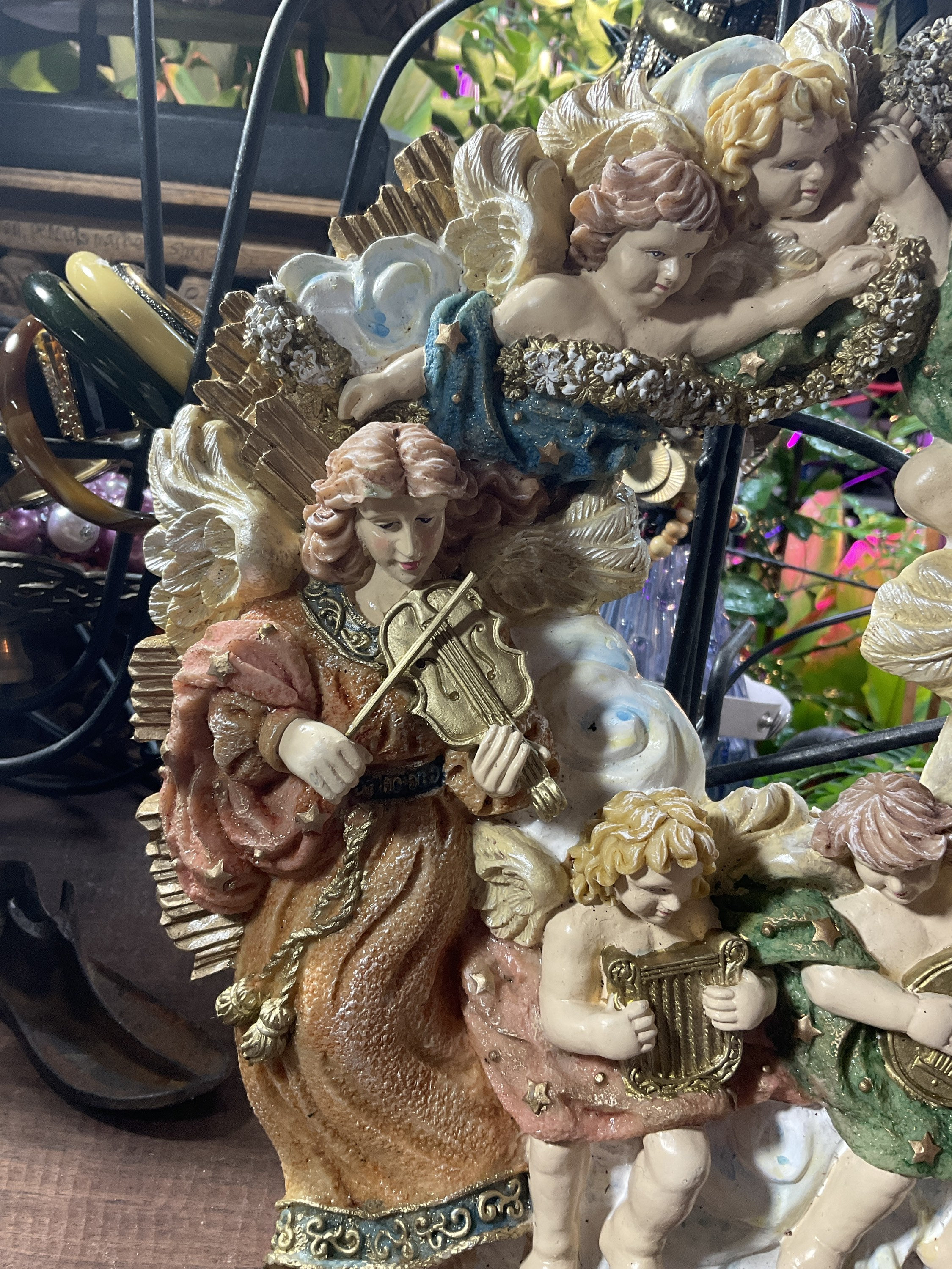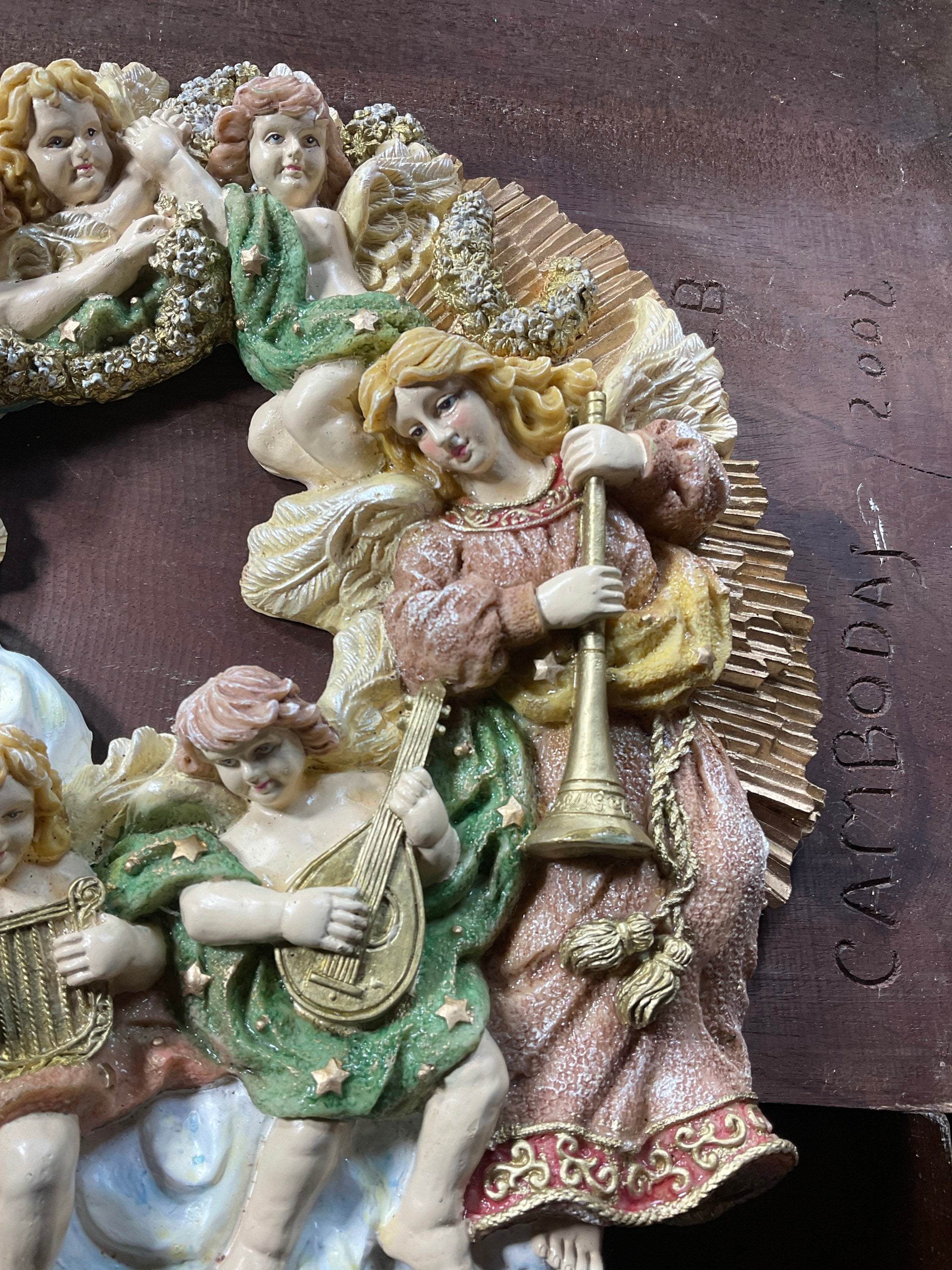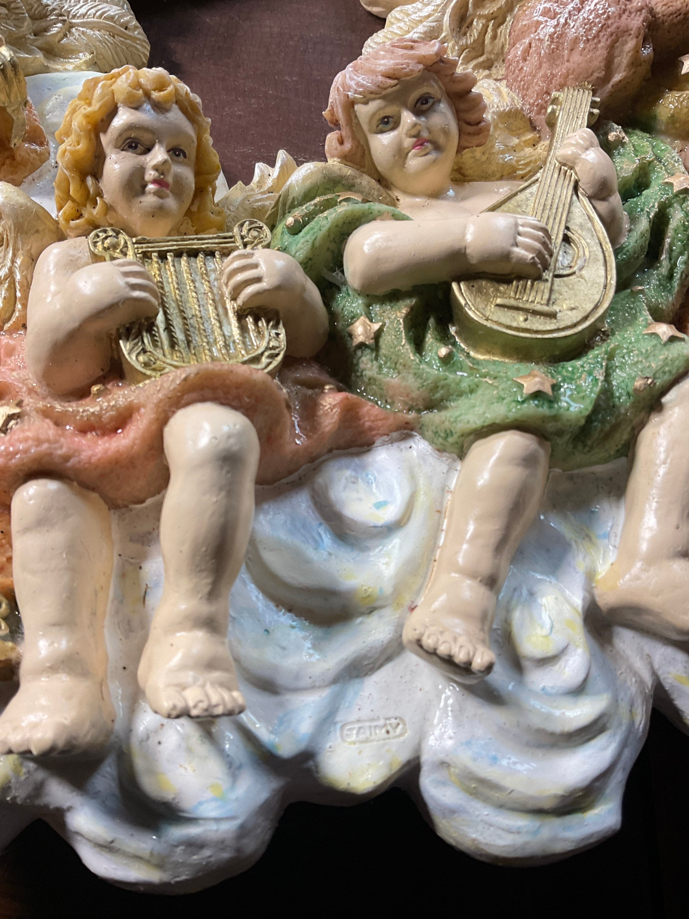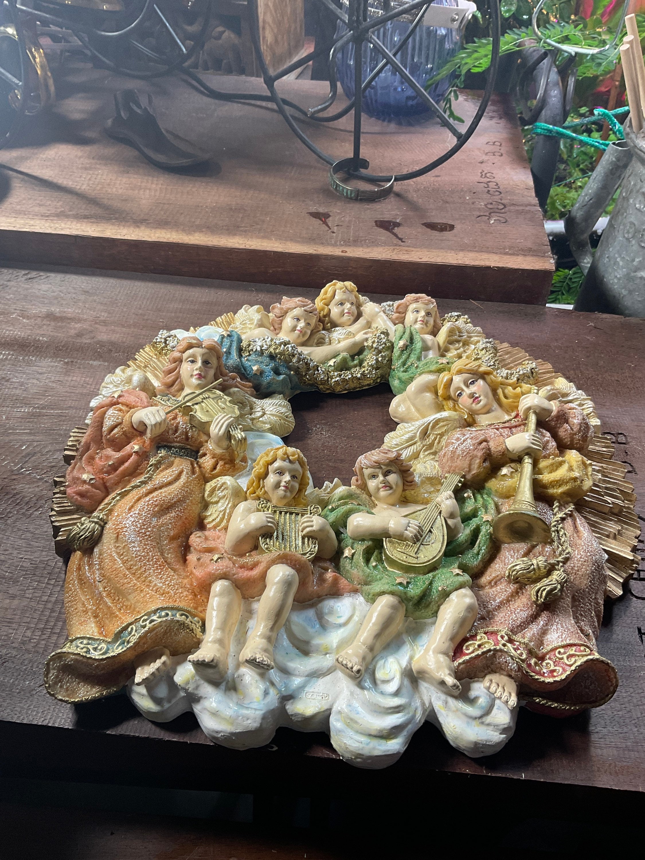 Looking for rare exceptional unique piece, angelic wreath wall hanging holidays decor. The listing is included extraordinary vintage angelic wreath wall art hanging seasonal spiritual holidays decor; crafting from bone ceramic , harden Resin, portraying the cherubs angels, dancing and playing music instruments, including viola, clarinet,violin,autoharp and trumpet, perfectly for house whole centerpiece for the the holidays - spiritual gathering.