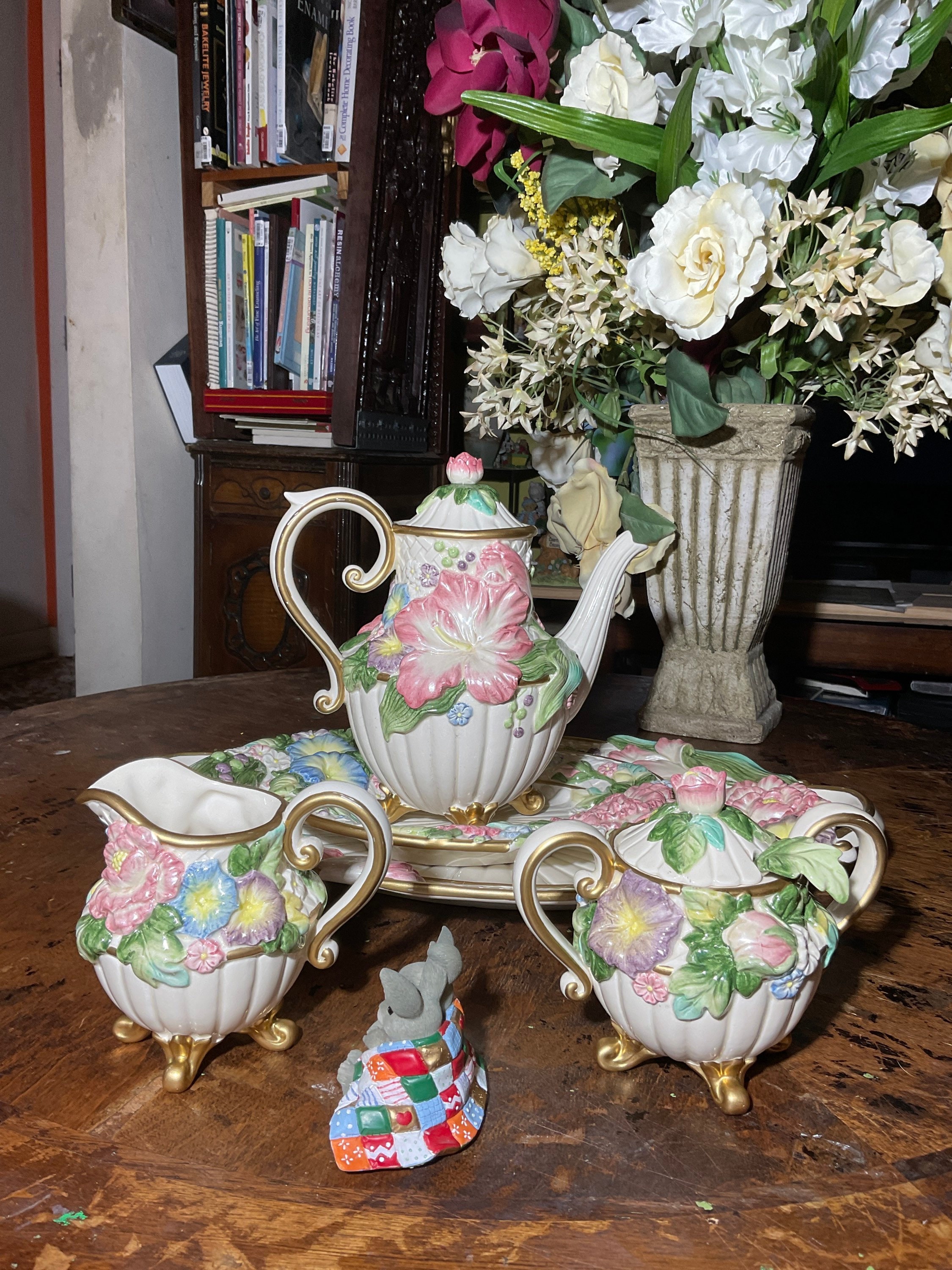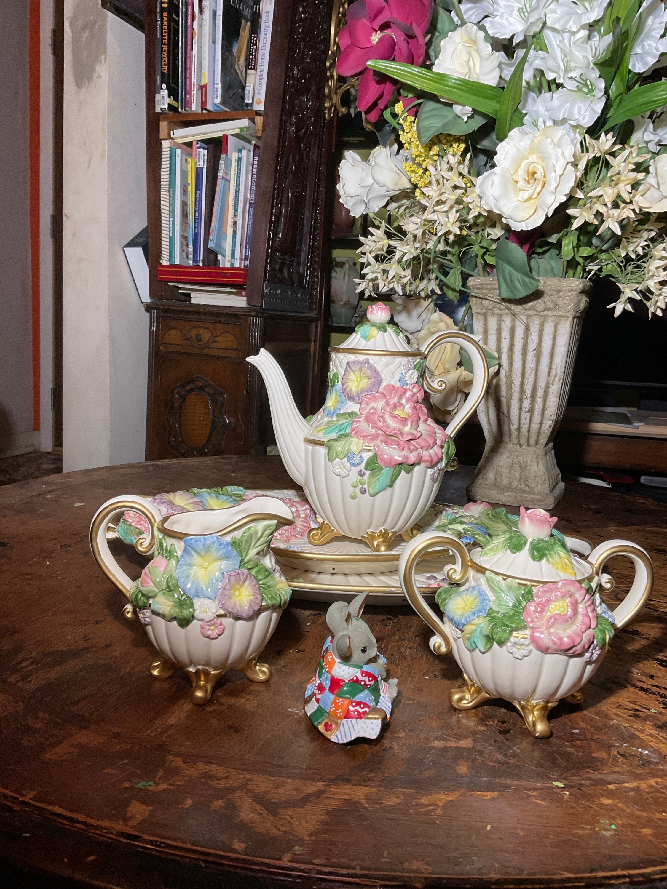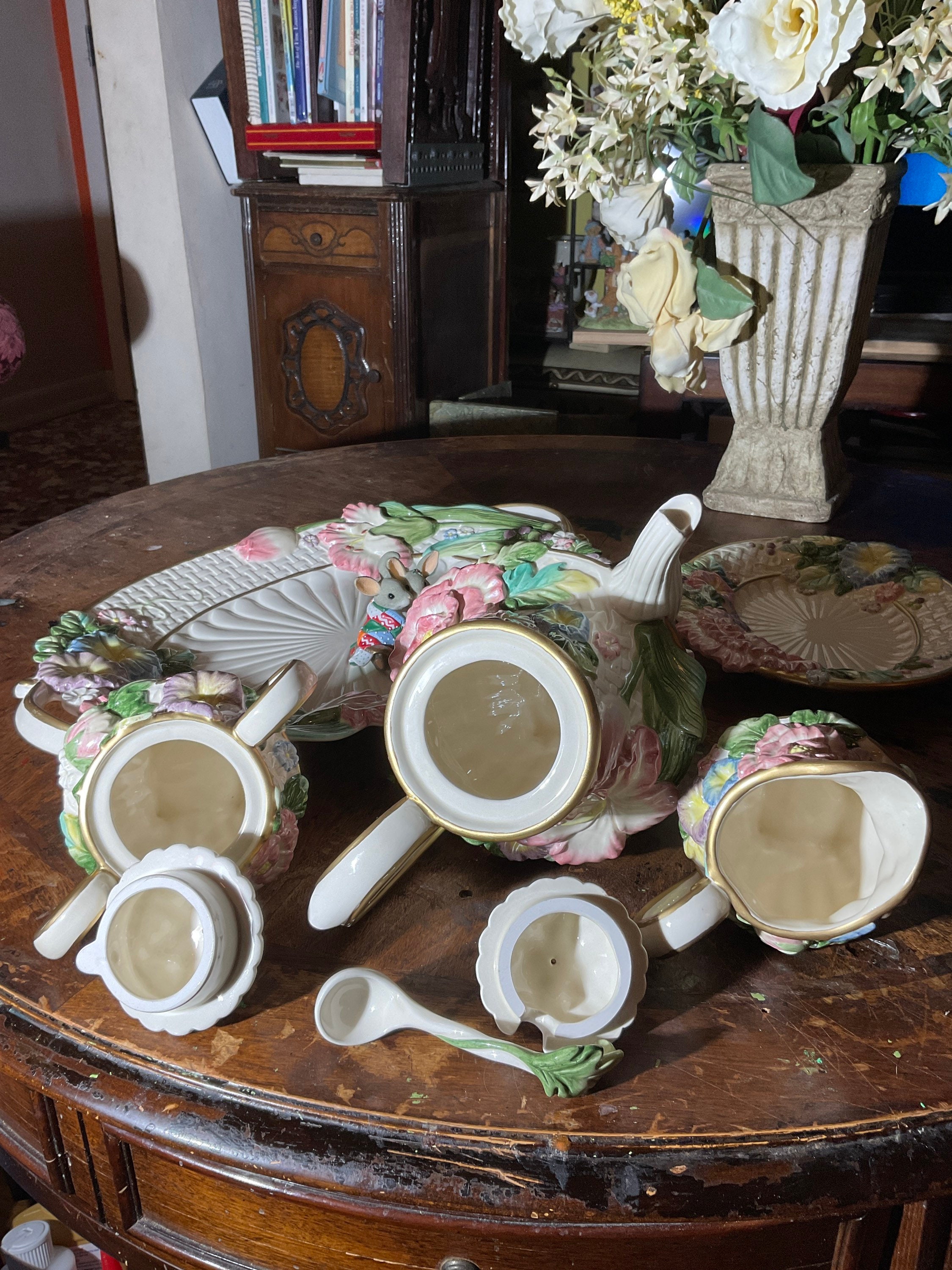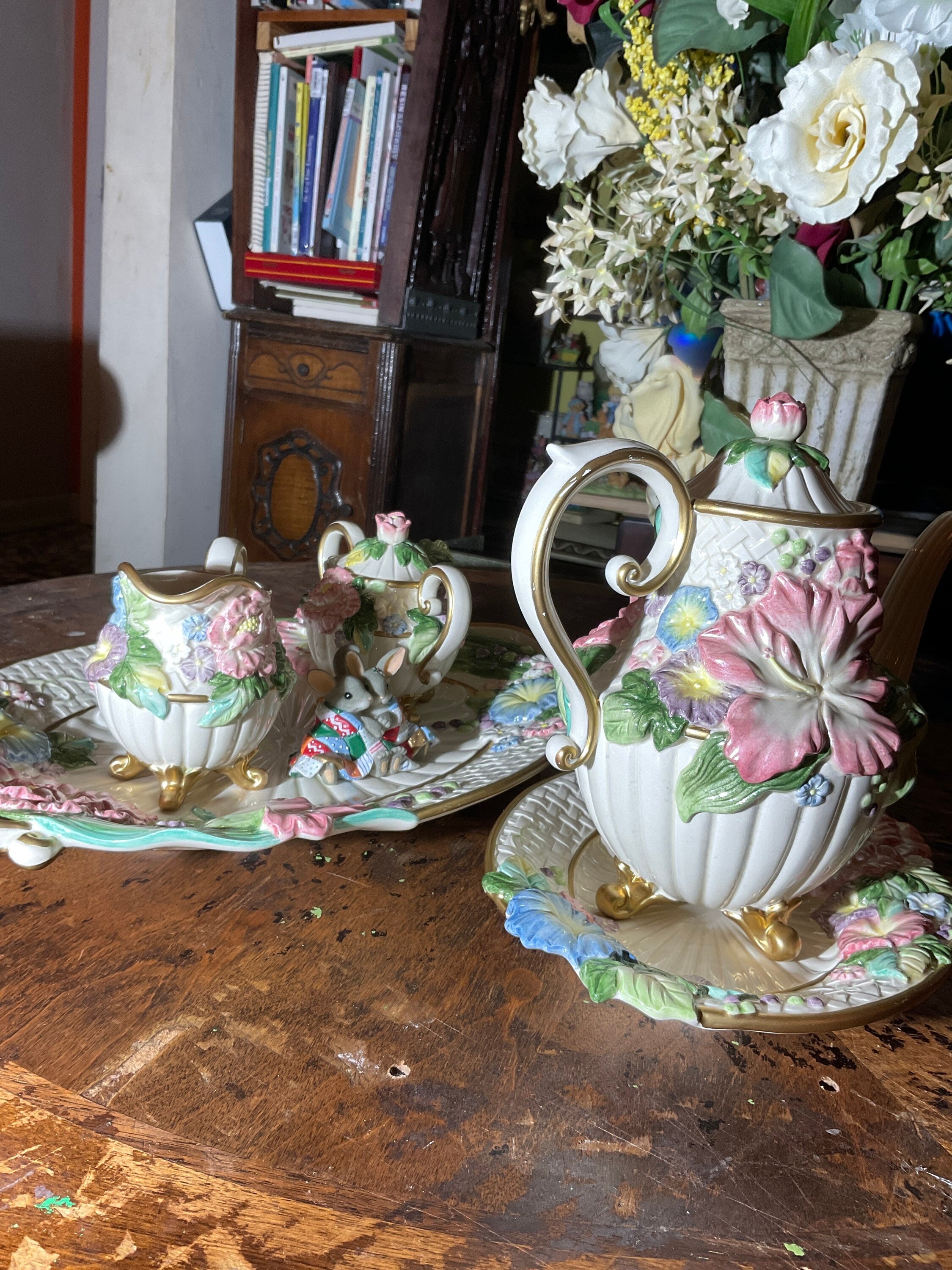 Listing, including Fitz & Floyd 5 pieces tea set and one Millenium (Y2K) Charming Tails You’re My Snuggle Bunny 87/120 limited edition. The tea set was raised embossing florals, gold trim was known as “Les Fleurs”, discontinuing pattern by