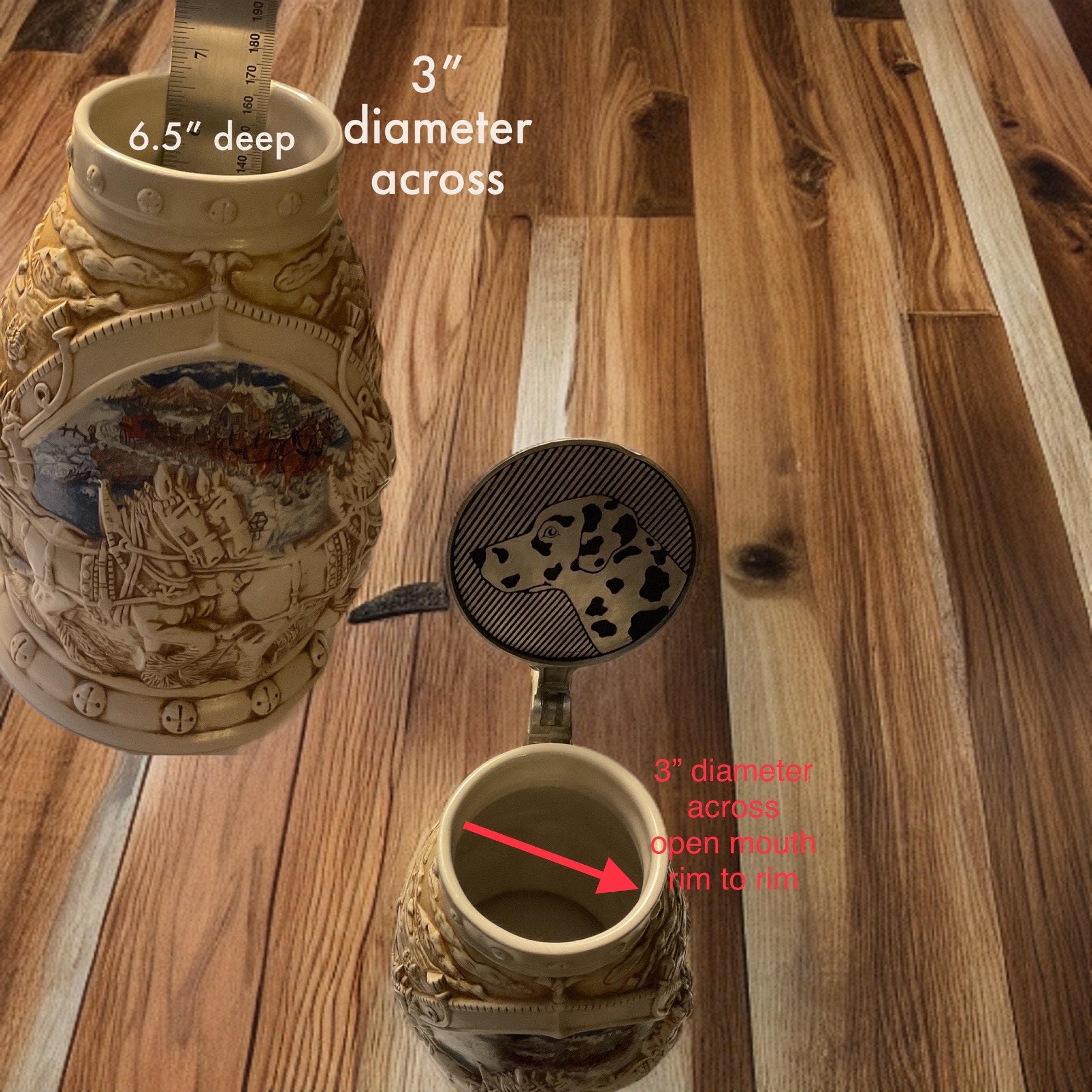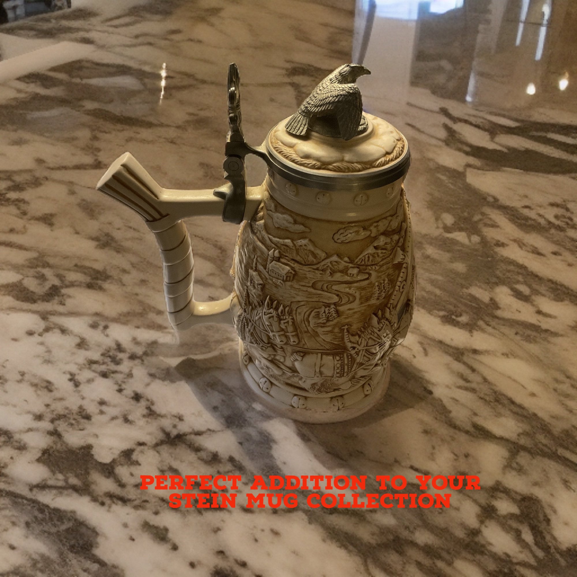 Clydesdale and eagle represent honesty, truth, majesty, strength, courage, wisdom, power and freedom. The stein mug designer seemed to give every decorative ornament two purposes, functionality and beauty. The eagle is resting on the lid,its eyes are roaming the sky regardless the lid is closed or opened,as the function of this eagle. The fleur de lis over the pewter hinge ,also as beauty and functionality for opening/closing the stein mug lid. The decorative foreground on the stein mug, beautifully molded -raised embossed Famous Clydesdale breeding horses, originated from Lanarkshire,Scotland for farm and industrial work , working as draught horses, Horse-Drawn Logging Wagon, commanding by one or two elderly logging wagon drivers.The decorative background, looking as scattering village house along the mountain sides under the cloudy day ,as the Famous Clydesdale breeds, working with their drivers ,getting horse-drawn logging wagon, full of Christmas trees like foreground.All in creamy beige colored scenery. On the opposite side of the handle, the mid ground looks as the entrance and the scenery of Budweiser Clydesdales with eight horses under the blue cloudy sky,where the road is buried with snow. Overall scenery is about the representation at the museum world famous Clydesdale .