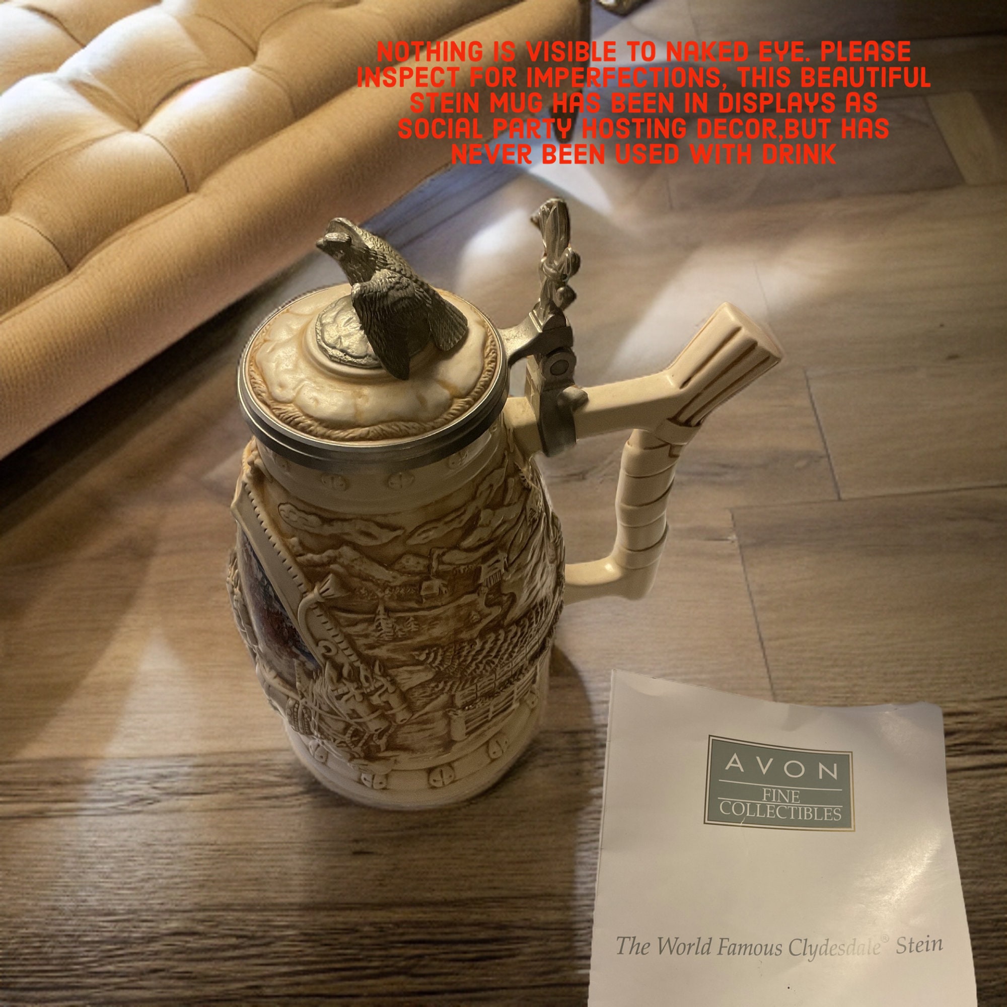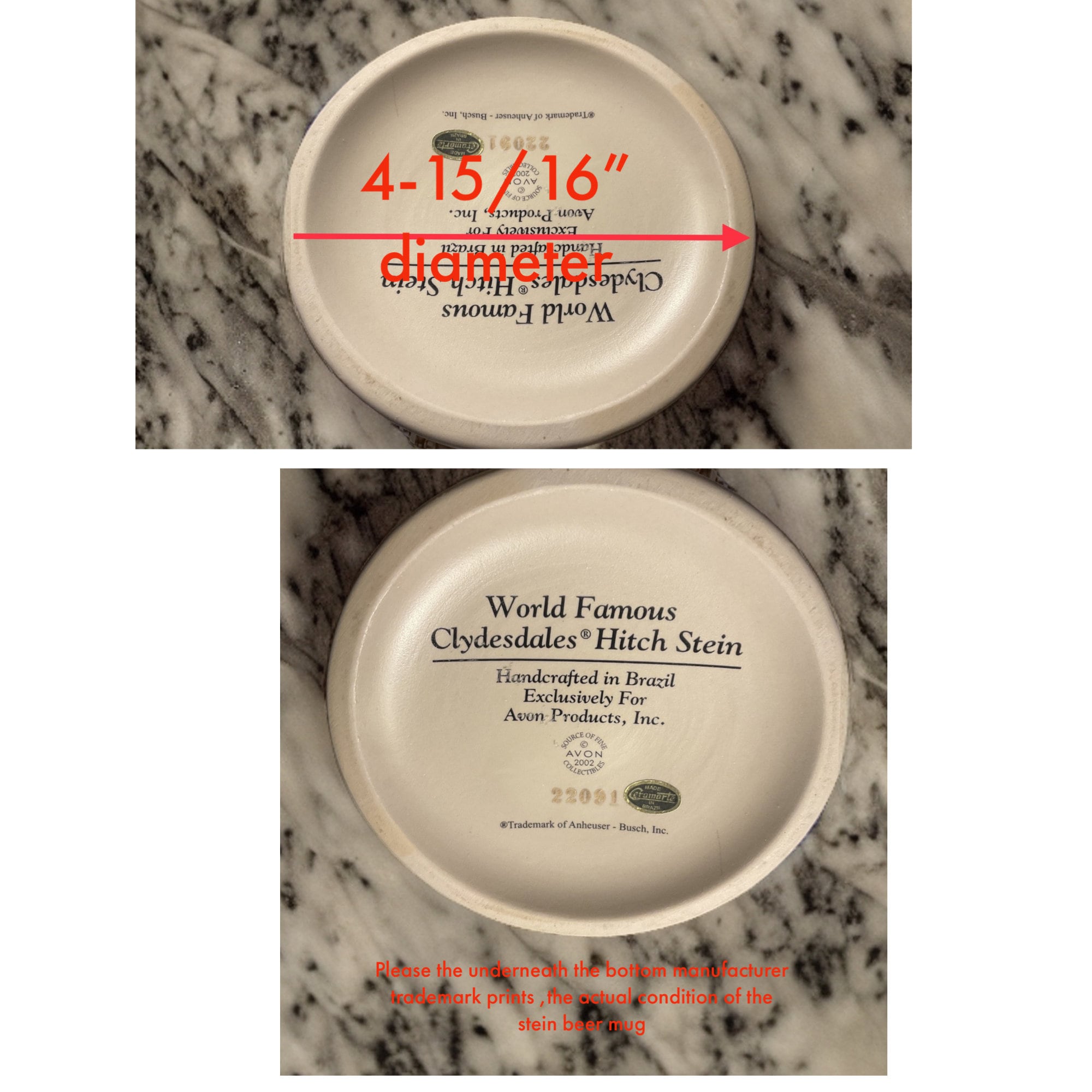 Listing is for one Ceramic Beer Stein footed mug with metal lid, titled “World Famous Clydesdale Hitch Stein by Cremate Anheuser Busch Avon 2002” Handcrafted in Brazil Exclusively For Avon Products,Inc.