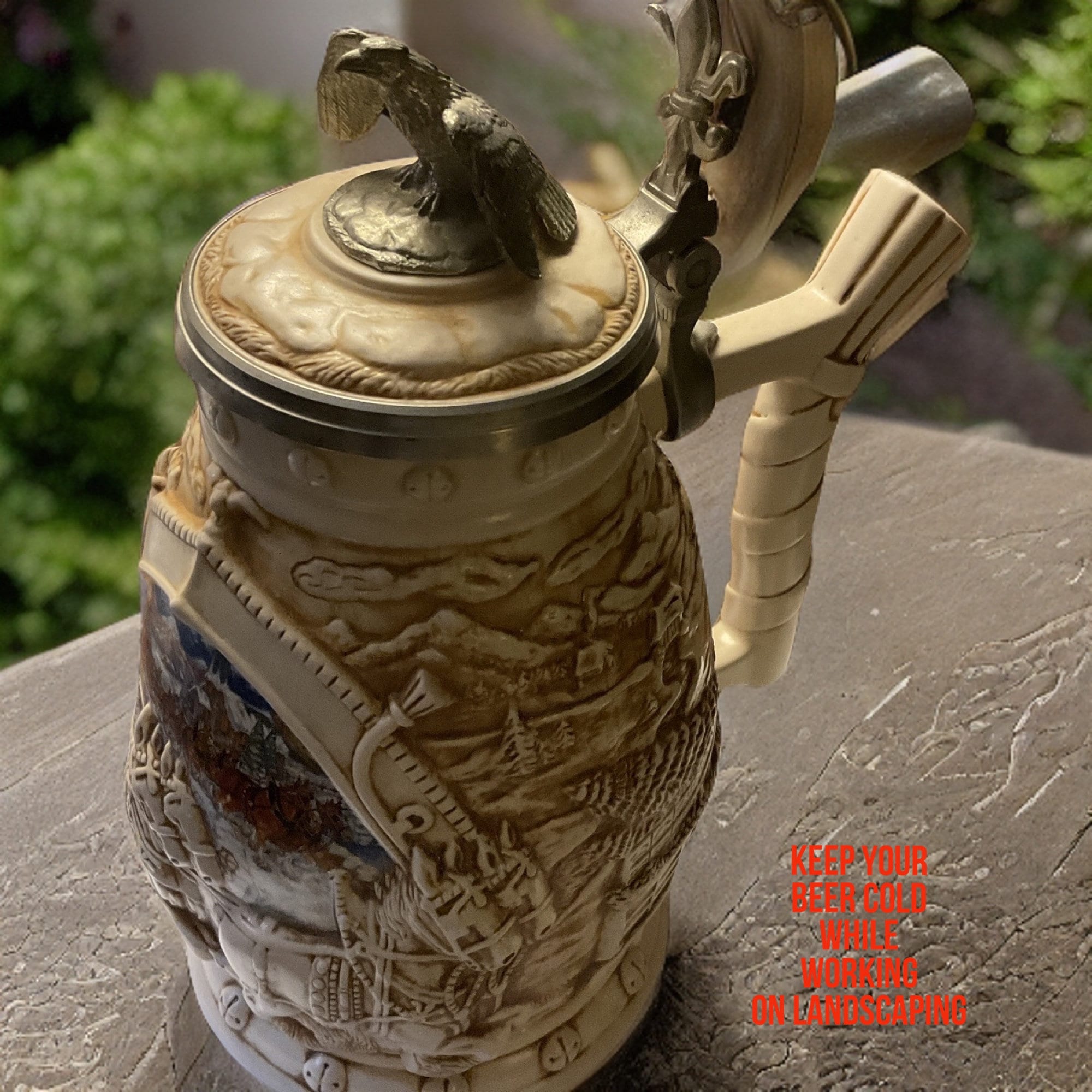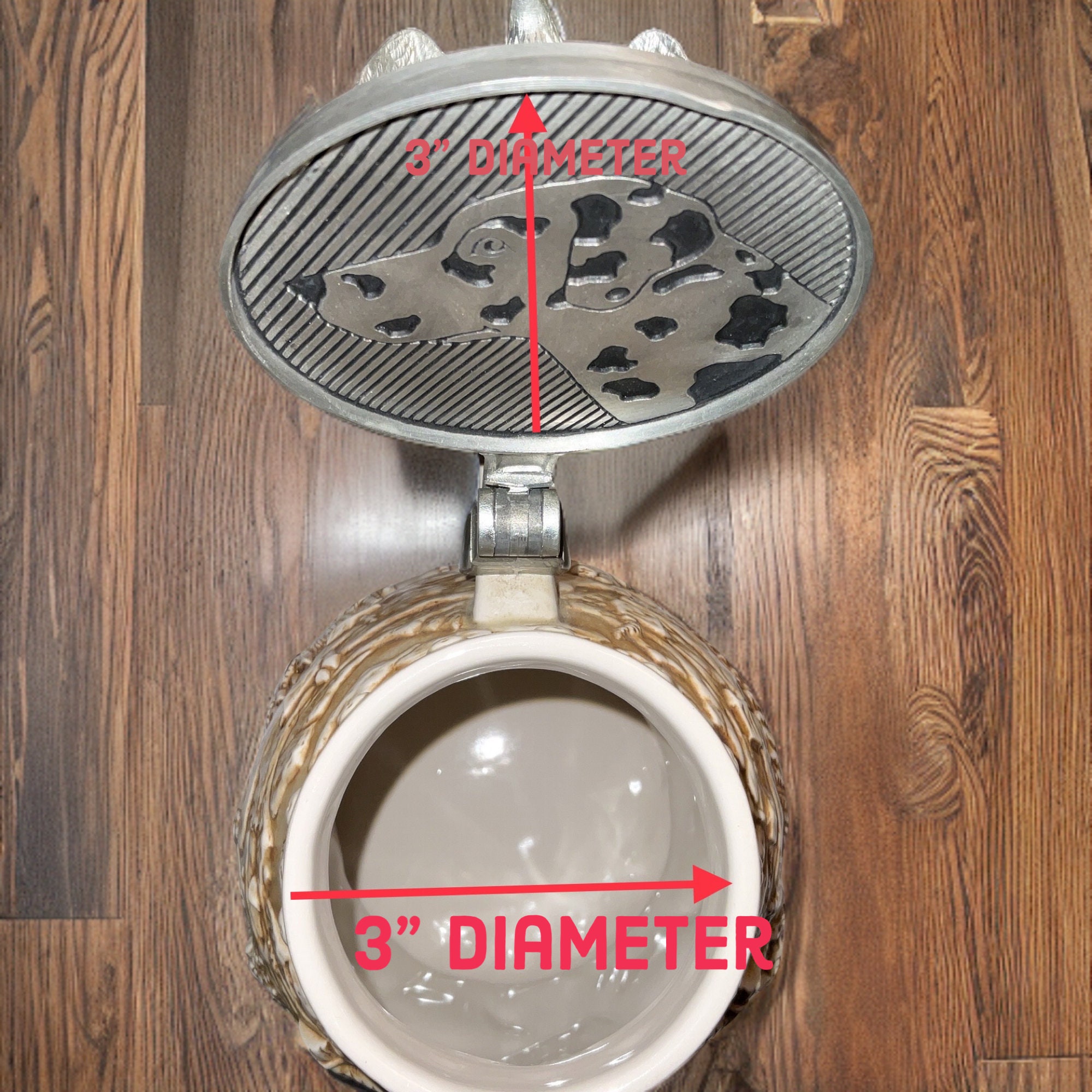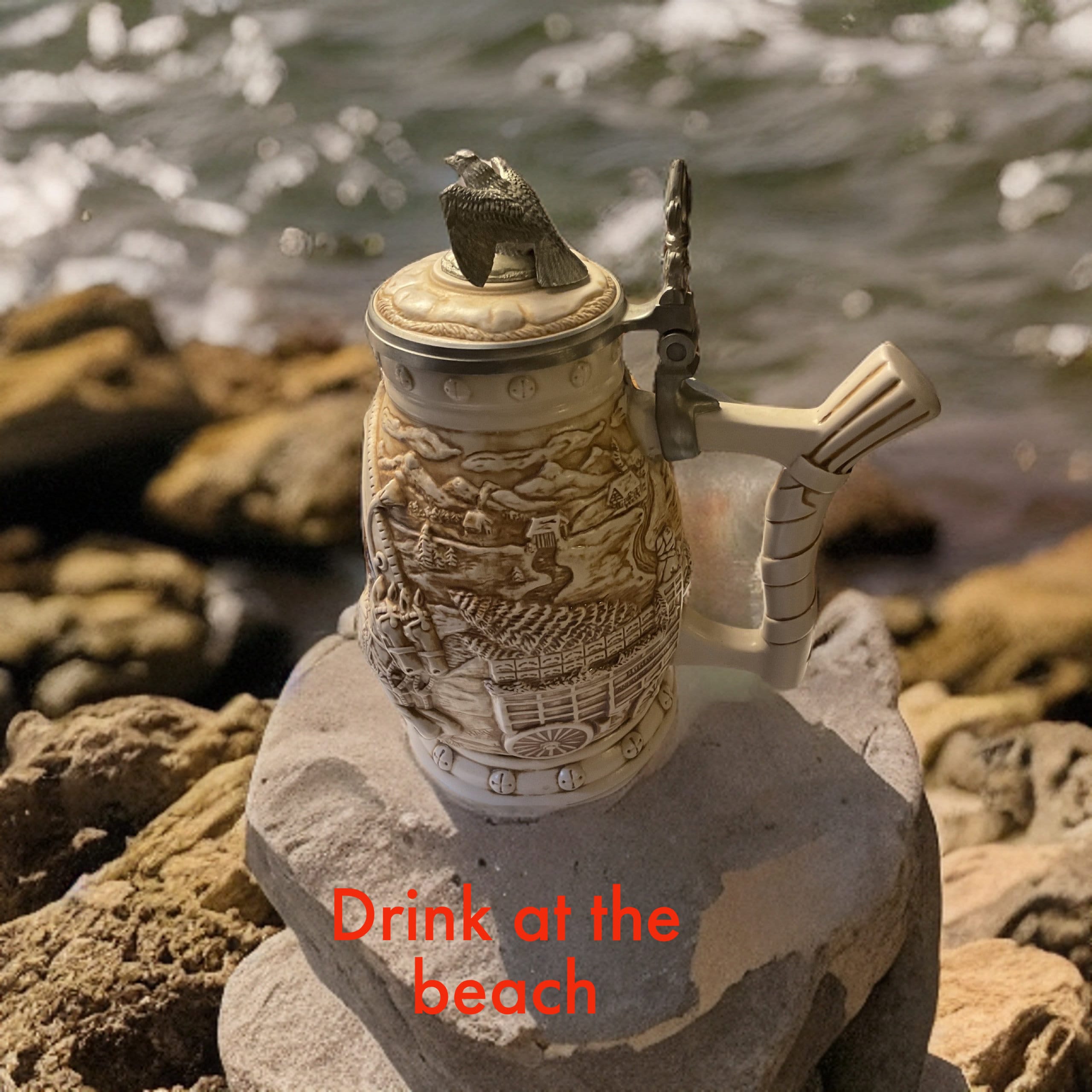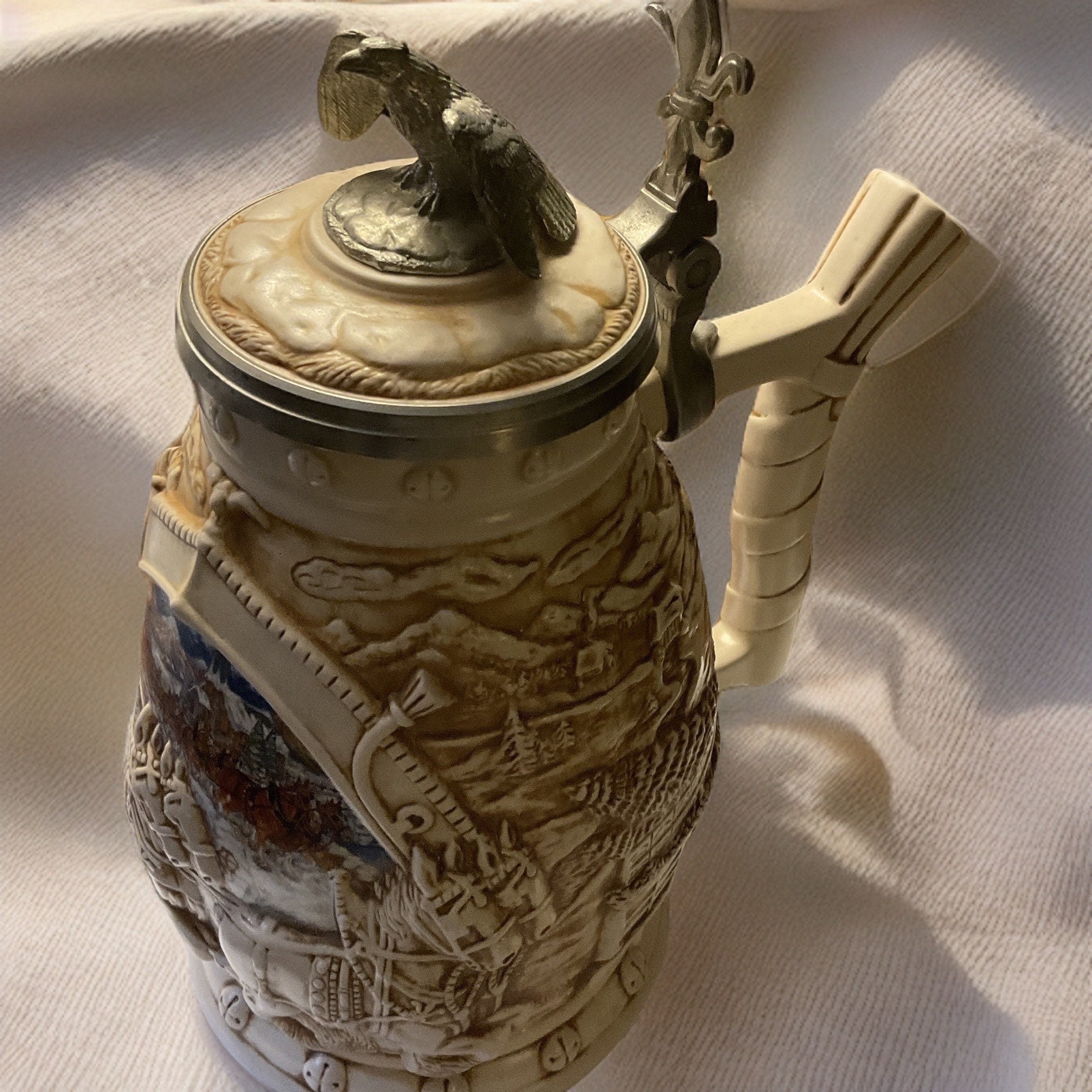 This World Famous Clydesdale Hitch Stein by Cremate Anheuser Busch Avon 2002”, the lid topped with ceramic rocky liked ocean scene outer looking top inside the pewter metal with lines and dog shoulder-head underneath,and sitting, with sitting eagle as lid picking up capitol. The gorgeous woven ceramic handle ,top side was pushed against the body of stein mug side body ,1-1/2” from the rim,and lower part of handle was pushed into ceramic stein mug body at about 1-1/2” from the lowest rim of stein ceramic mug . Then pewter hinged,topping with Fleur-de-lis over hinge for easy pushing the lid up or down.