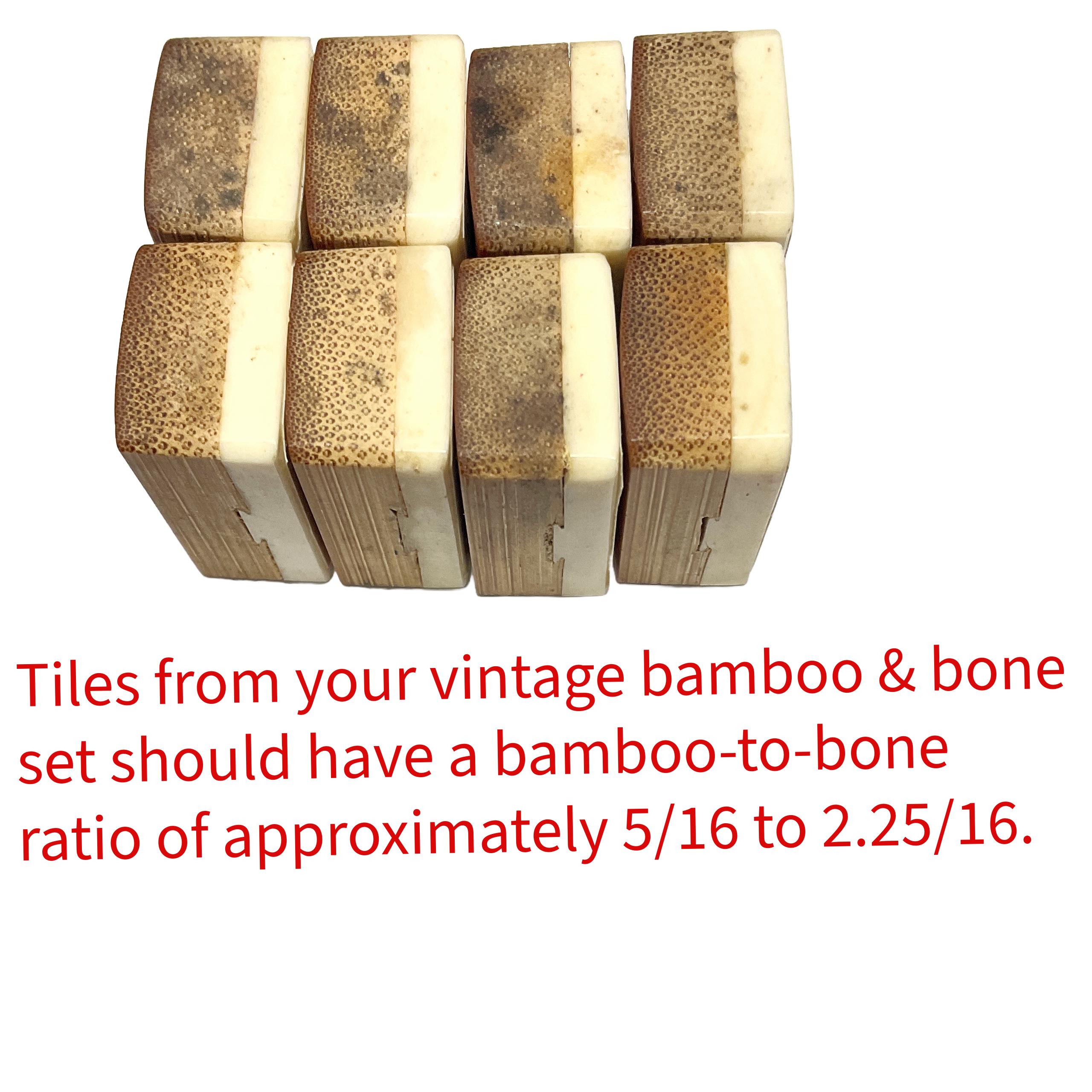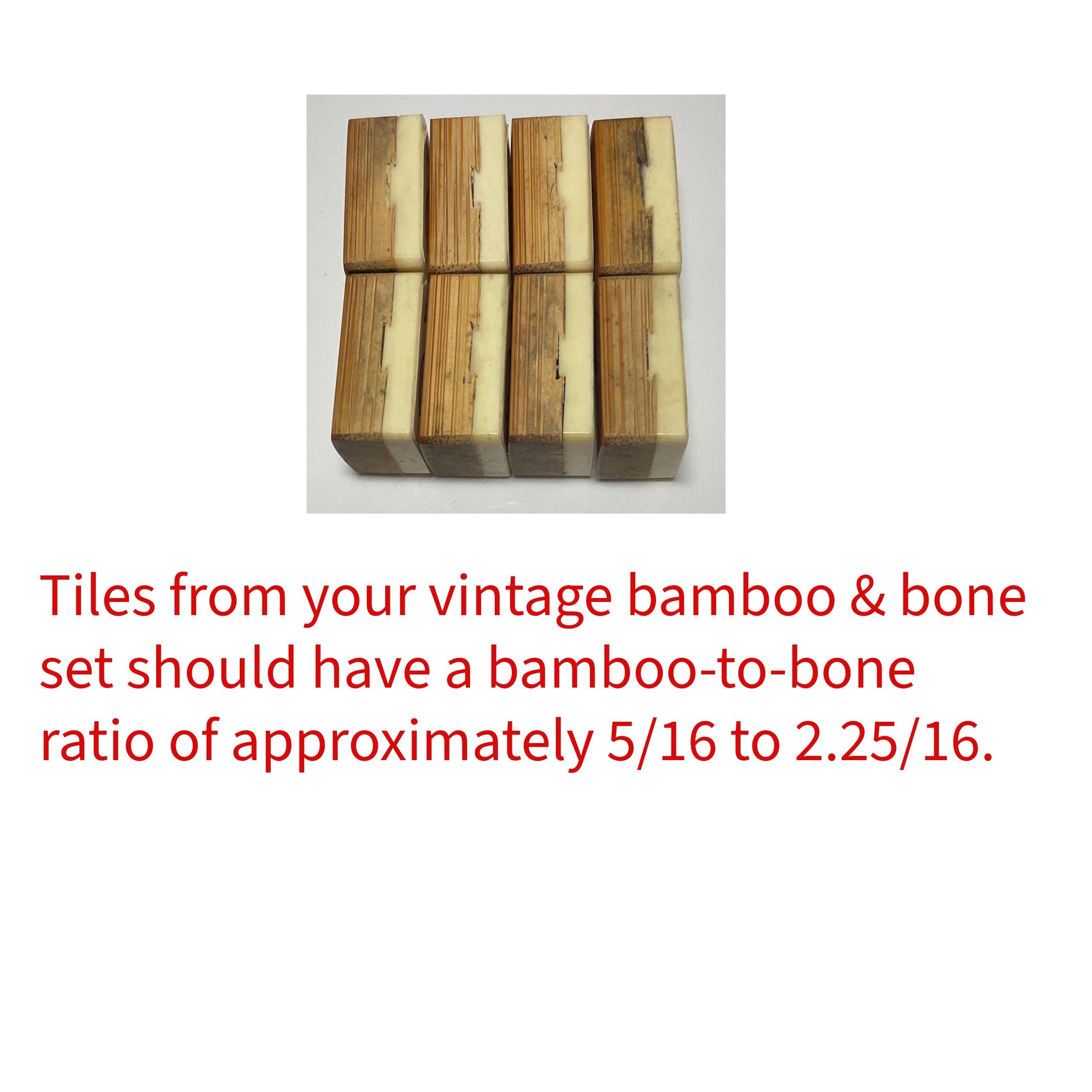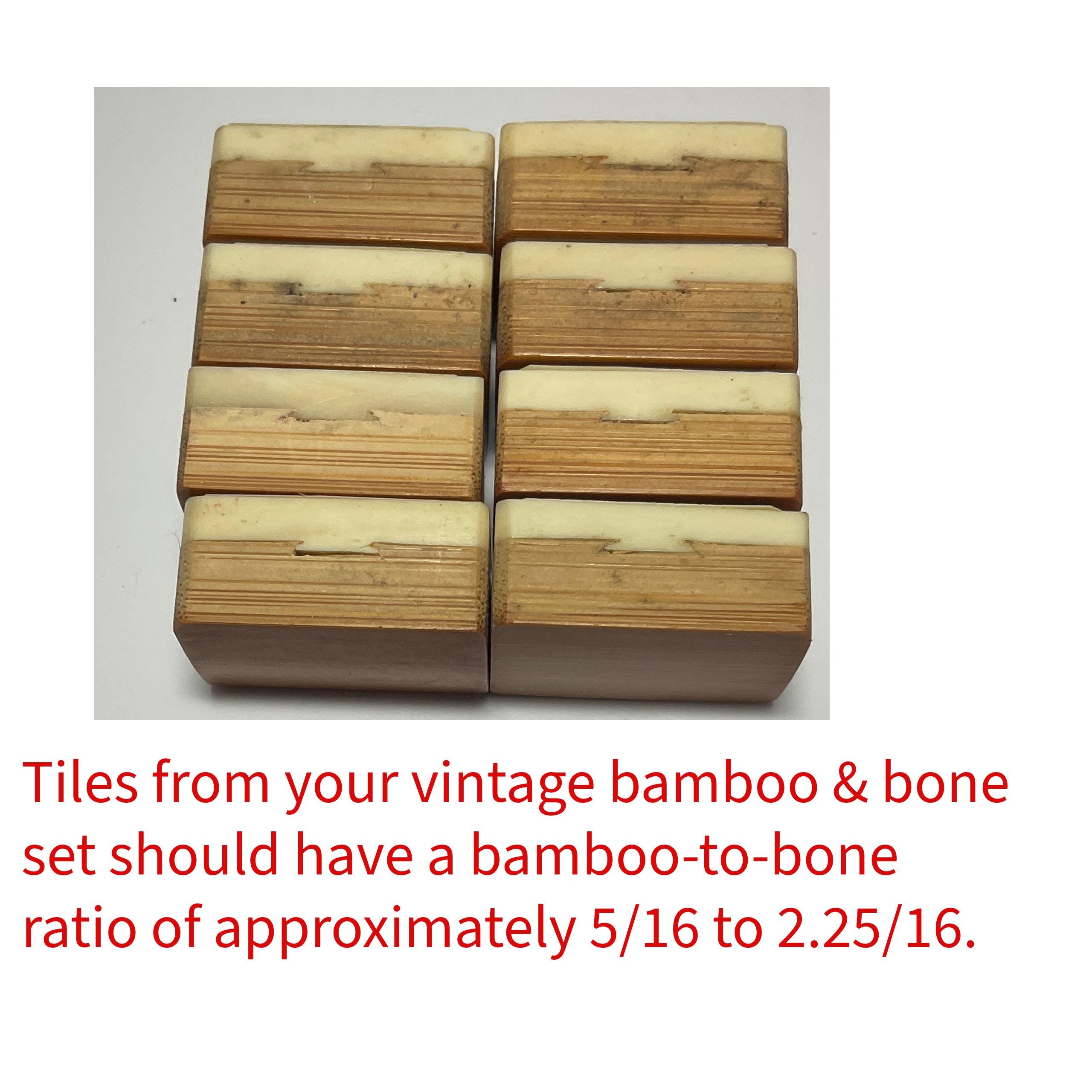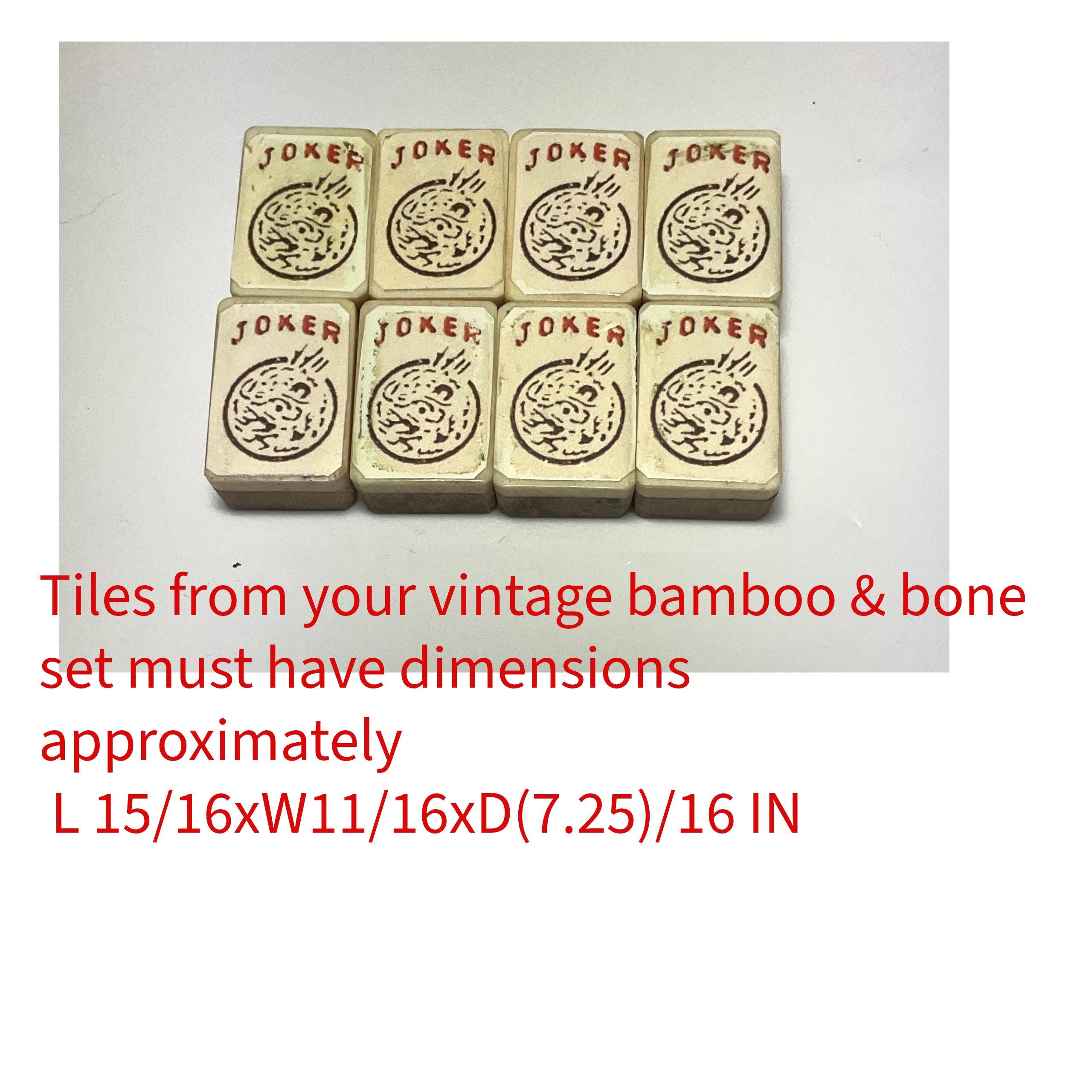 Each tile measures approximately L 15/16” × W 11/16” × D 7.25/16” ,bamboo-to-bone ratio of approximately 5/16 to 2.25/16, and is carefully selected from original 1920s dovetailed Bamboo & Bone sets. These tiles are ideal replacements for missing jokers and help restore your cherished set to full gameplay readiness.