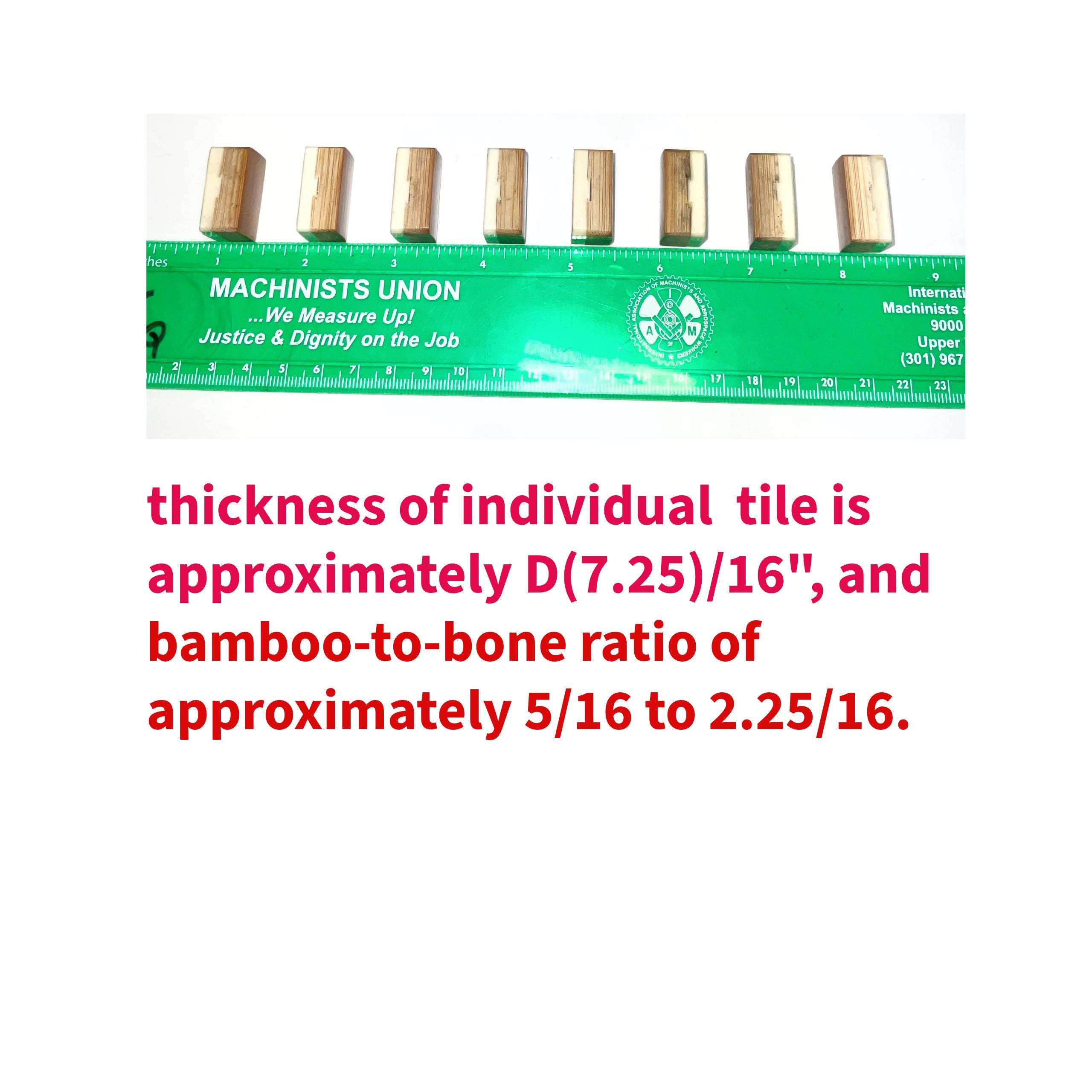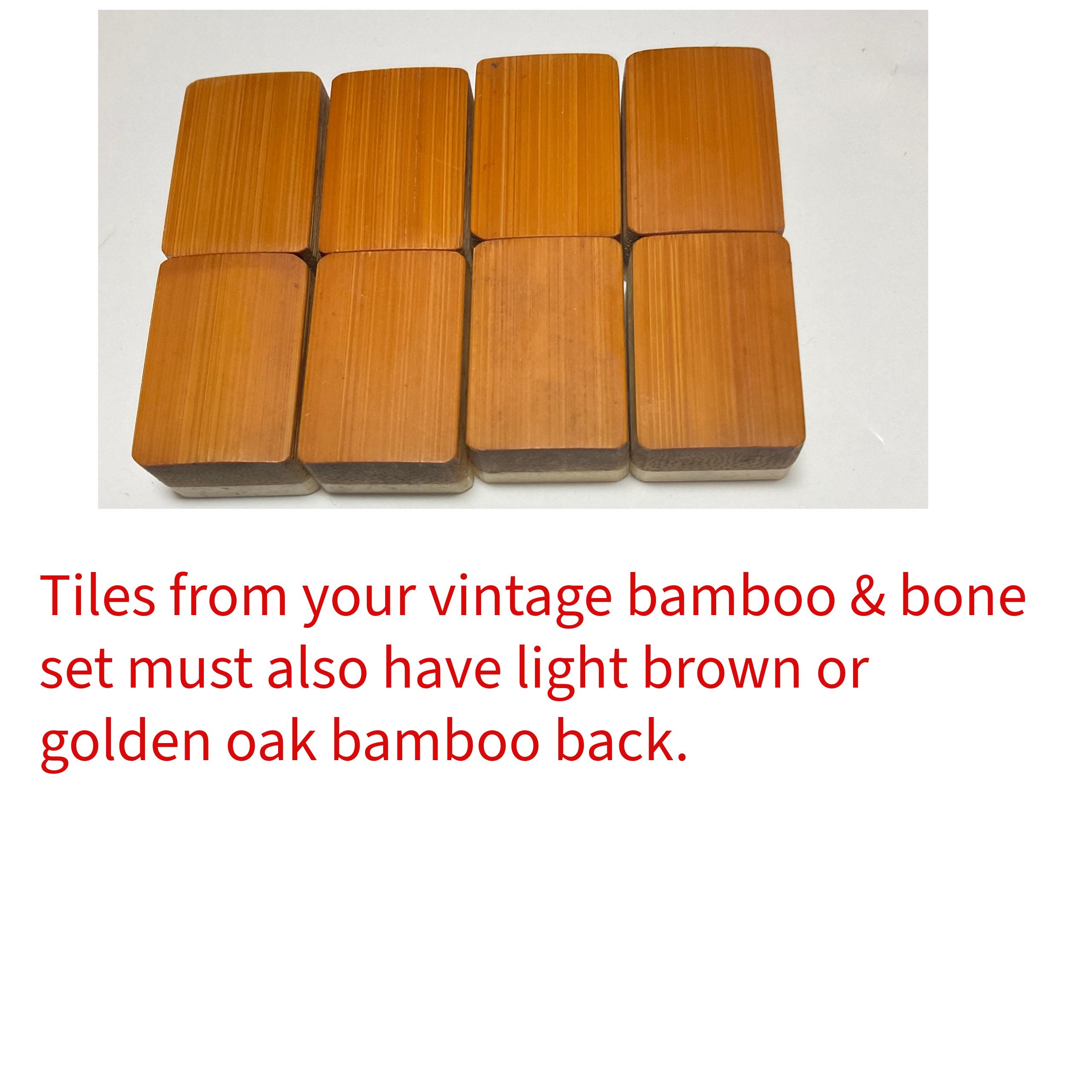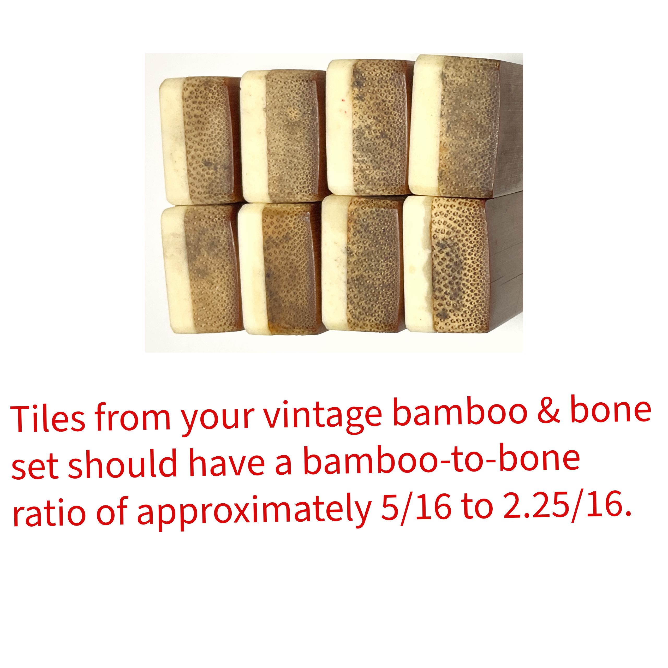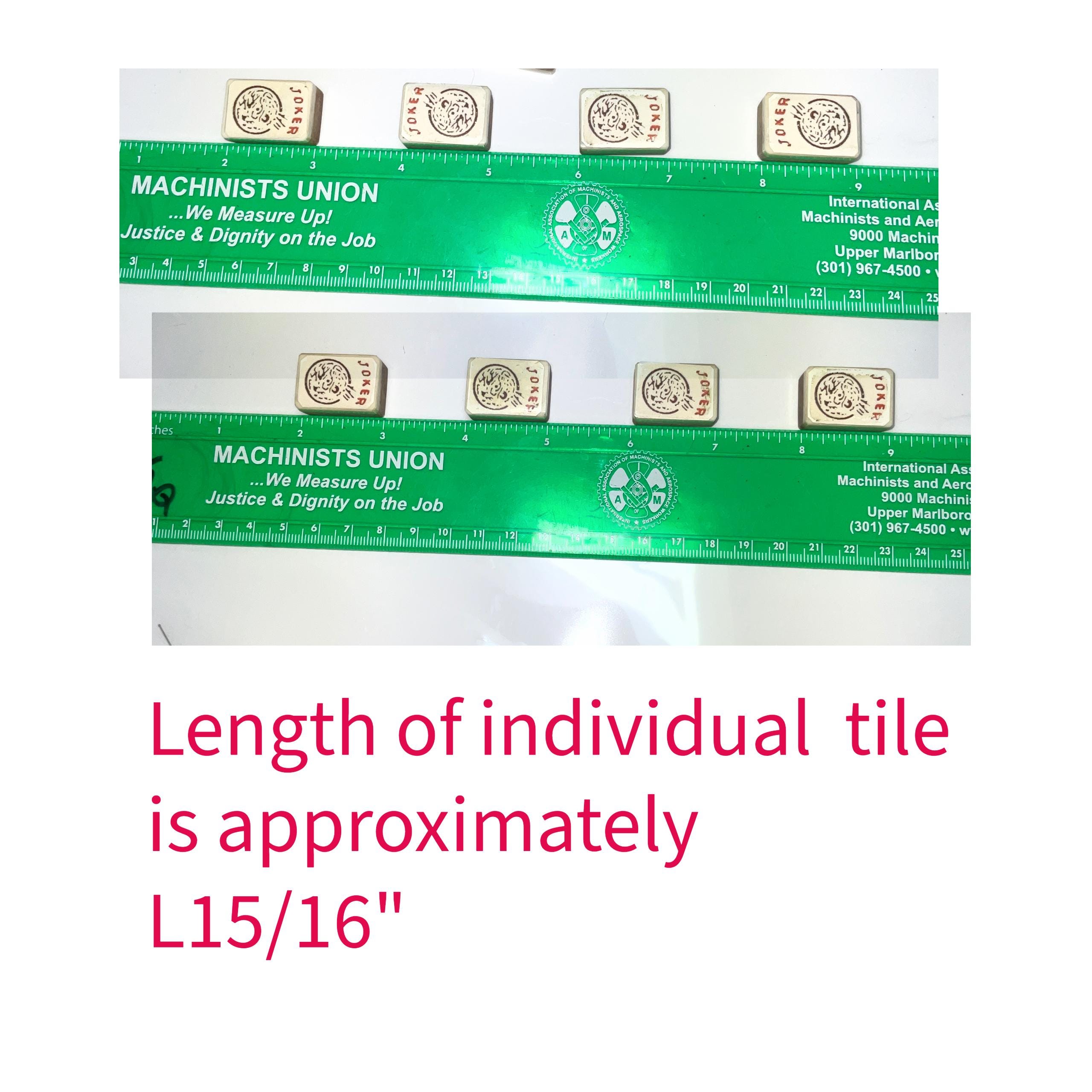 Each tile measures approximately L 15/16” × W 11/16” × D 7.25/16” ,bamboo-to-bone ratio of approximately 5/16 to 2.25/16, and is carefully selected from original 1920s dovetailed Bamboo & Bone sets. These tiles are ideal replacements for missing jokers and help restore your cherished set to full gameplay readiness.