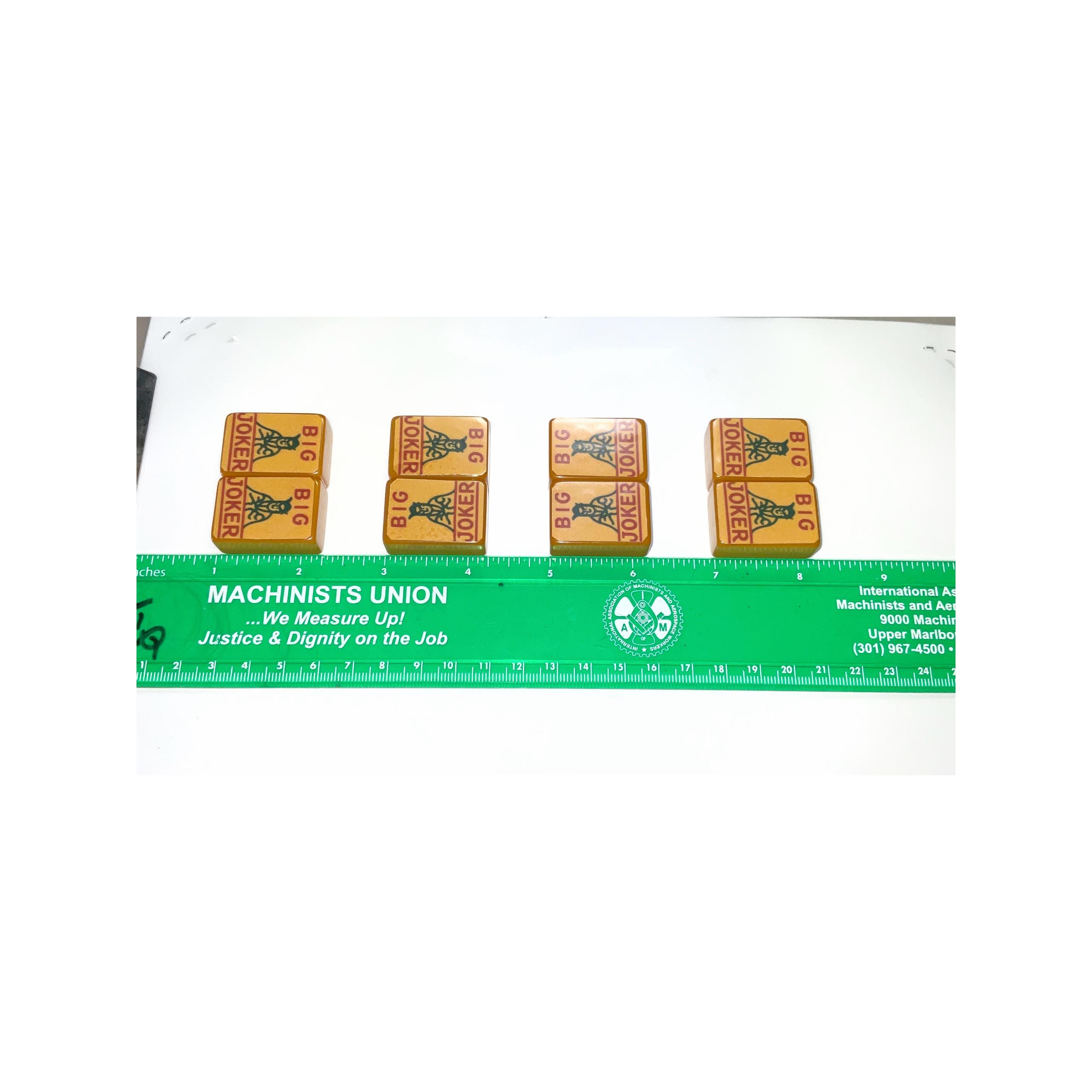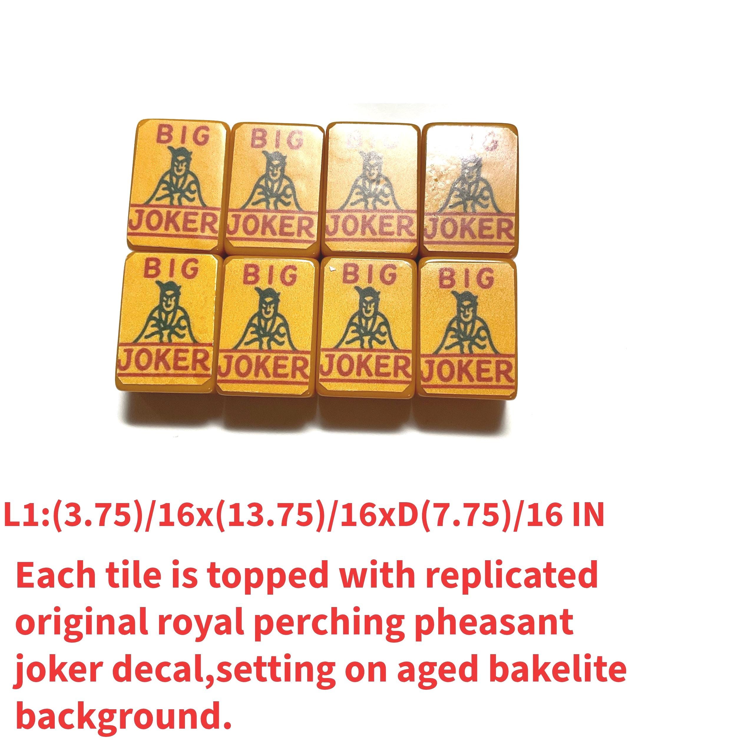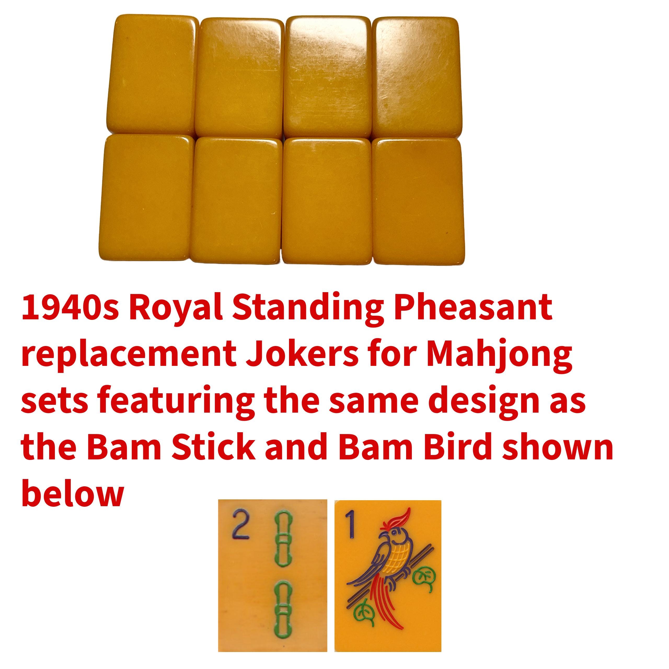 I’m proud to offer a rare set of 8 Royal Standing Pheasant Mahjong replacement Joker tiles. Each tile is crafted from opaque “apple juice” Bakelite and topped with a high-gloss vinyl sticker featuring a detailed replica of the original Royal-manufactured Joker decal, set against a satin-sheen golden apple juice background. These tiles are thoughtfully designed to blend beautifully with aged Bakelite sets—perfect for completing your cherished vintage Royal Standing Pheasant Mahjong set for American/National Mah Jongg League gameplay.