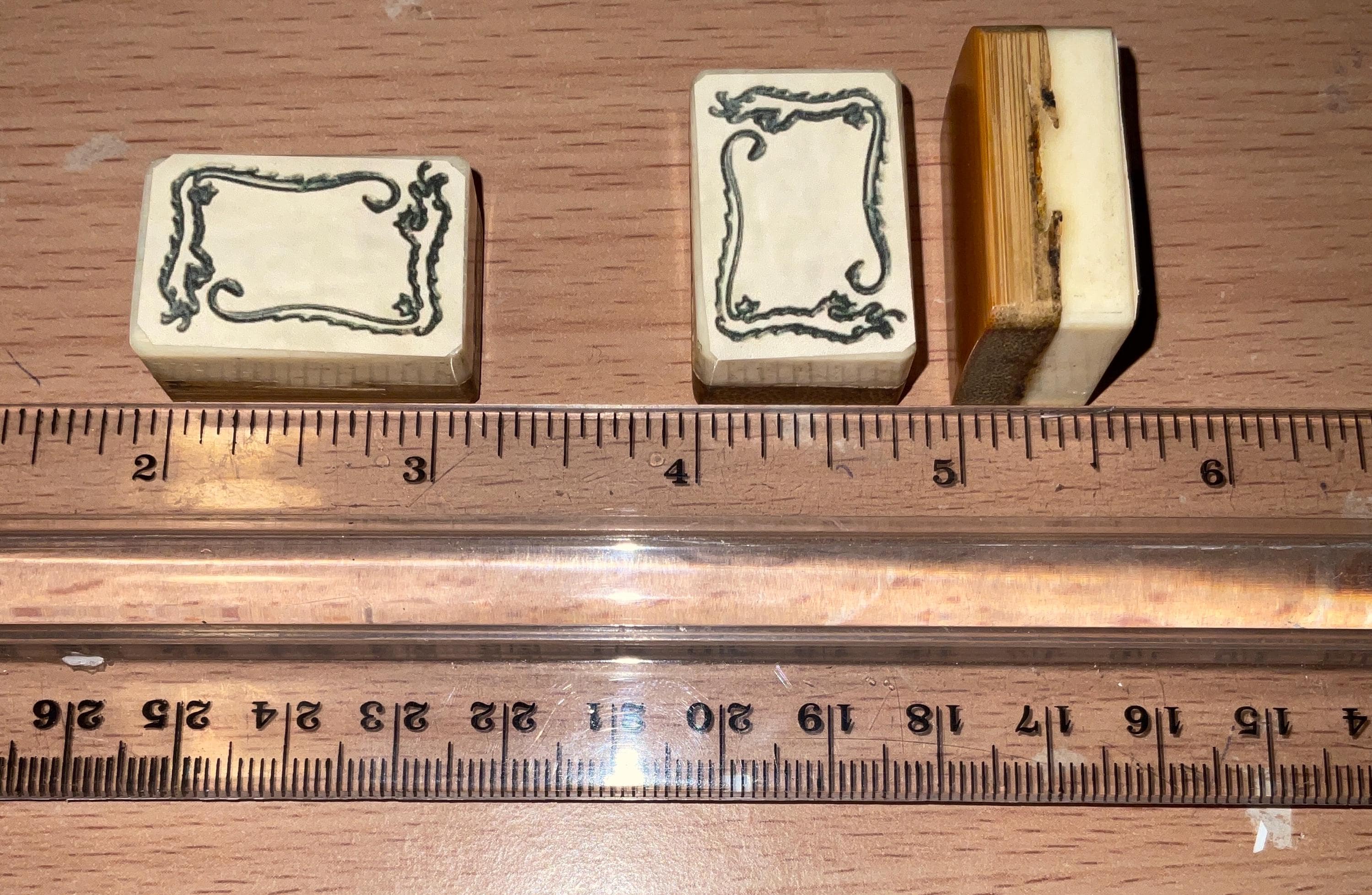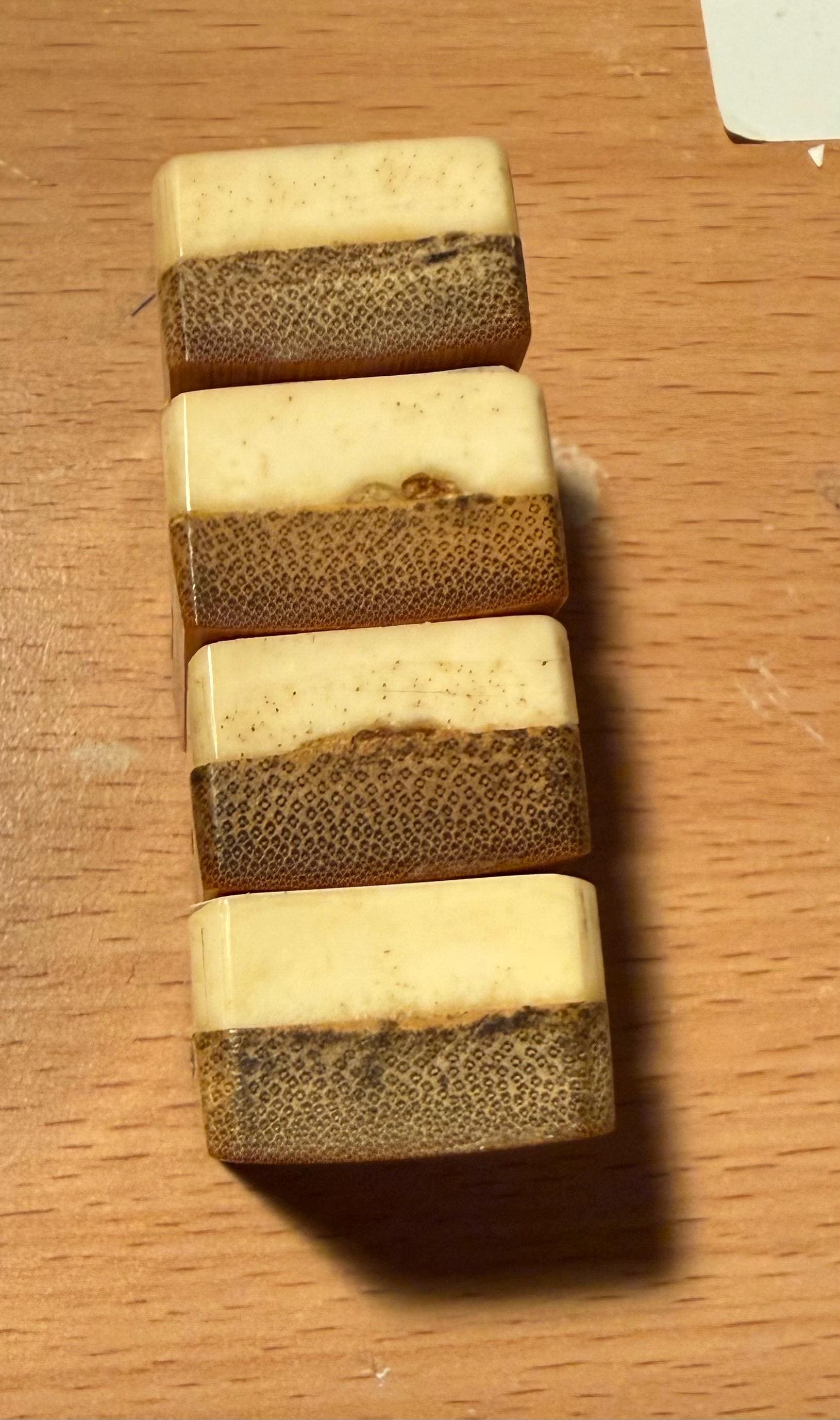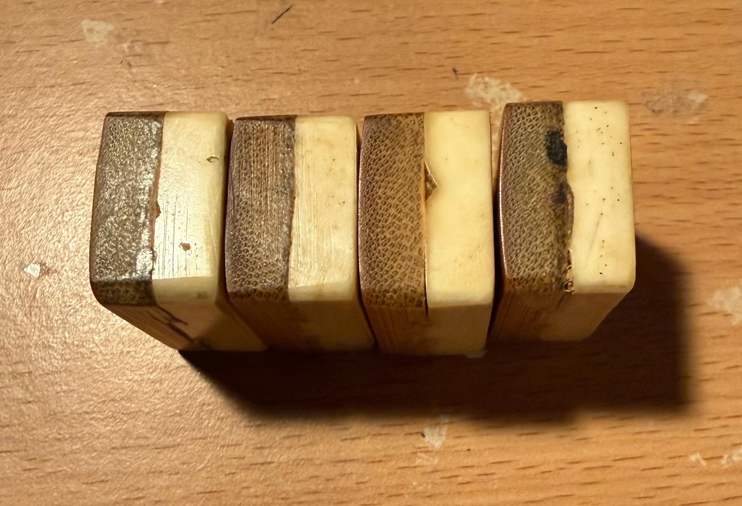 Each tile measures approximately L (1+11/64)” × W (13.5)/16” × D 17/32” ,bamboo-to-bone ratio of approximately 50 to 50, and is carefully selected from original 1920s dovetailed Bamboo & Bone sets. These tiles are ideal replacements for missing soap tiles and help restore your cherished set to full gameplay readiness.