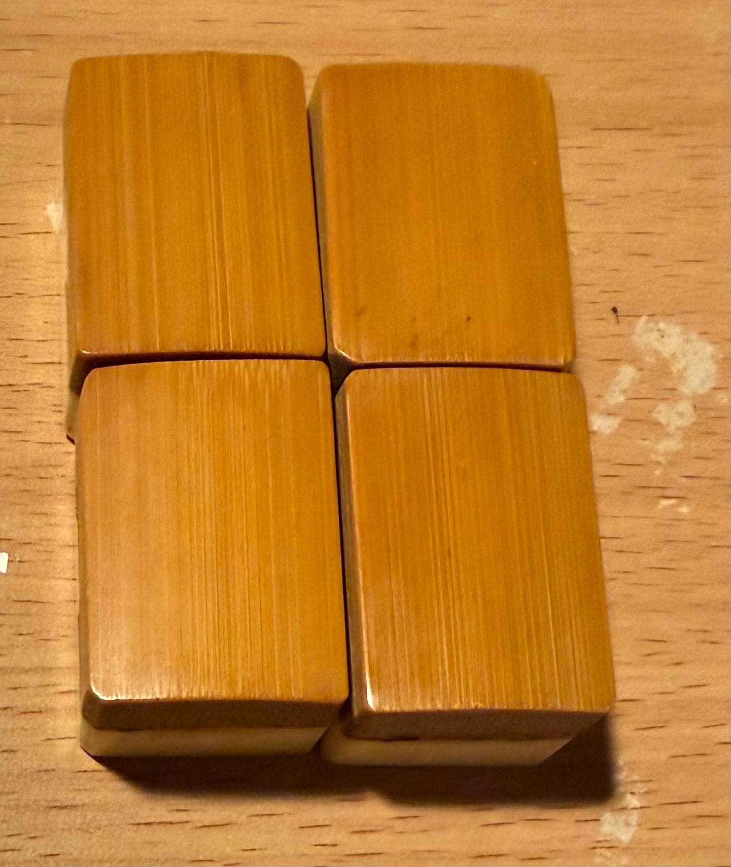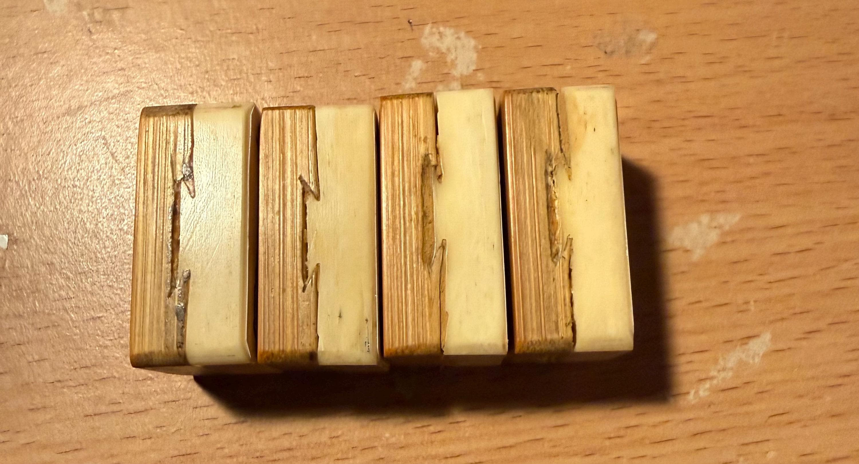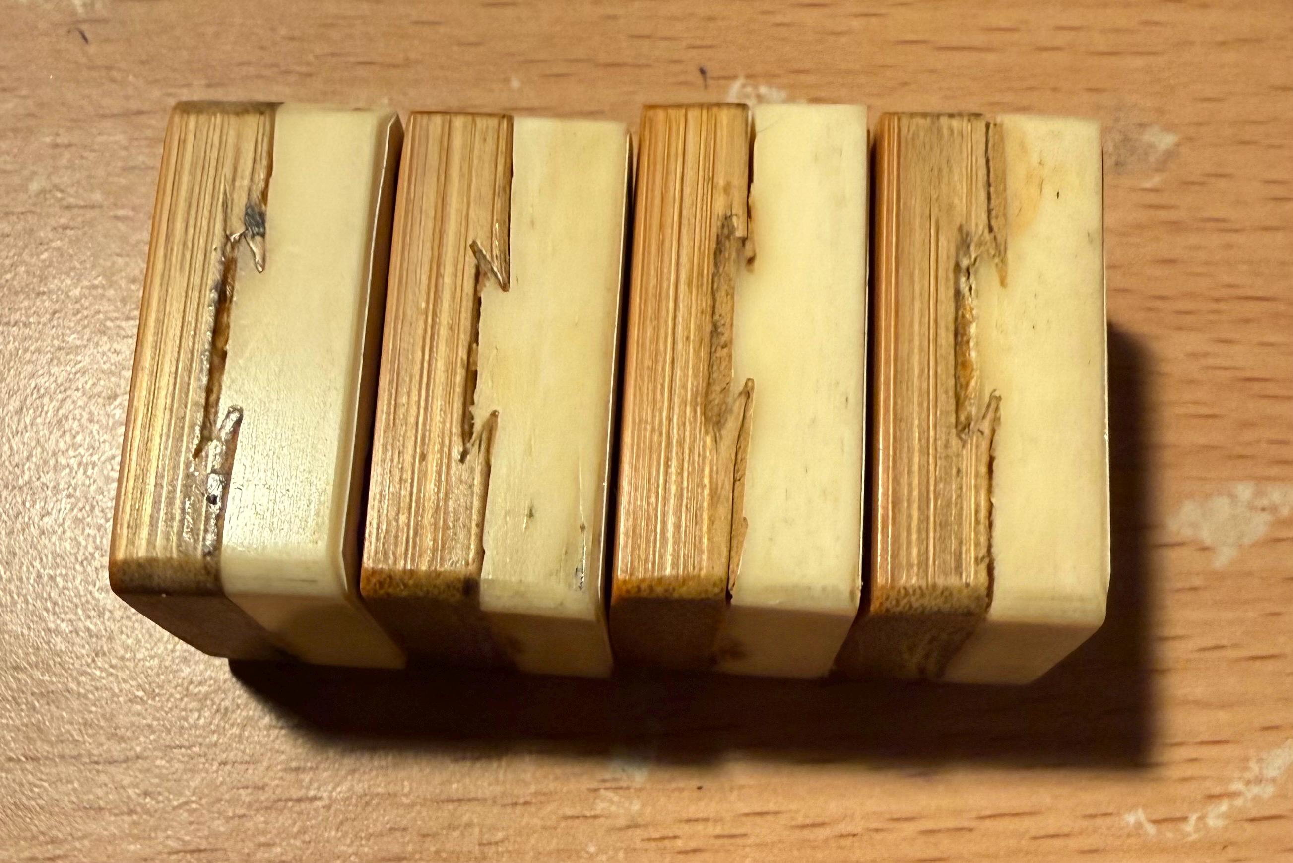 Each tile measures approximately L (1+11/64)” × W (13.5)/16” × D 17/32” ,bamboo-to-bone ratio of approximately 50 to 50, and is carefully selected from original 1920s dovetailed Bamboo & Bone sets. These tiles are ideal replacements for missing soap tiles and help restore your cherished set to full gameplay readiness.