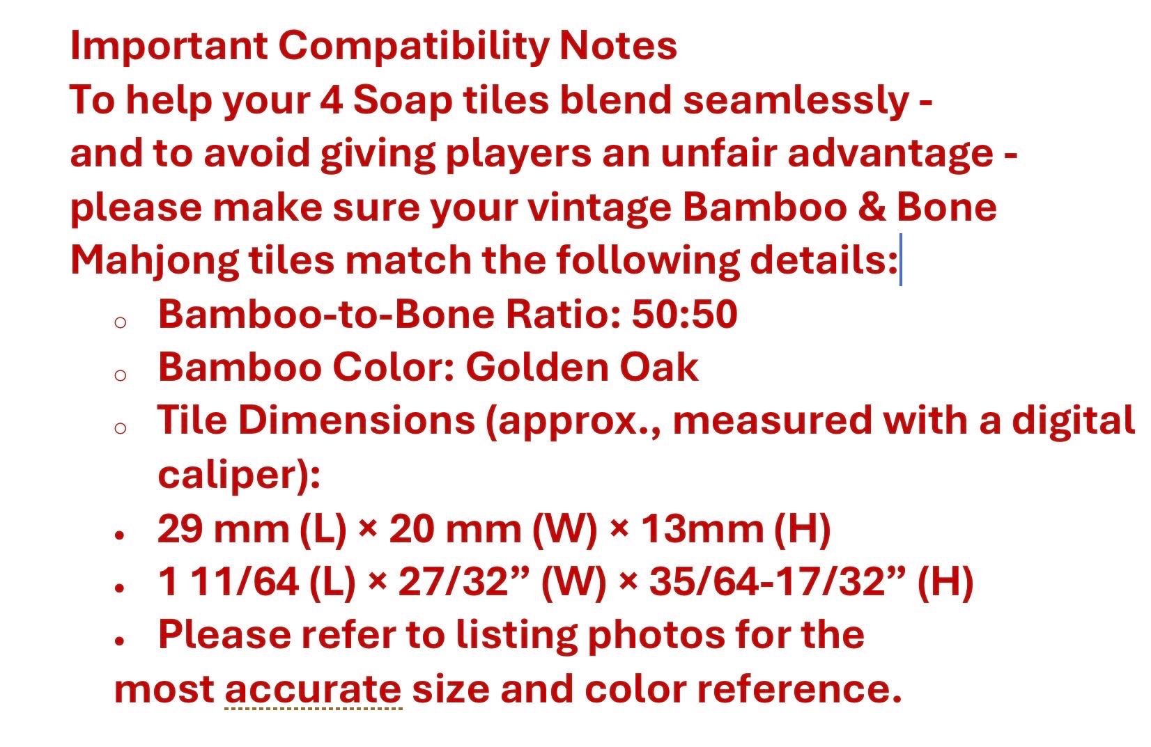 Whether you’re restoring a family heirloom or completing a rare find, this set of 4 soap tiles offers a seamless, handcrafted solution tailored for American Mahjong play.