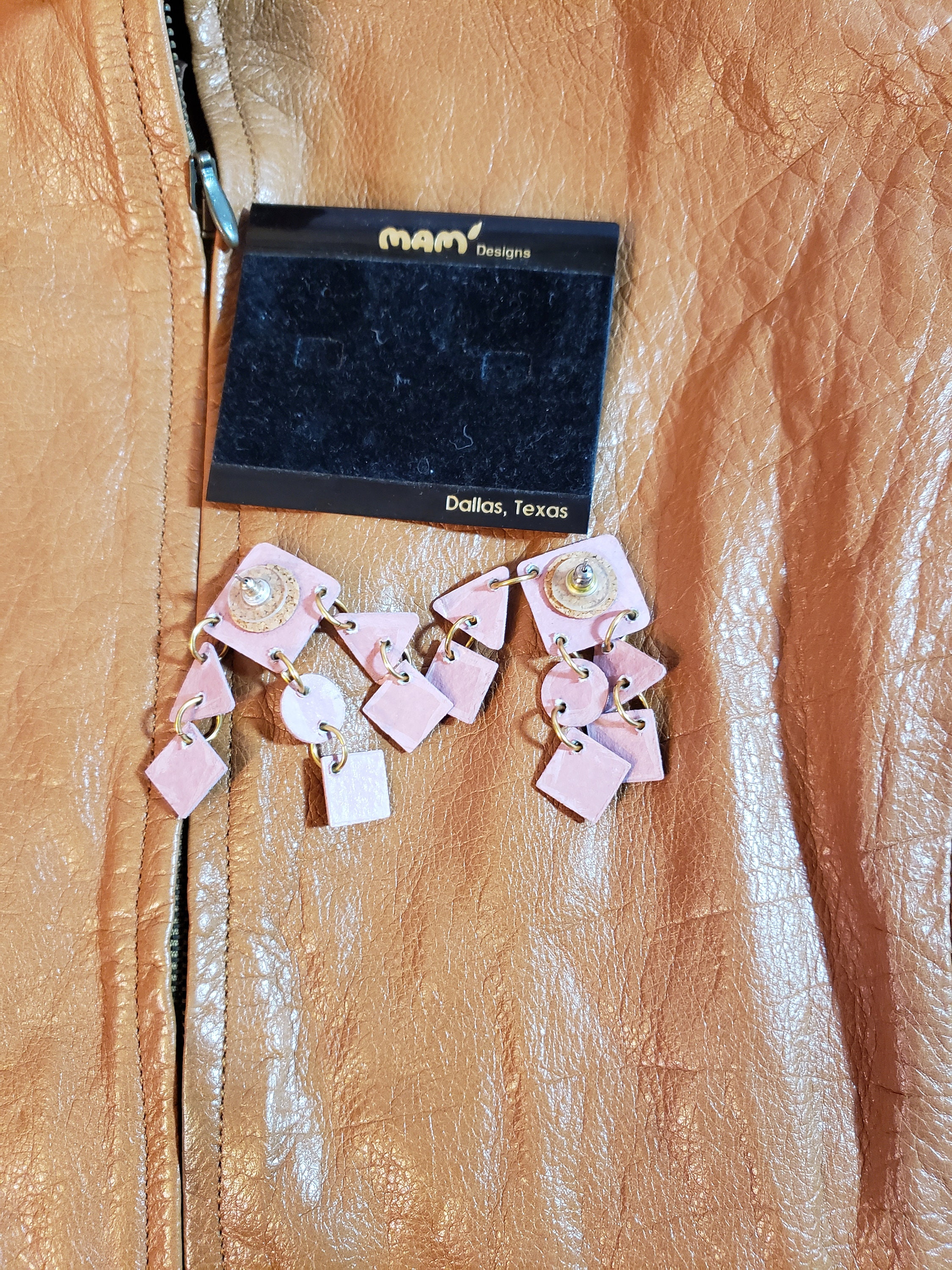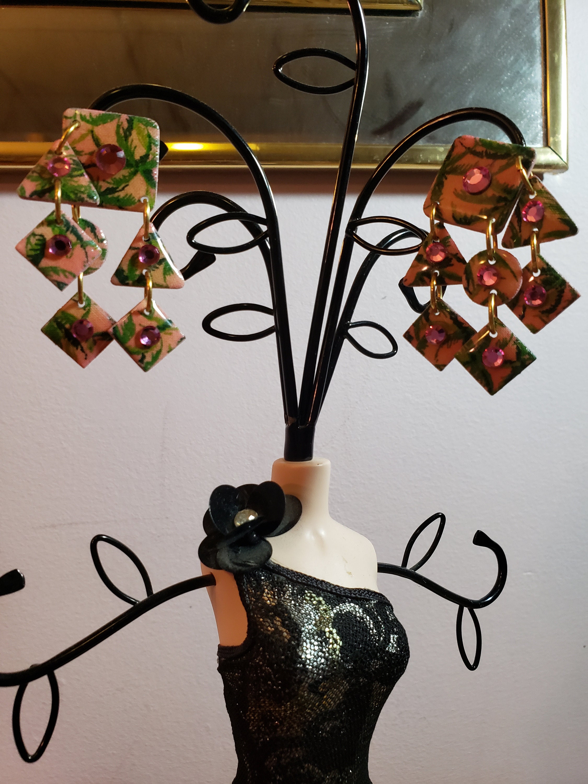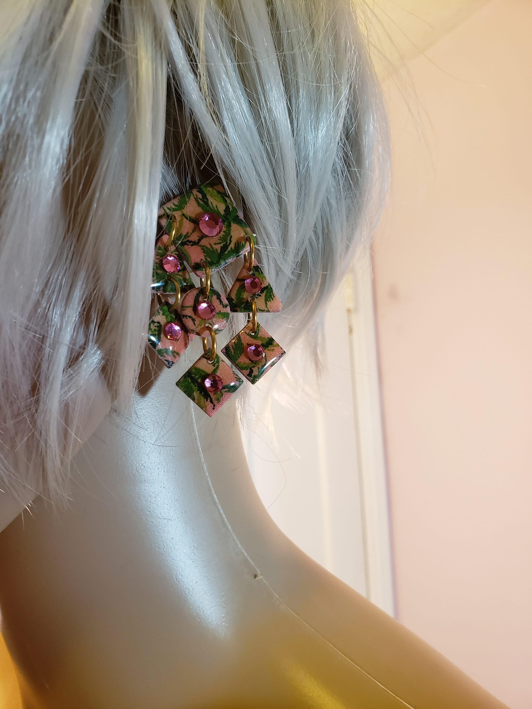 New with tag Art Deco paper earrings by mam'Design. Very rare. Specs: weight:25 grams, Length:2",width:1",circle bead 12mm ,square 13-21mm,triangles 14mm,they are painted in pink and green with decorative pink rhinestones.