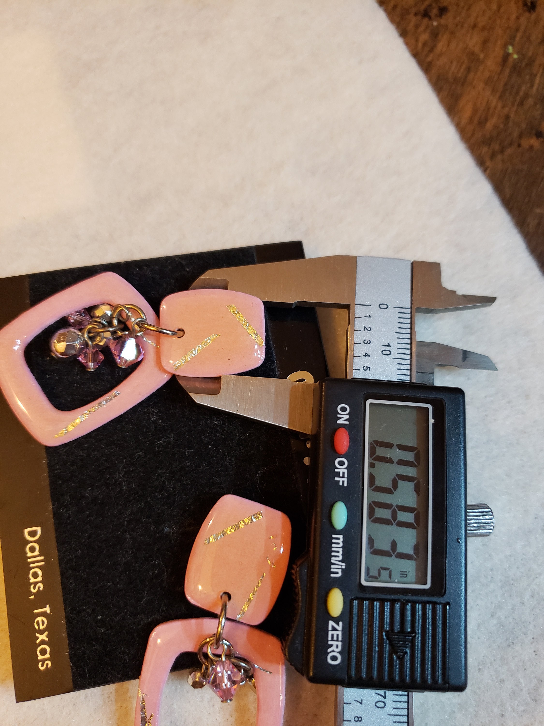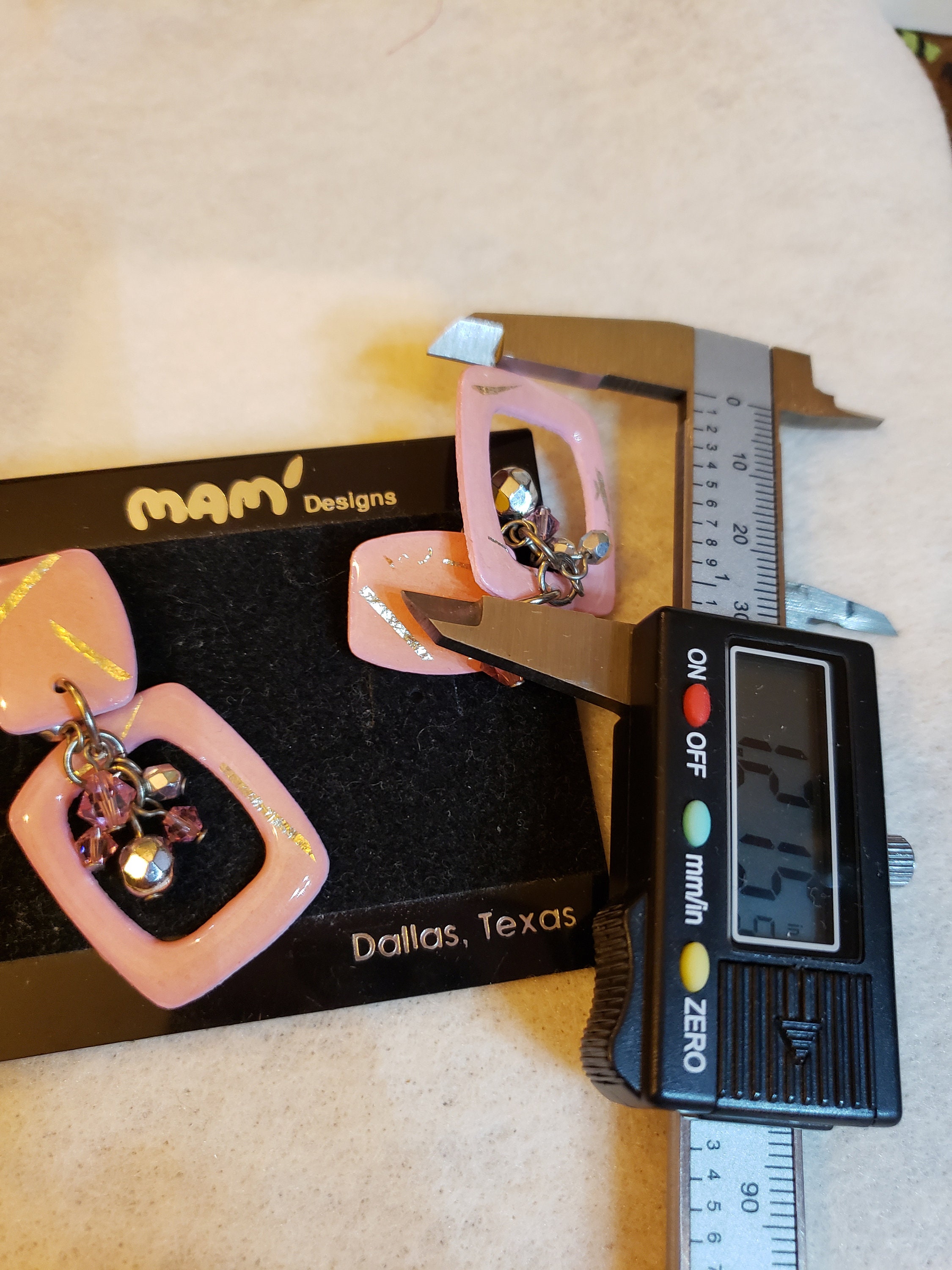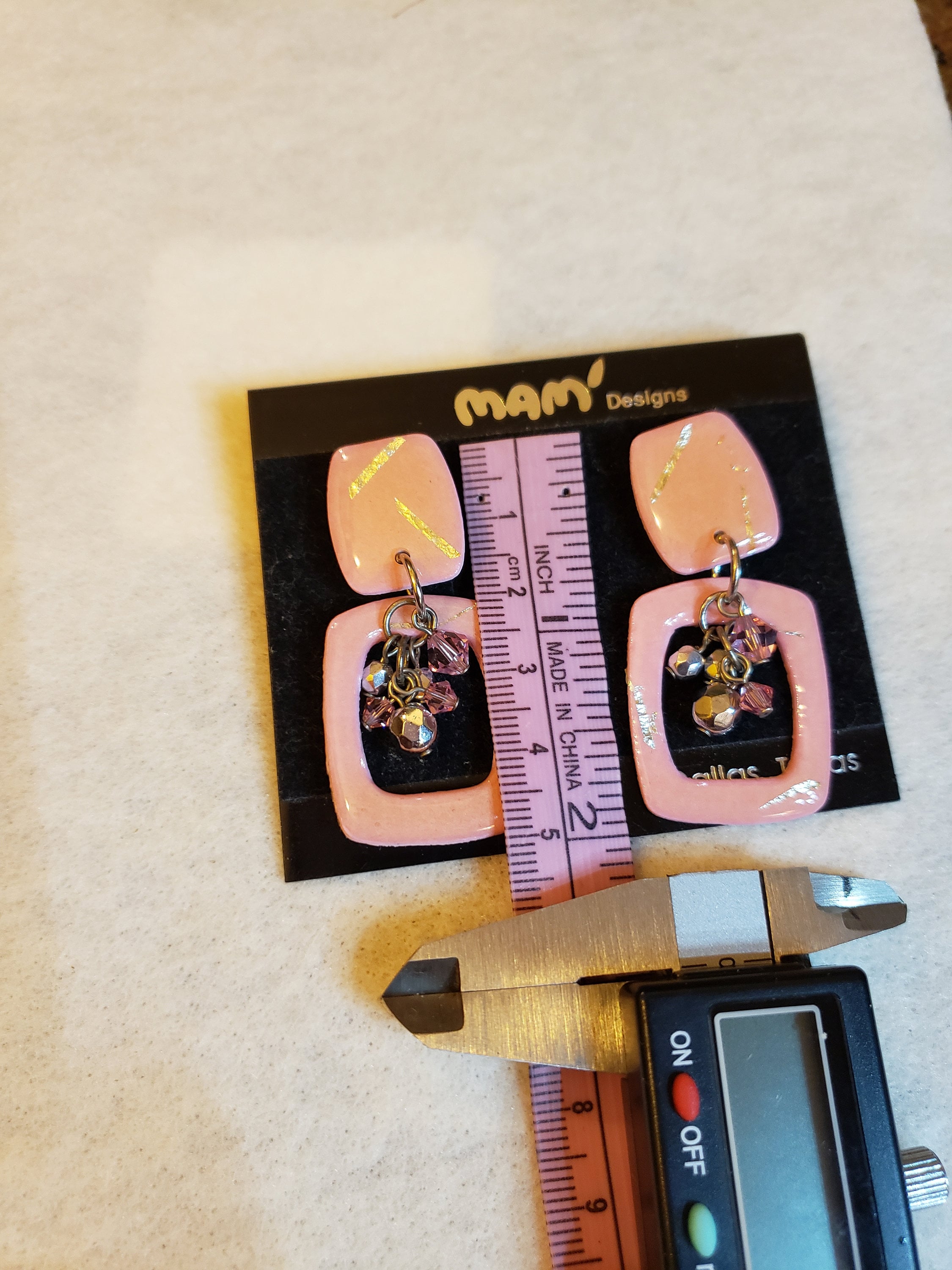 After 3 decades, making beautiful Acrylic Paper rhinestones earings, MAM'DESIGNS Dallas,Texas quit production. 2" HIGH,1" width and 2.2 mm thick, hairline goldtone,over pinkish Art Deco paper cut shapes,dealed over by acrylic sealer,dangling with white Acrylic rhinestones ,made to fit any occasion. Please see pictures as part of description.