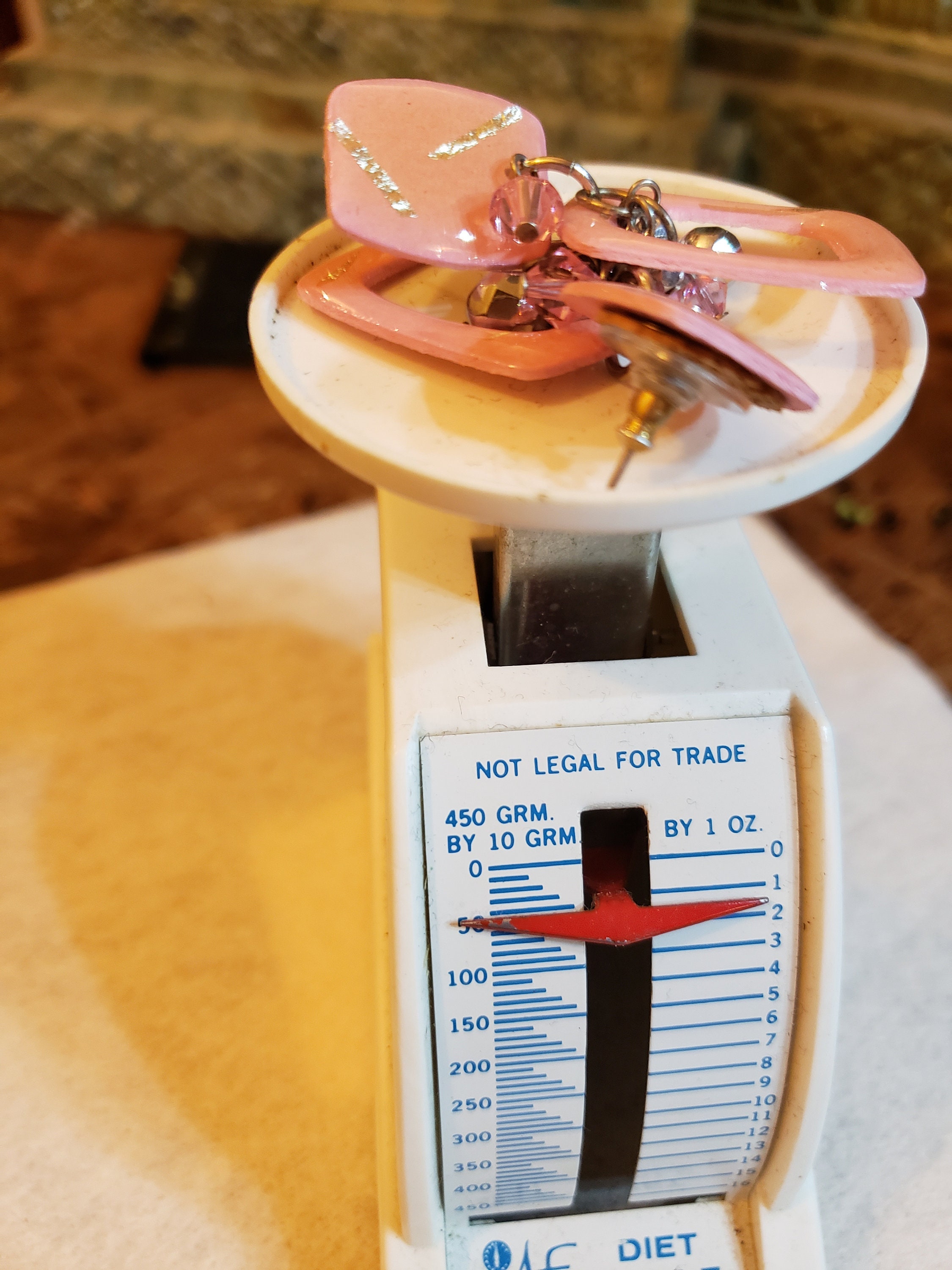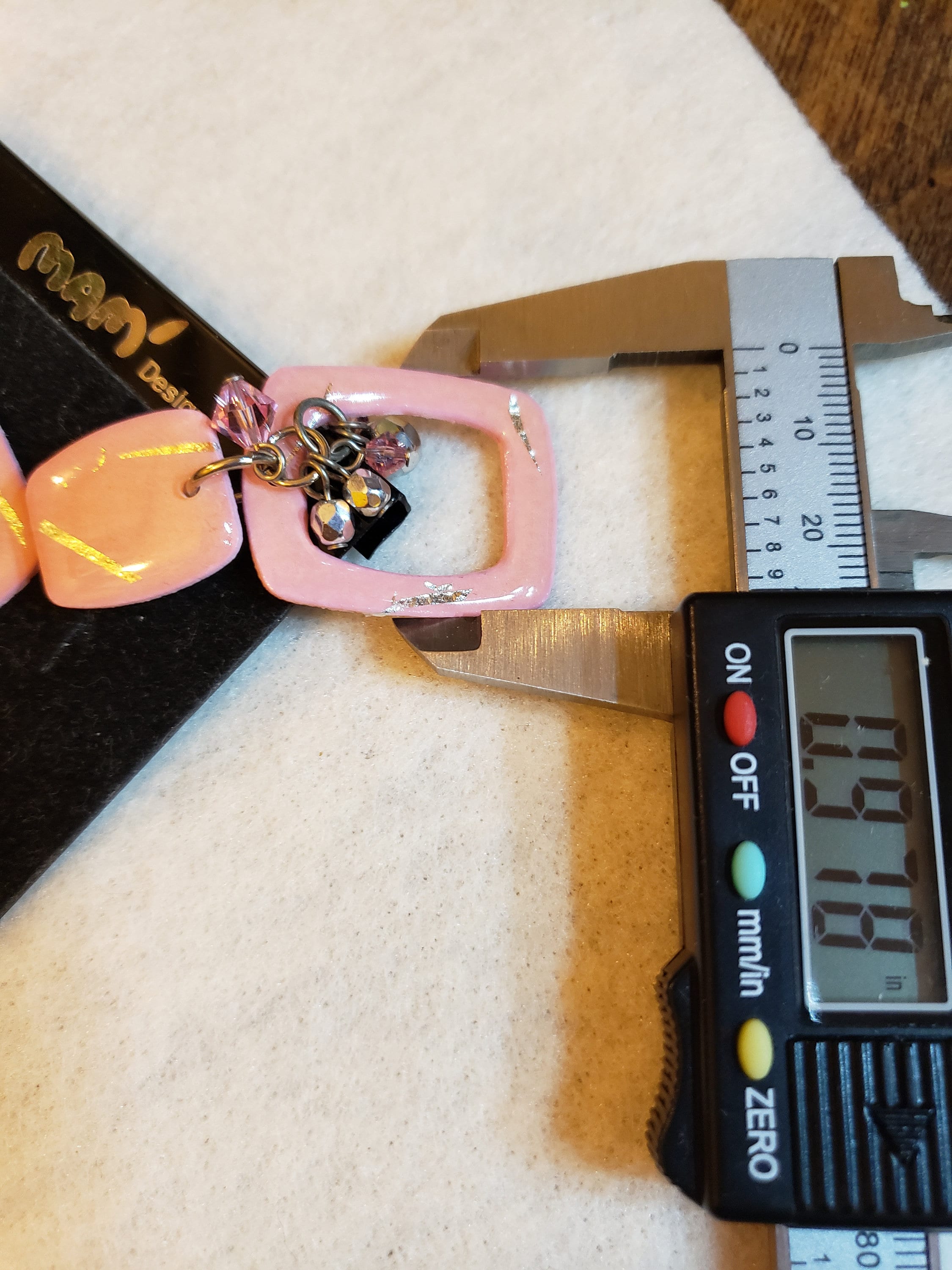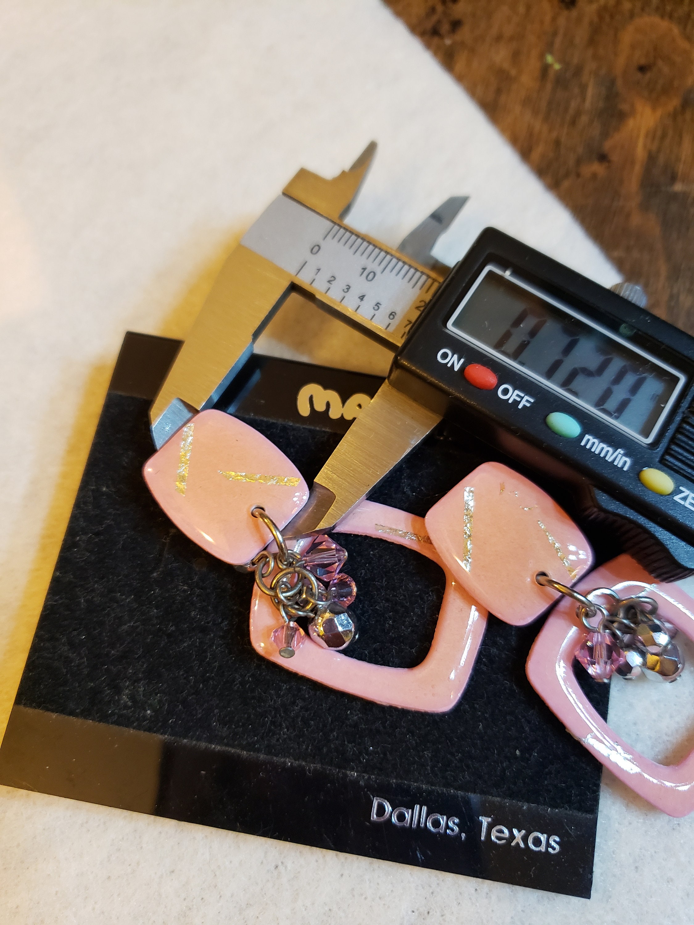 After 3 decades, making beautiful Acrylic Paper rhinestones earings, MAM'DESIGNS Dallas,Texas quit production. 2" HIGH,1" width and 2.2 mm thick, hairline goldtone,over pinkish Art Deco paper cut shapes,dealed over by acrylic sealer,dangling with white Acrylic rhinestones ,made to fit any occasion. Please see pictures as part of description.