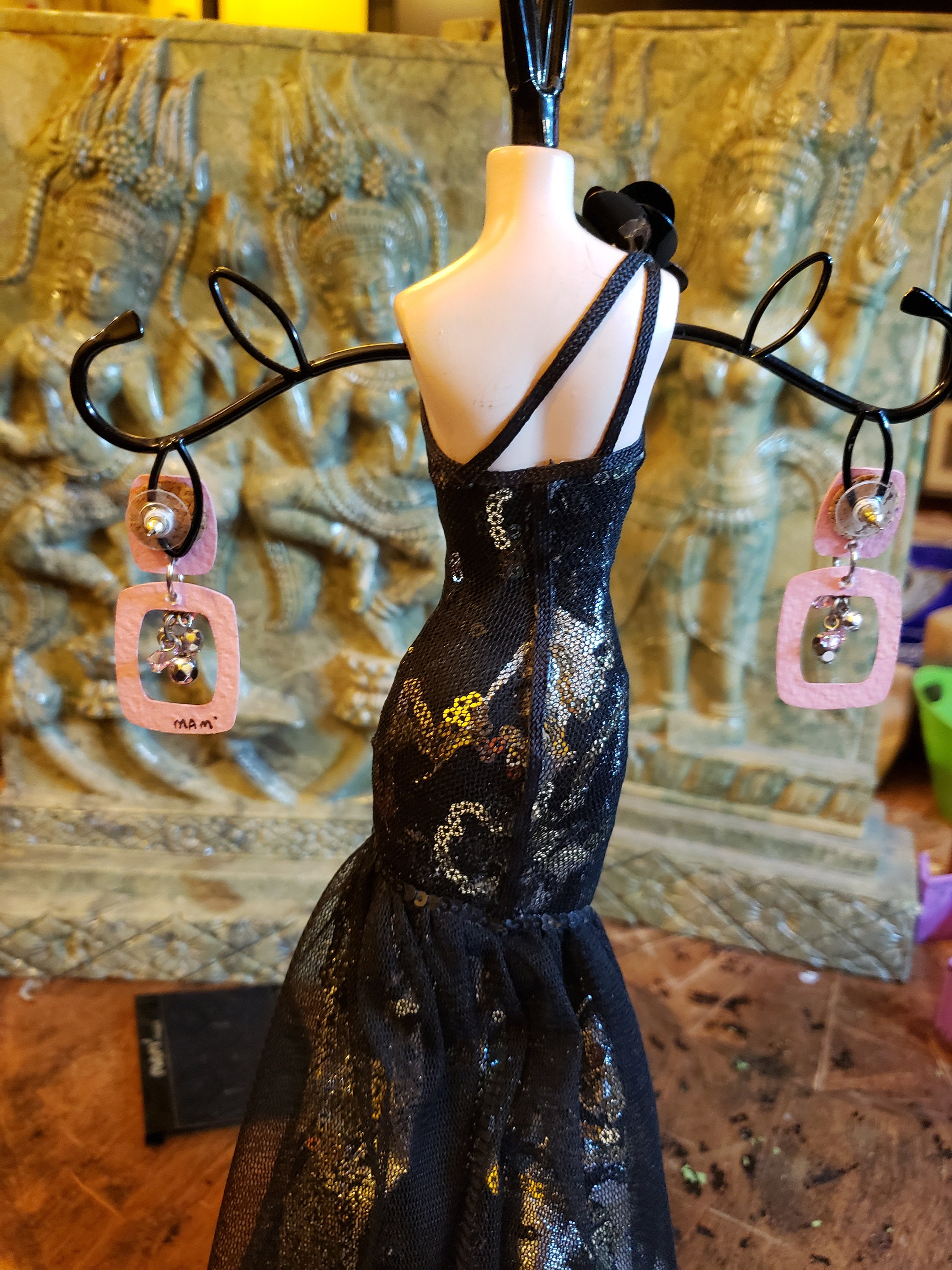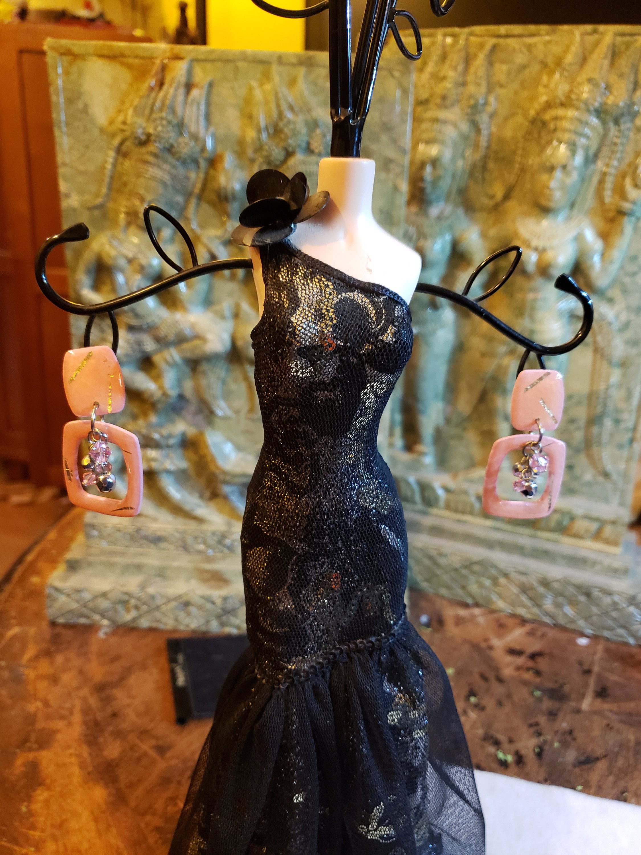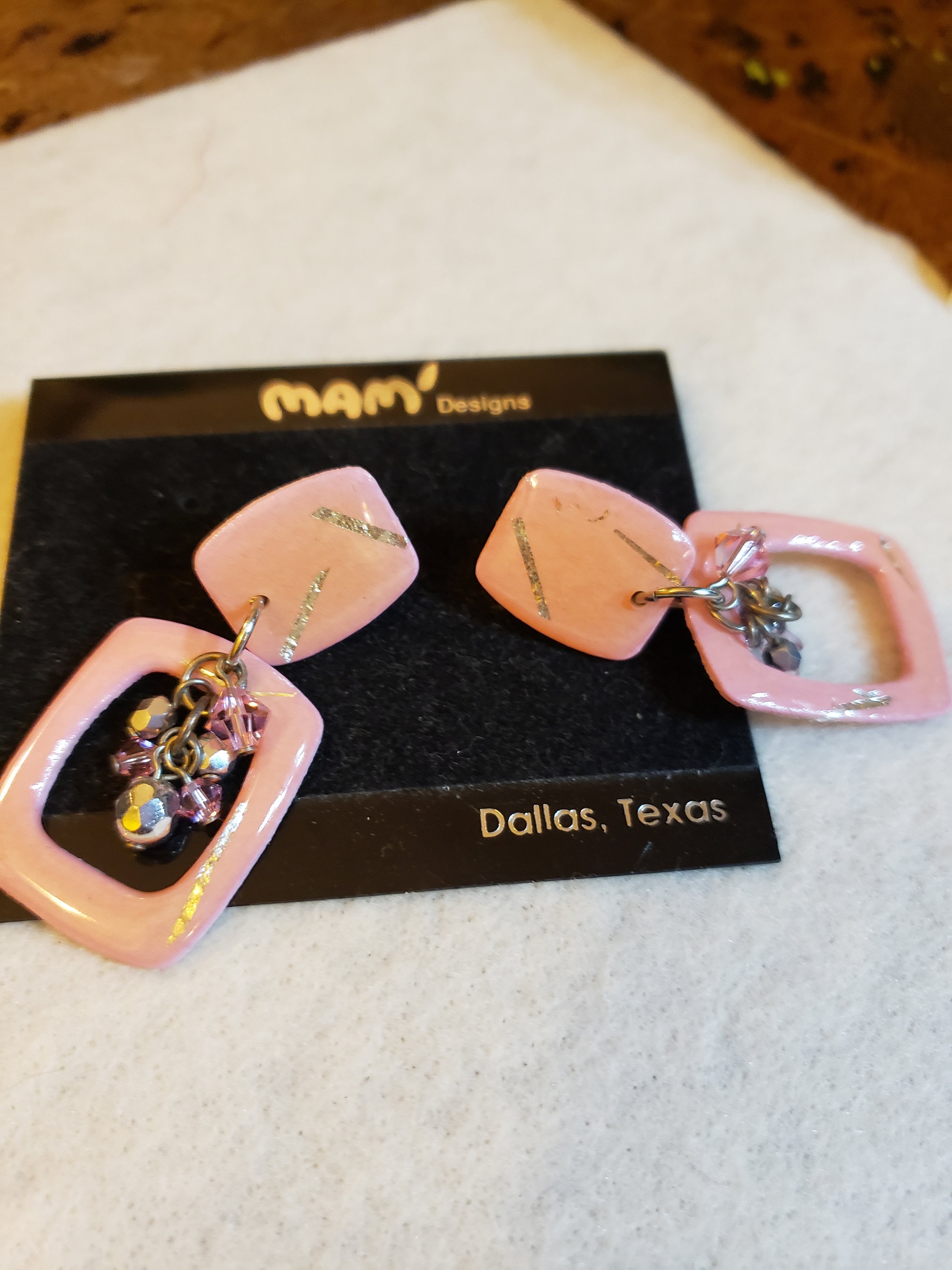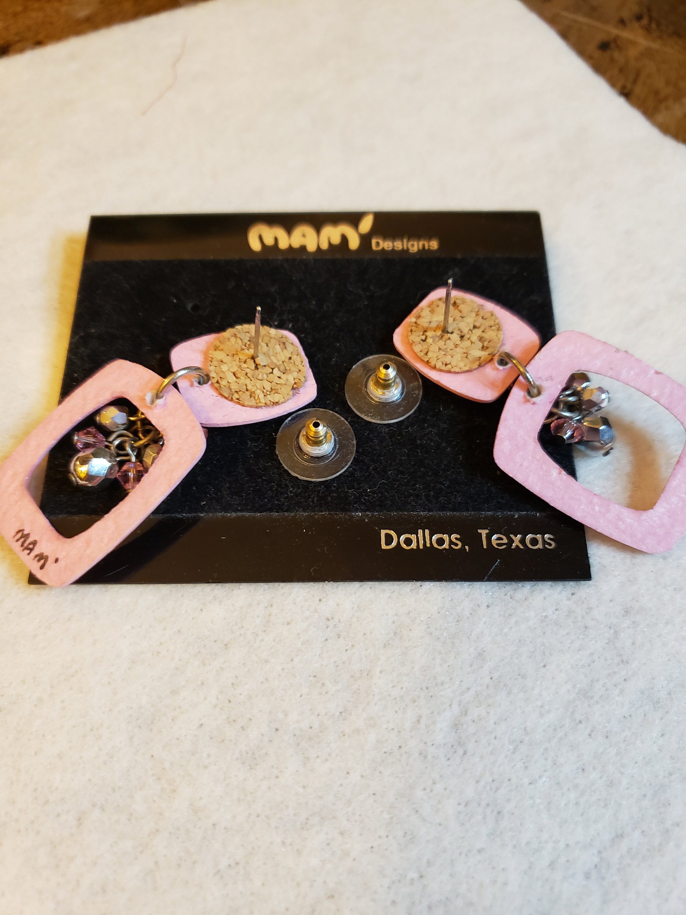 Rare and very collectable pink Acrylic Paper push-back earrings dim: L2”xW1” by Mam’ Designs Dallas Texas New w/ tag