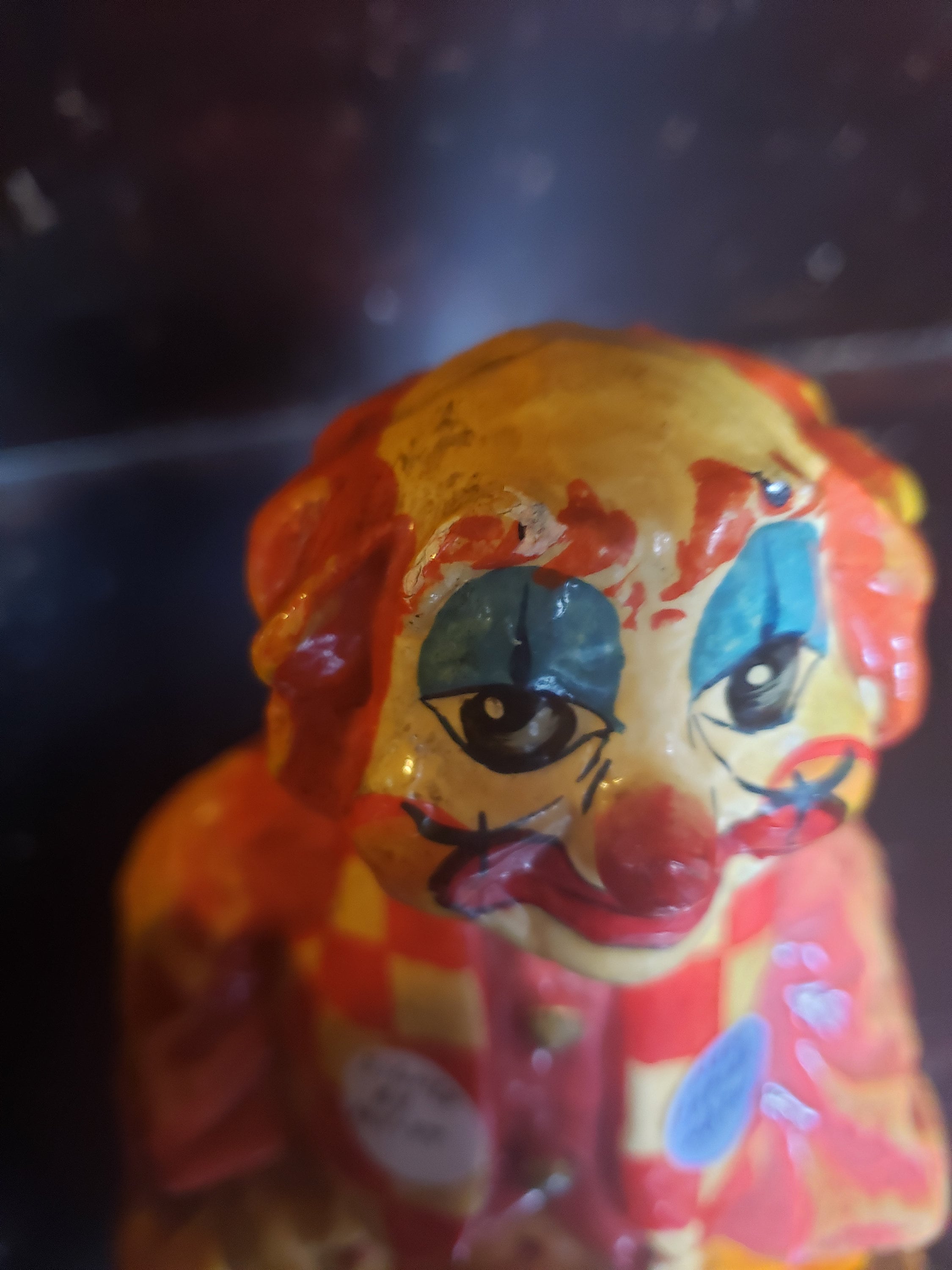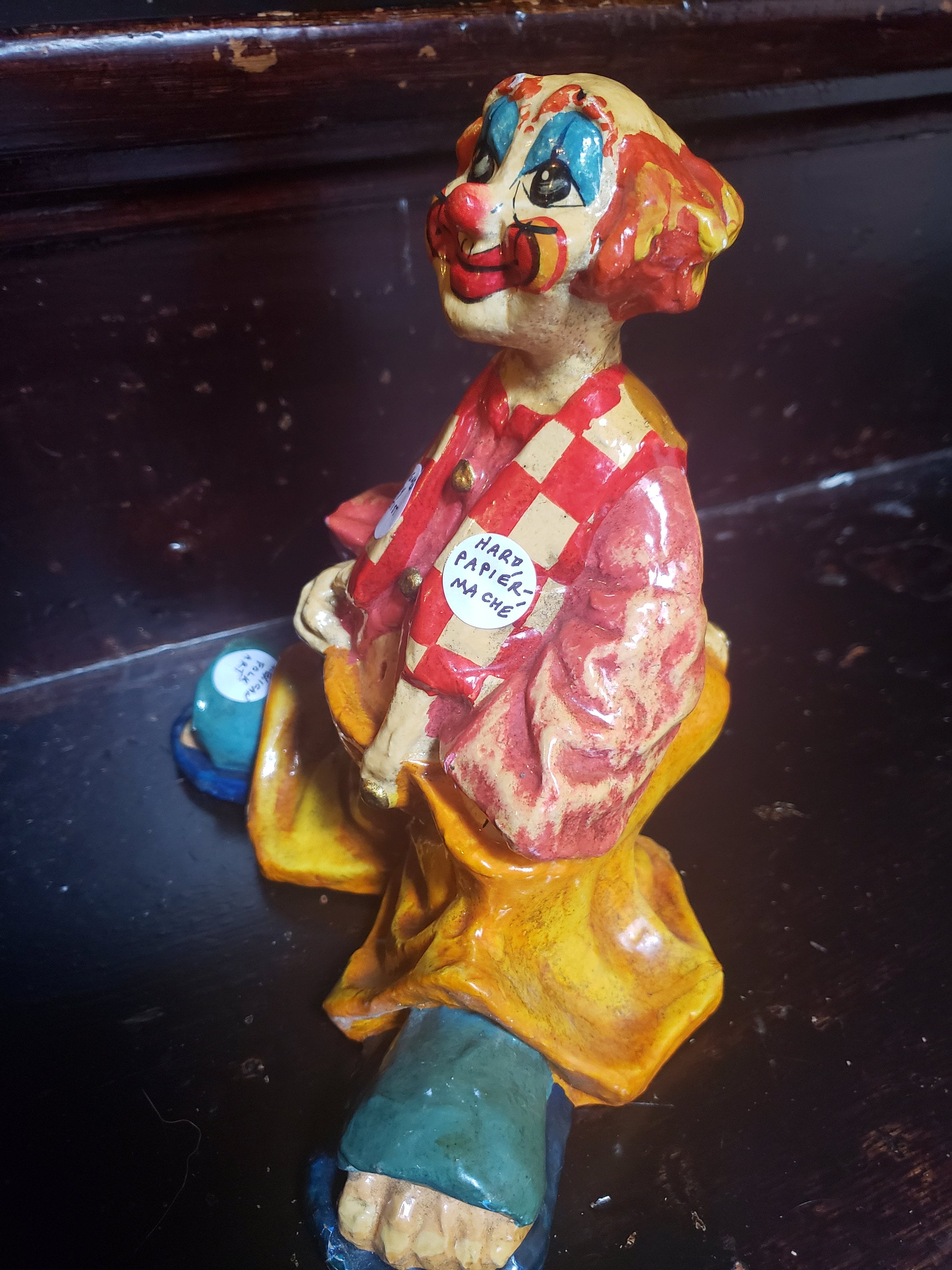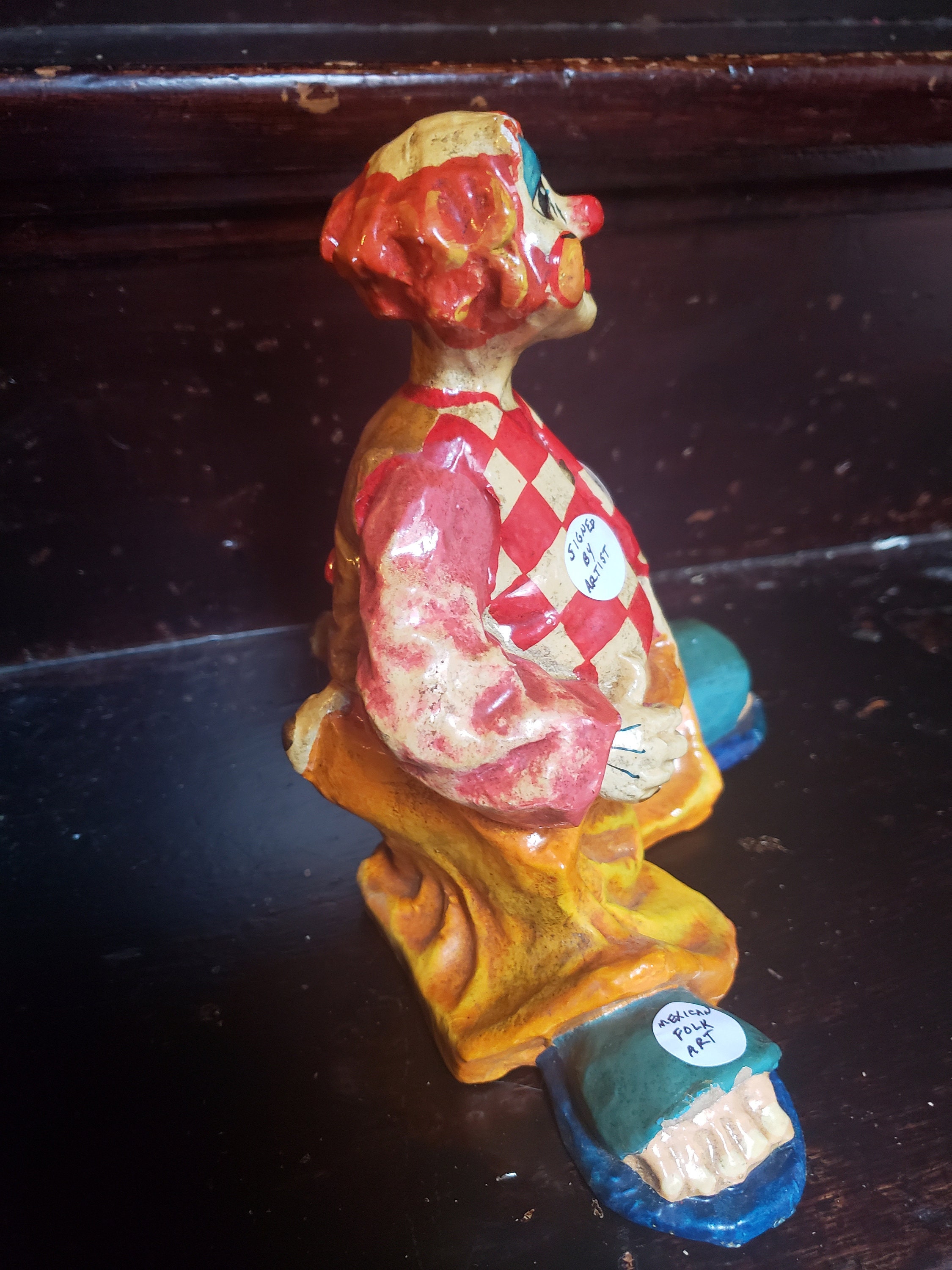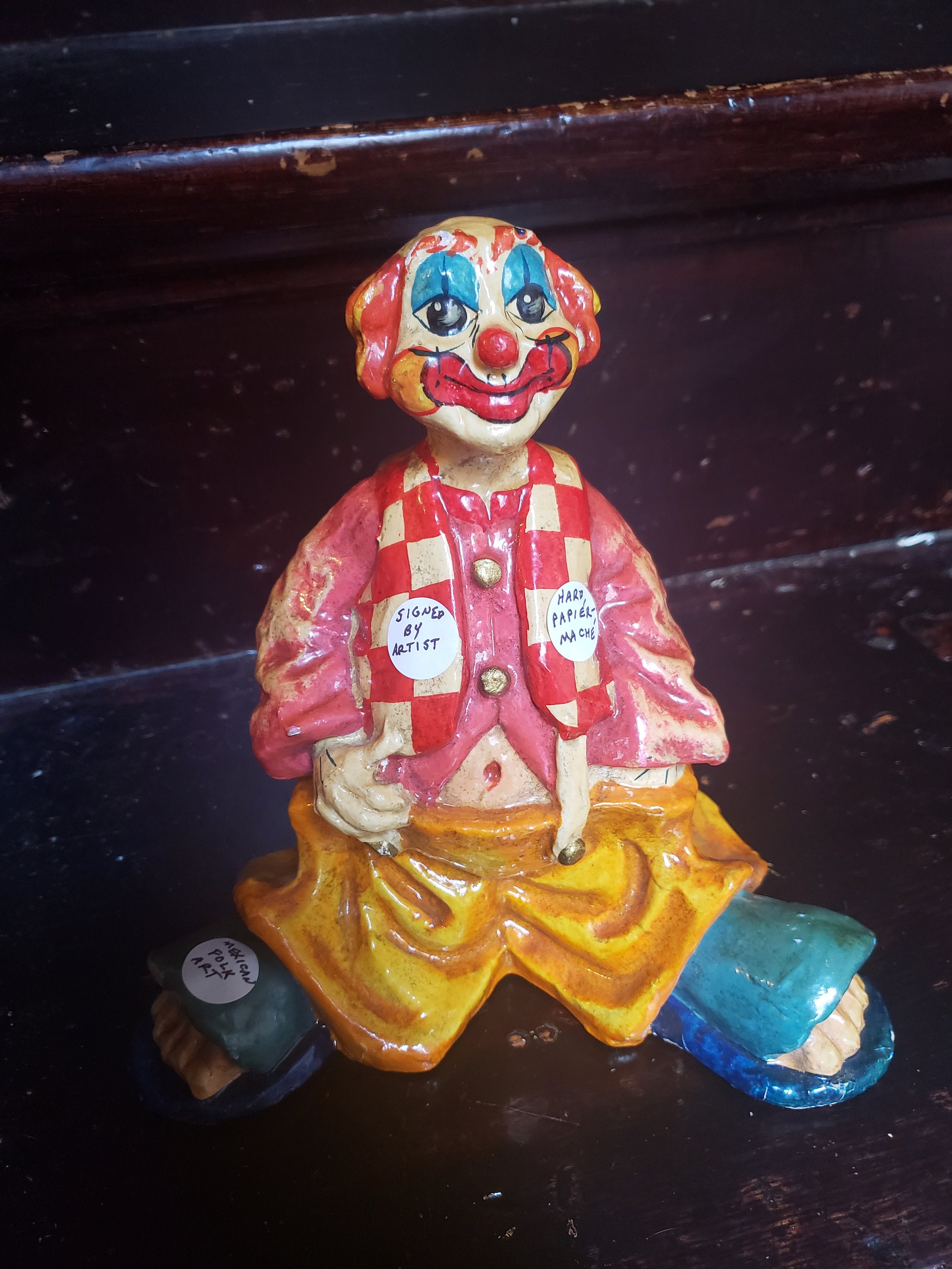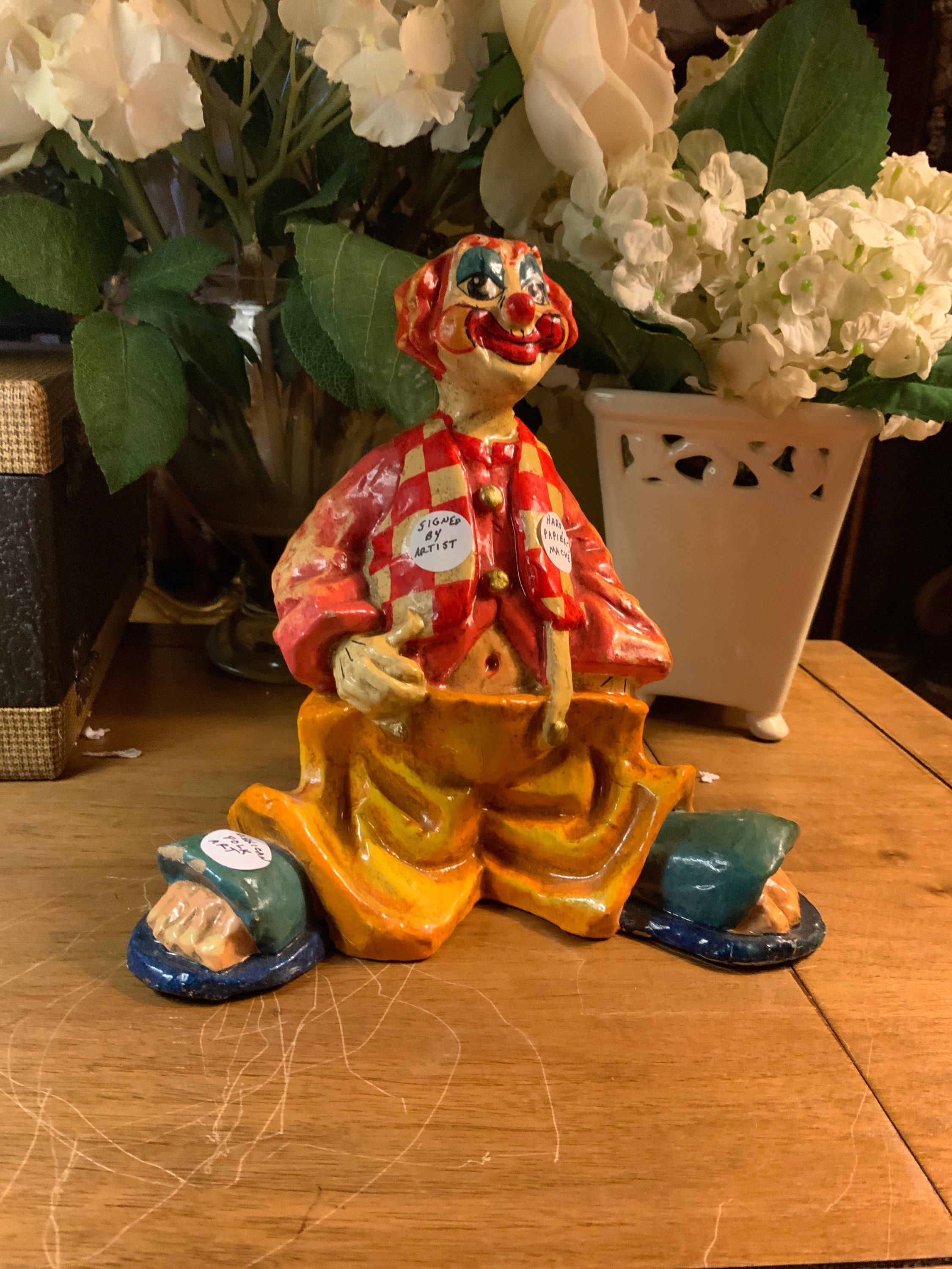 Listing is for one rare and collectable vintage hard Papier-Mache mexican folk clown art signed by artist underneath. Amazing color mixed red ,white ,blue and yellow,reminds me of Am Donald sign. Who says we can’t use a little unadulterated symbol of fun, frivolity, and happiness. He is smiling all the time. Old School Romance, clown was a wonderful character adult-oriented story lines . Or just a character to entertain young children home decor. Whatever your heart desire, this one will always make you forget being adult for a moment.
