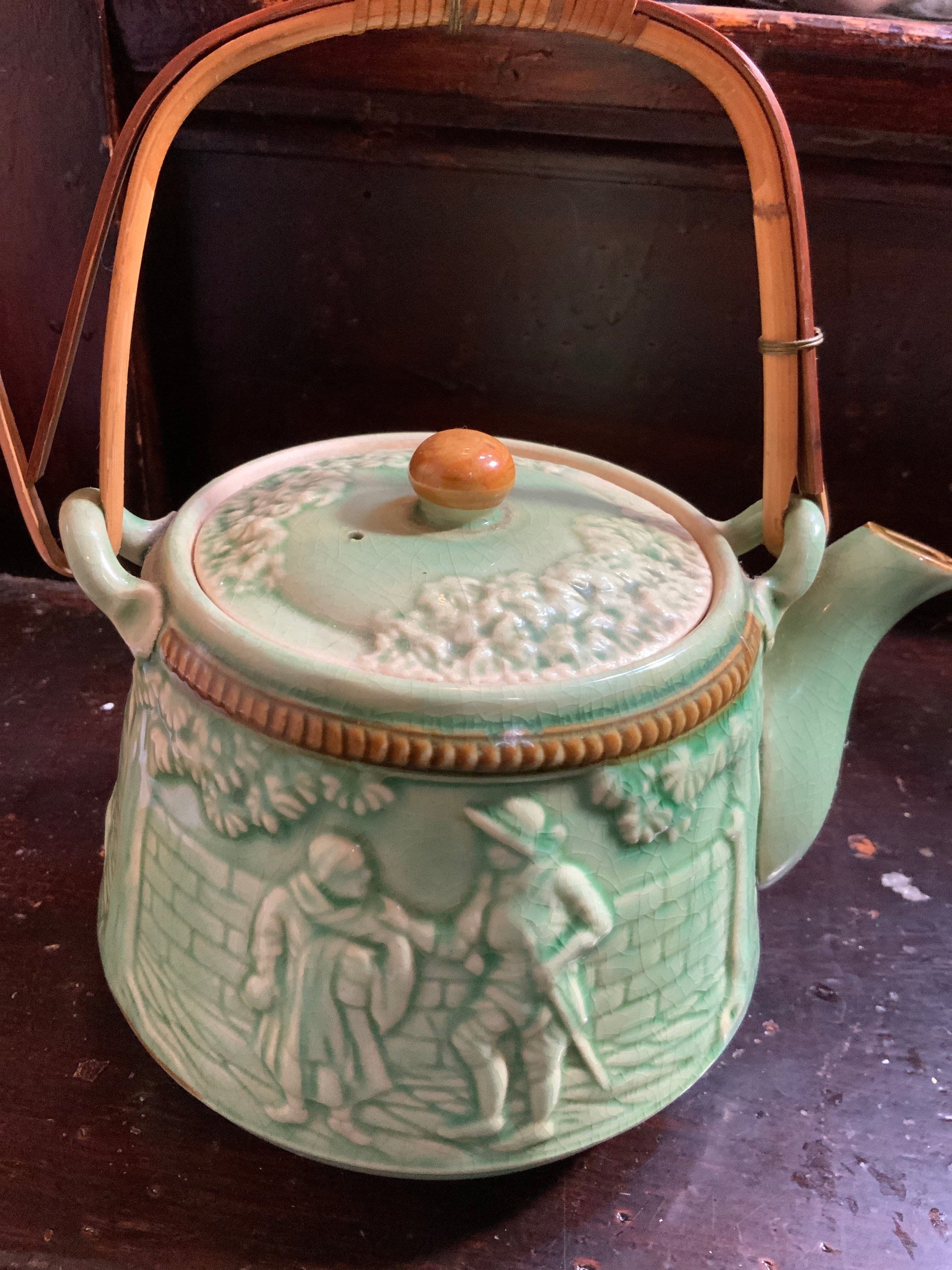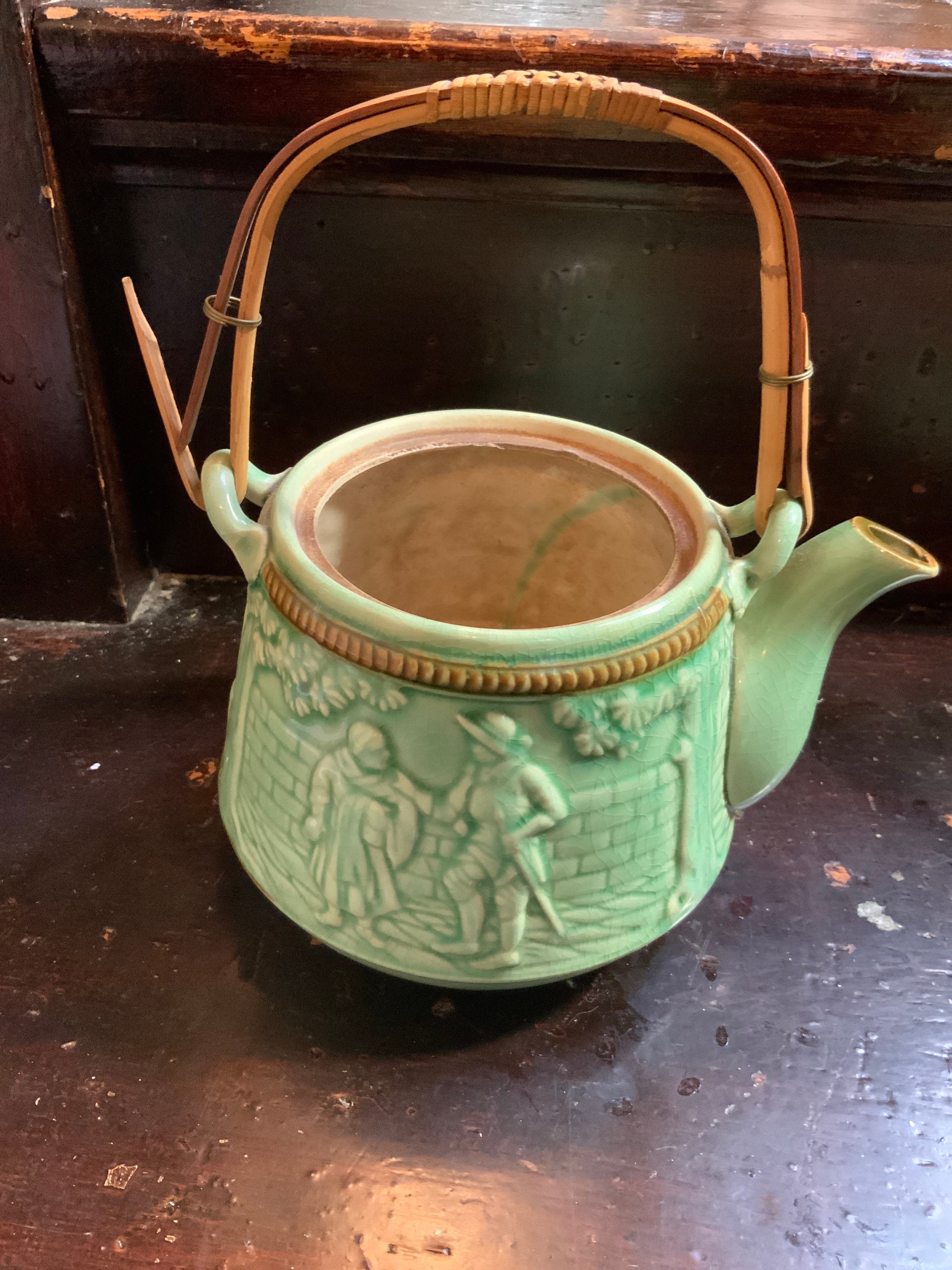 Listing is for one Antique Teapot Sage Green Handpainted Circa 1920’s 4.5” tall By 4” wide w/ open mouth 4.25” deep w/ some aged crazing lines.