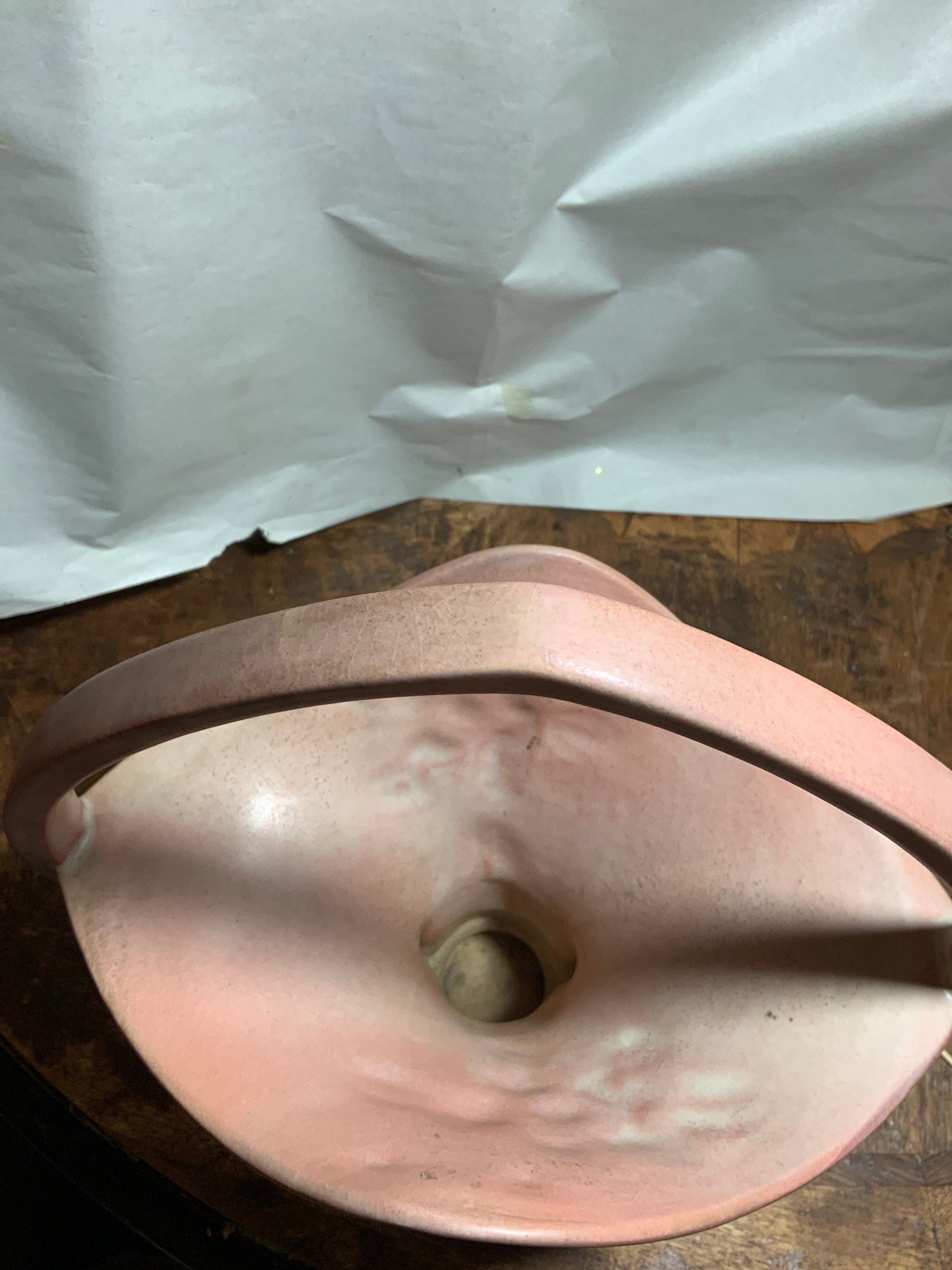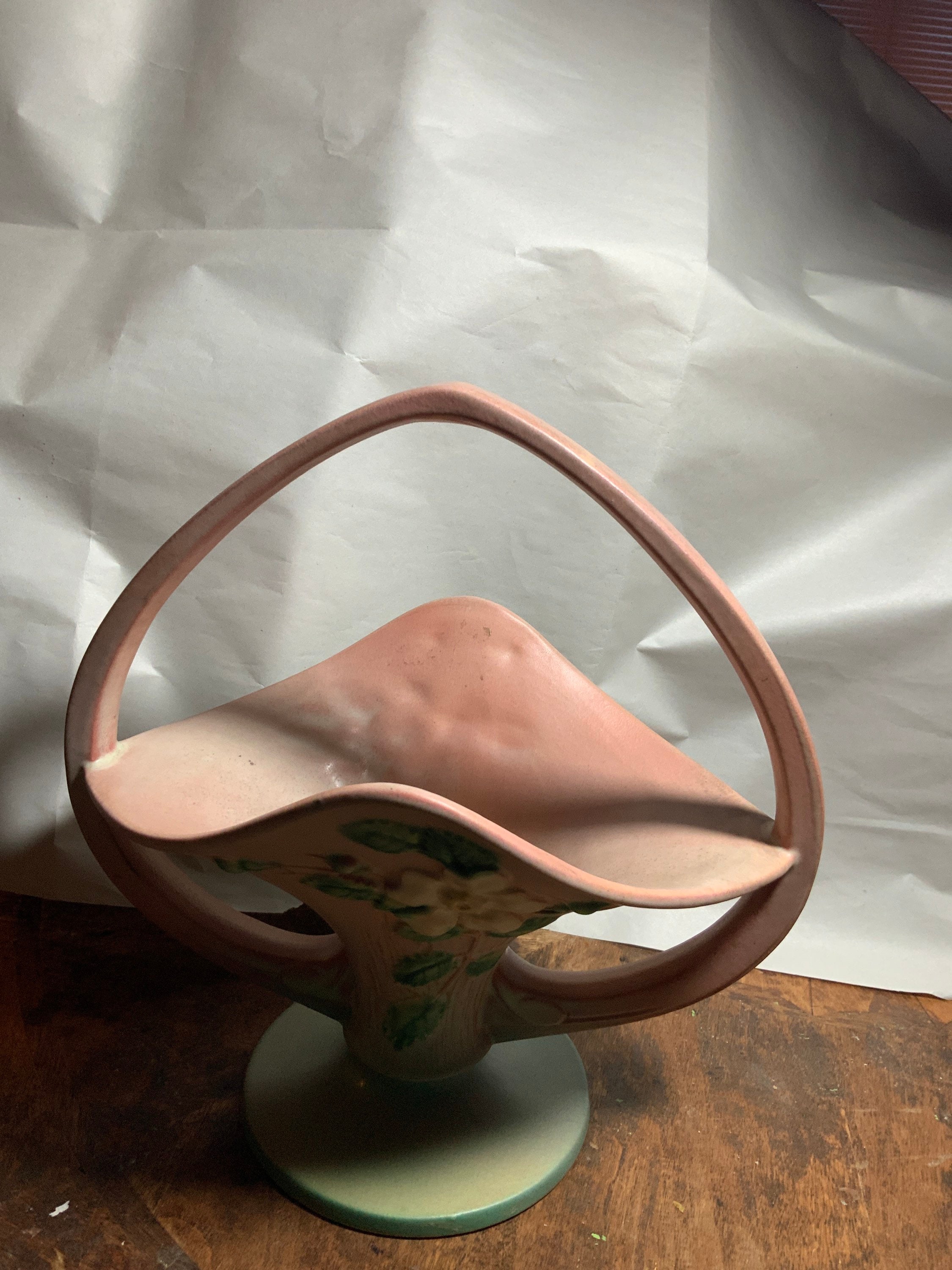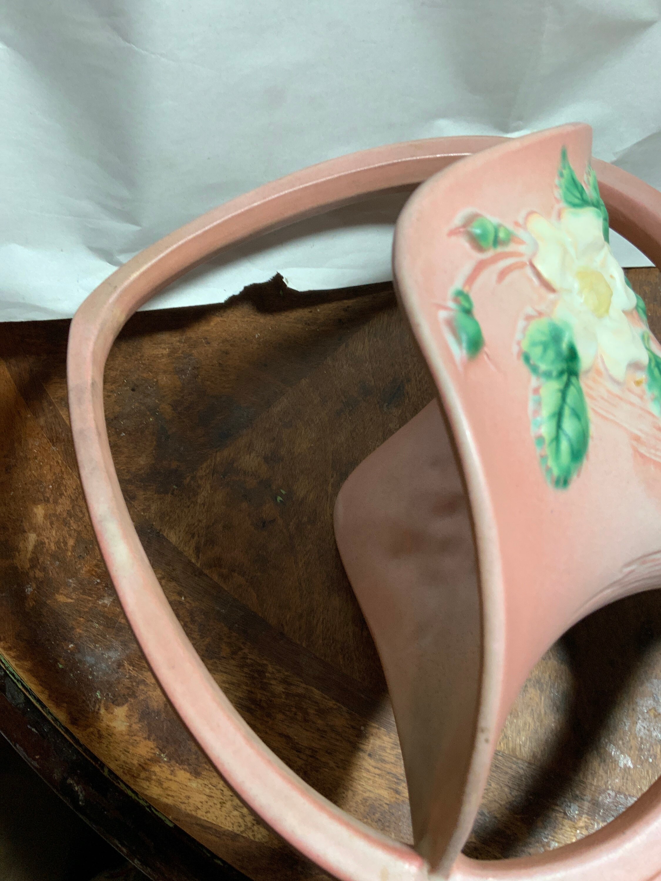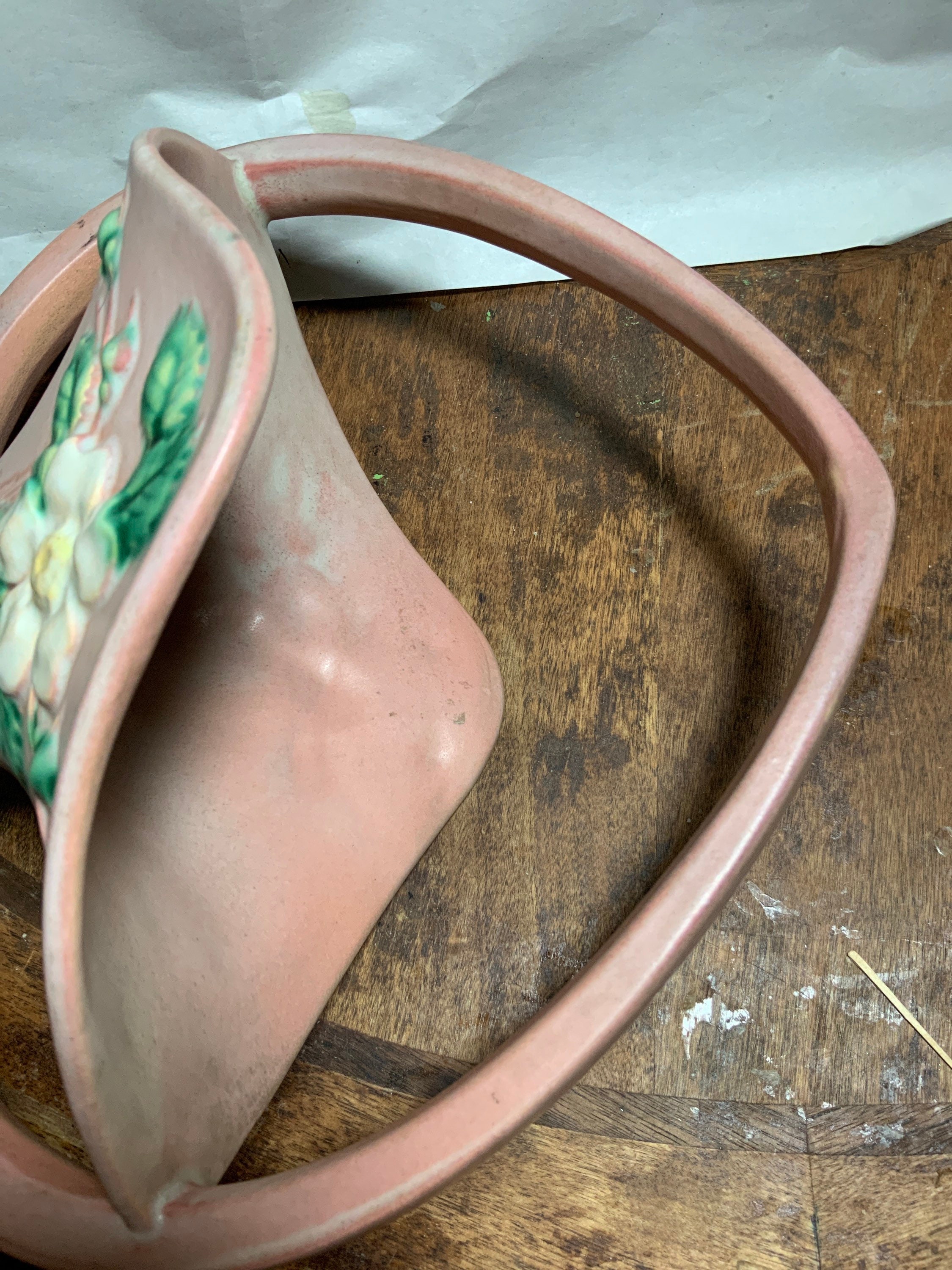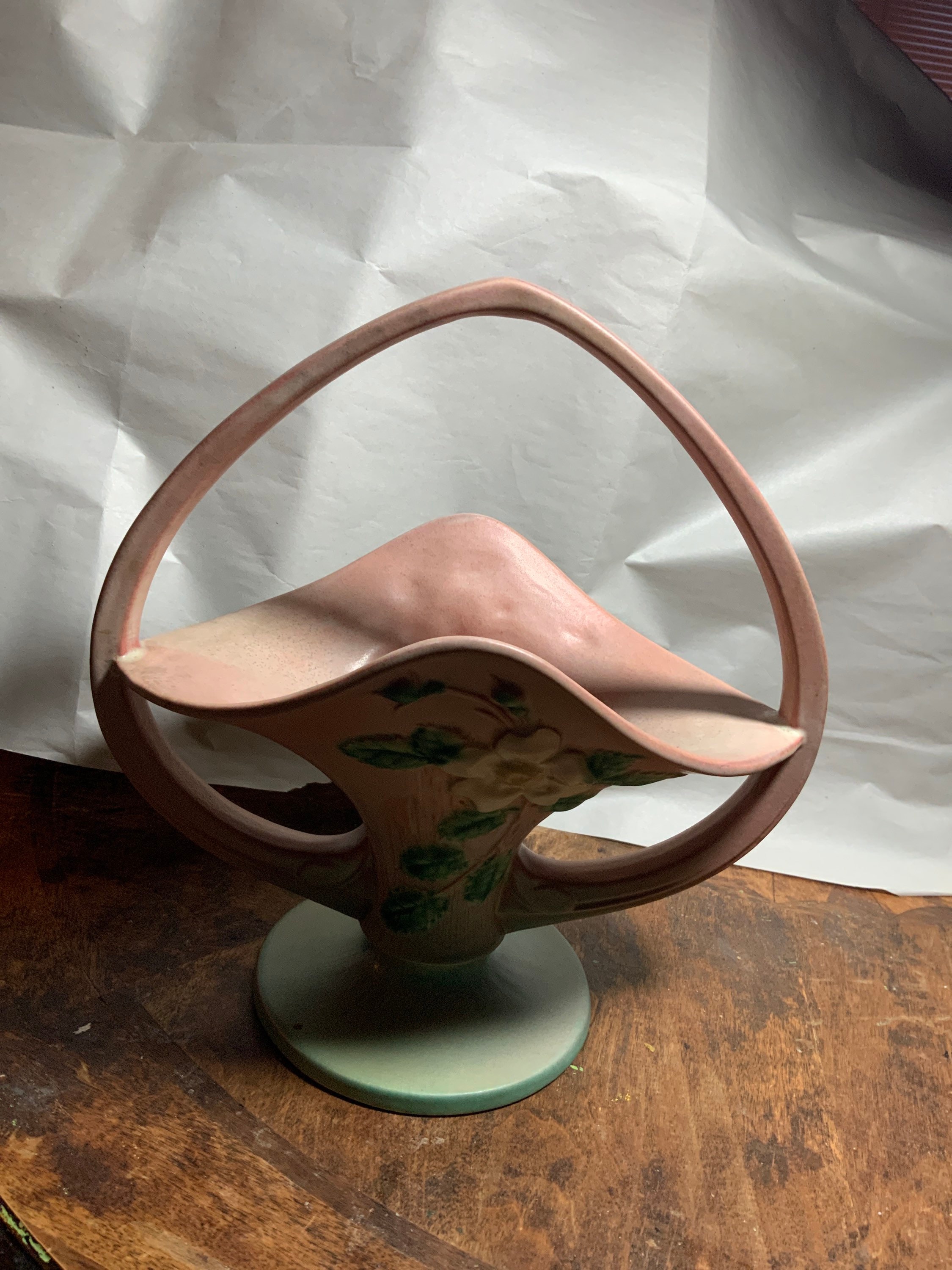raised albas creamy white & yellow center old rose, blossoms with blue-grey-green foliage and green leaves all on a blended background of pink with a greenish base; Art Deco sweeping handle drops below rim on each sides and half diamond above with great semi gloss glaze colors.