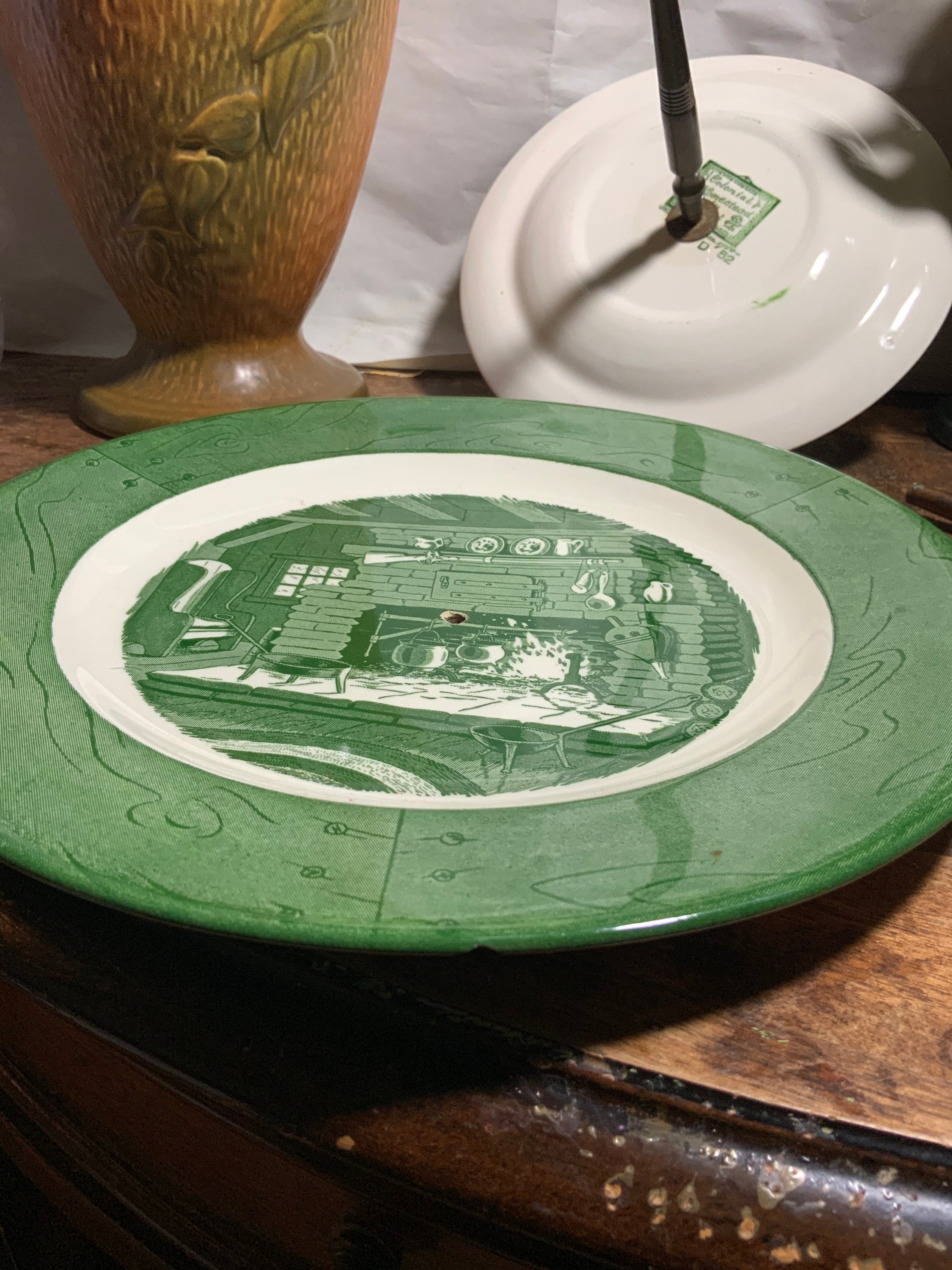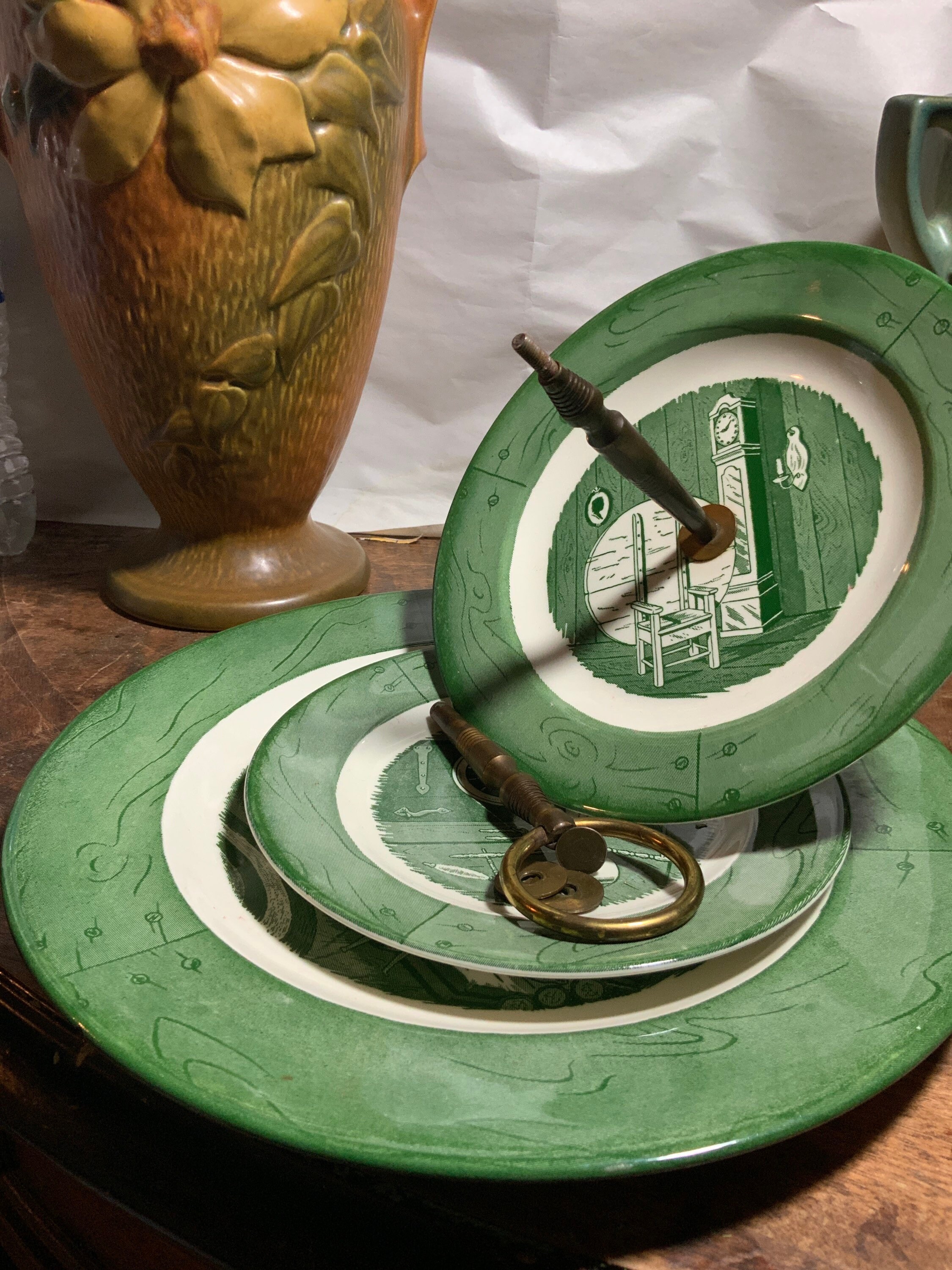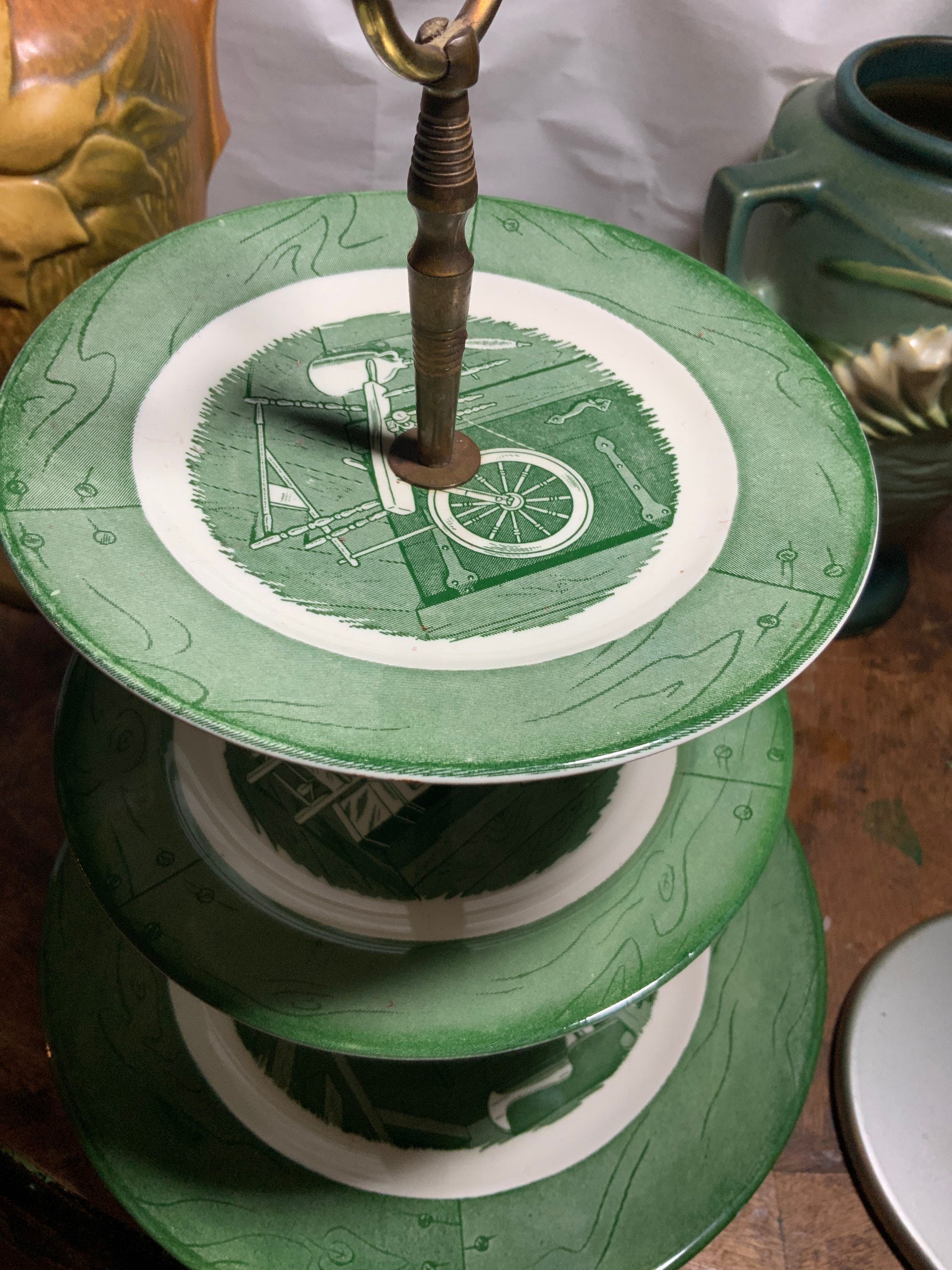 Listing is for only vintage 3 tier Colonial Homestead serving tray, for tidbit desert,fruits,vegetables,cheeses,egg rolls,sushi,meat satay serving dishes,great for hosting reception party ,such as wedding,Christmas,new year celebrations or even Buddhist Lunches. An American heirloom design beauty,excellent looks at home in anyone’s diner set,traditional or modern. Each tier was decorated with different scenery smart pine green, in detailed woodcut,patterns,authentic and original were applied under glossy glaze,that would be worn or washed off or faded ever. After many decades, the brass has aged,but each plate is still brilliant green color. Made in America by Royal China.
