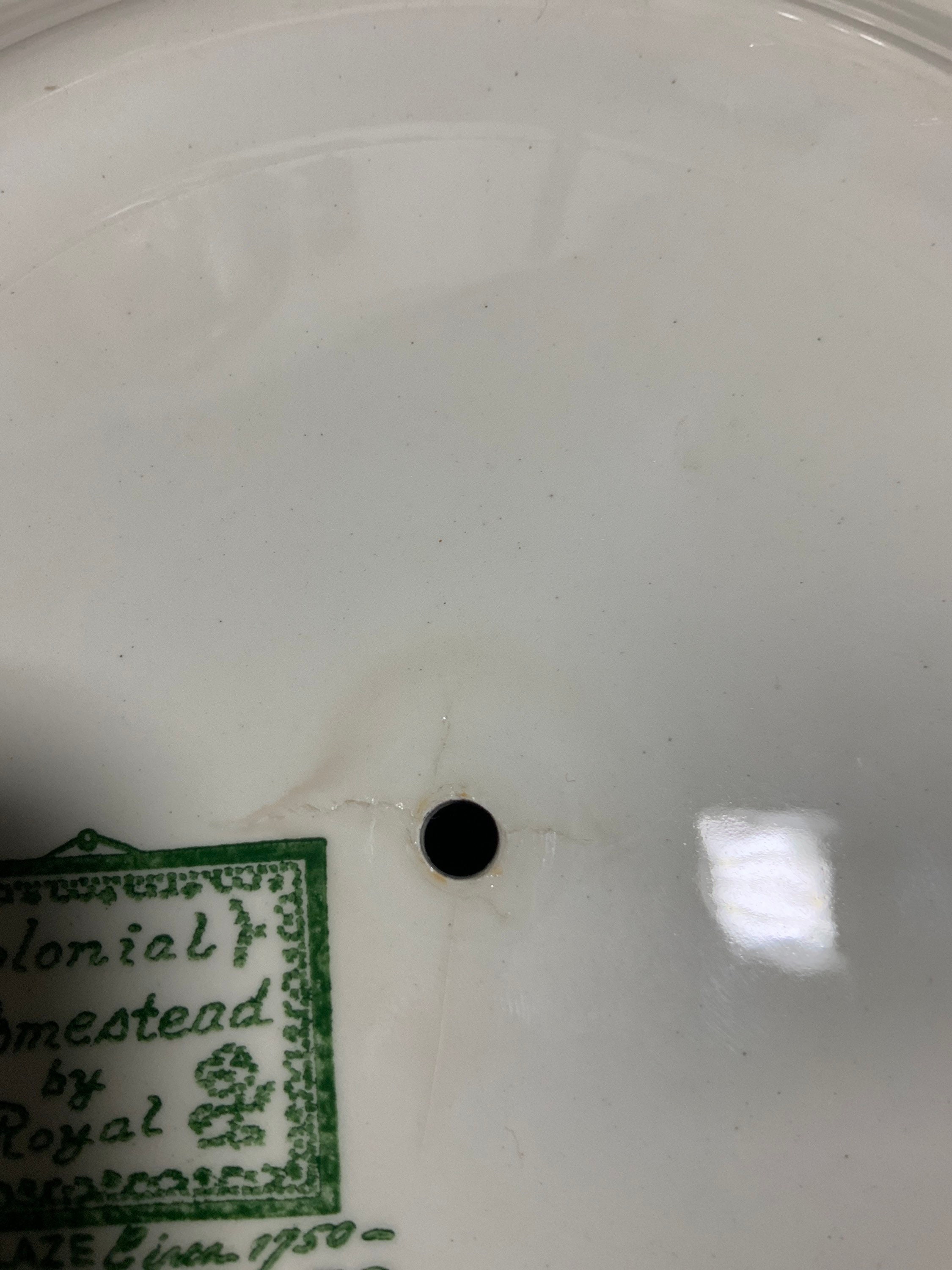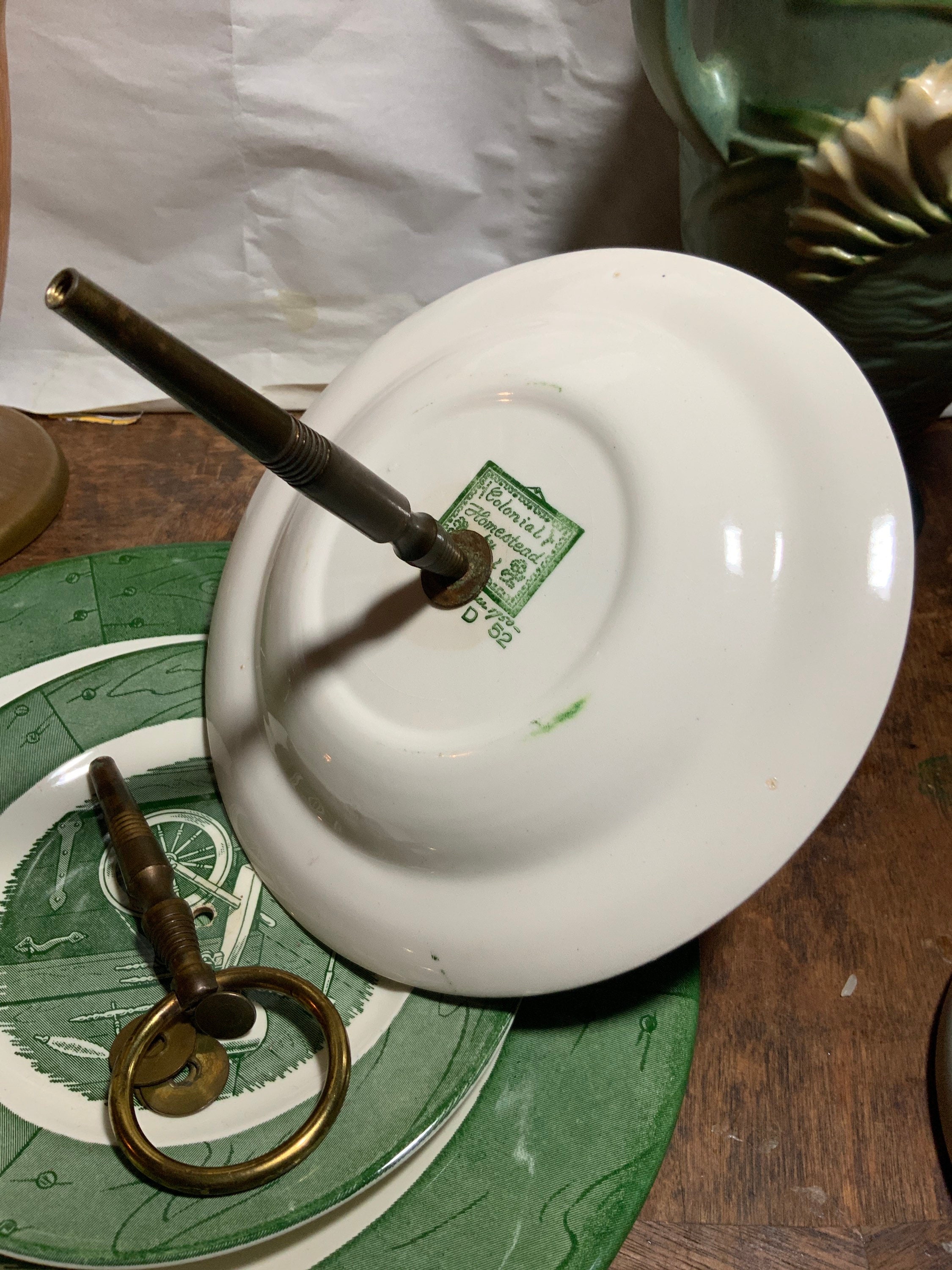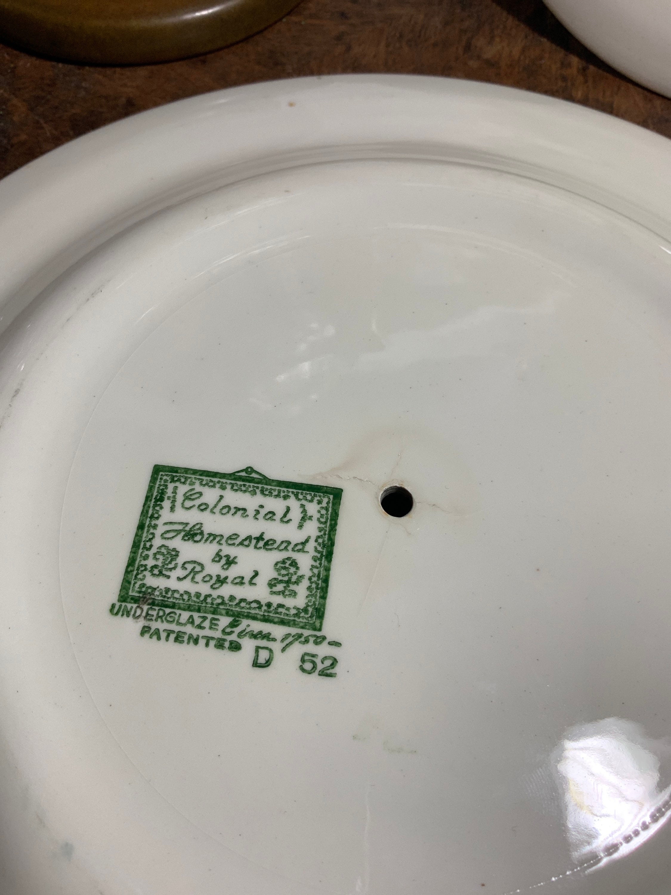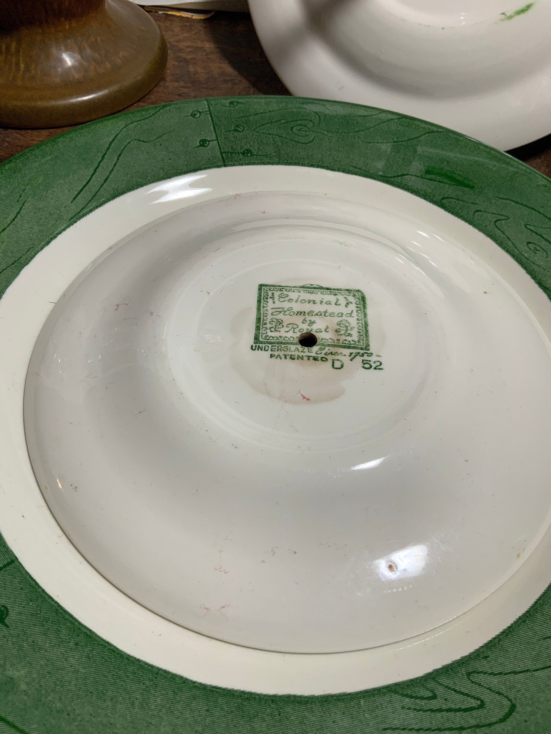 Listing is for only vintage 3 tier Colonial Homestead serving tray, for tidbit desert,fruits,vegetables,cheeses,egg rolls,sushi,meat satay serving dishes,great for hosting reception party ,such as wedding,Christmas,new year celebrations or even Buddhist Lunches. An American heirloom design beauty,excellent looks at home in anyone’s diner set,traditional or modern. Each tier was decorated with different scenery smart pine green, in detailed woodcut,patterns,authentic and original were applied under glossy glaze,that would be worn or washed off or faded ever. After many decades, the brass has aged,but each plate is still brilliant green color. Made in America by Royal China.