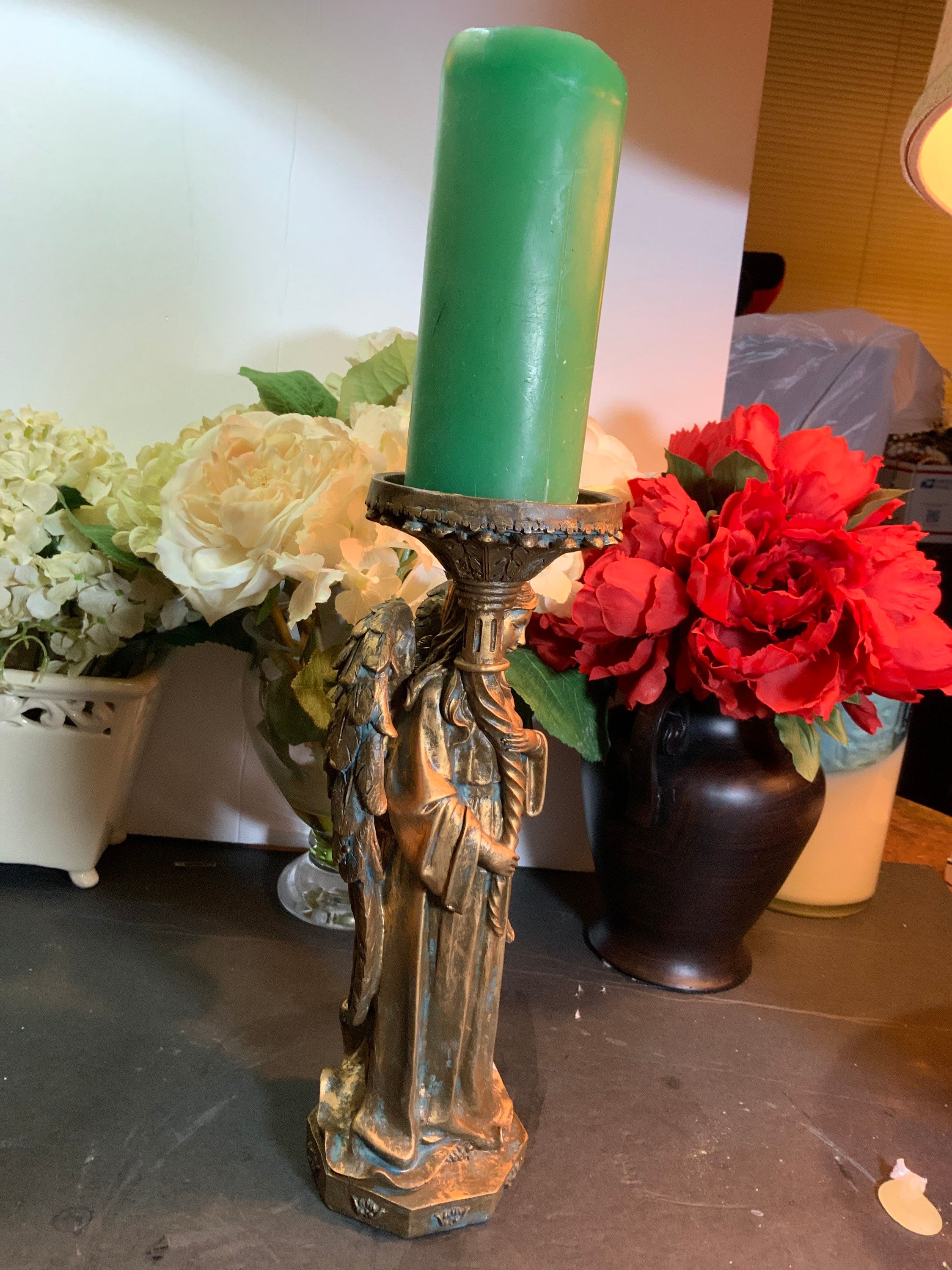 Listing is for one molded Sculptured polyresin mixed figurine statue(candle and surrounding objects are not included),portraying the Angel with beautiful antique gold-black encrustation,beautifully done,
